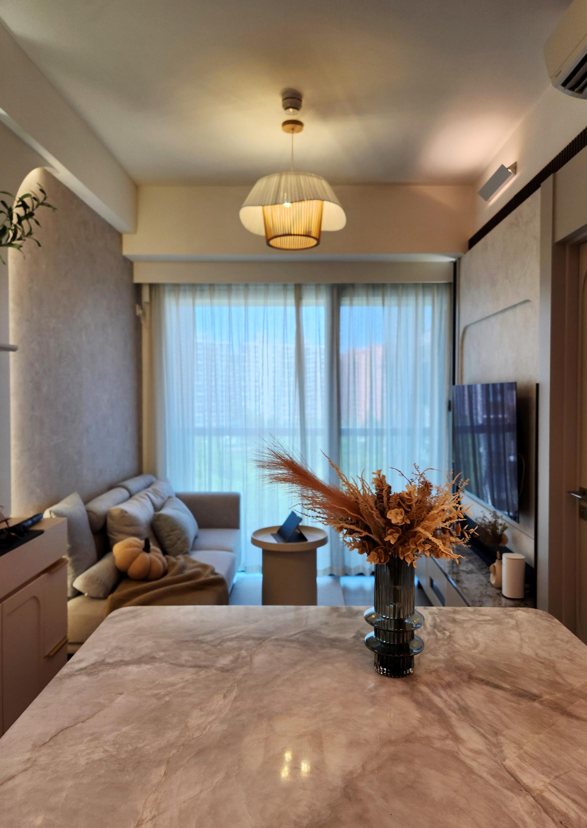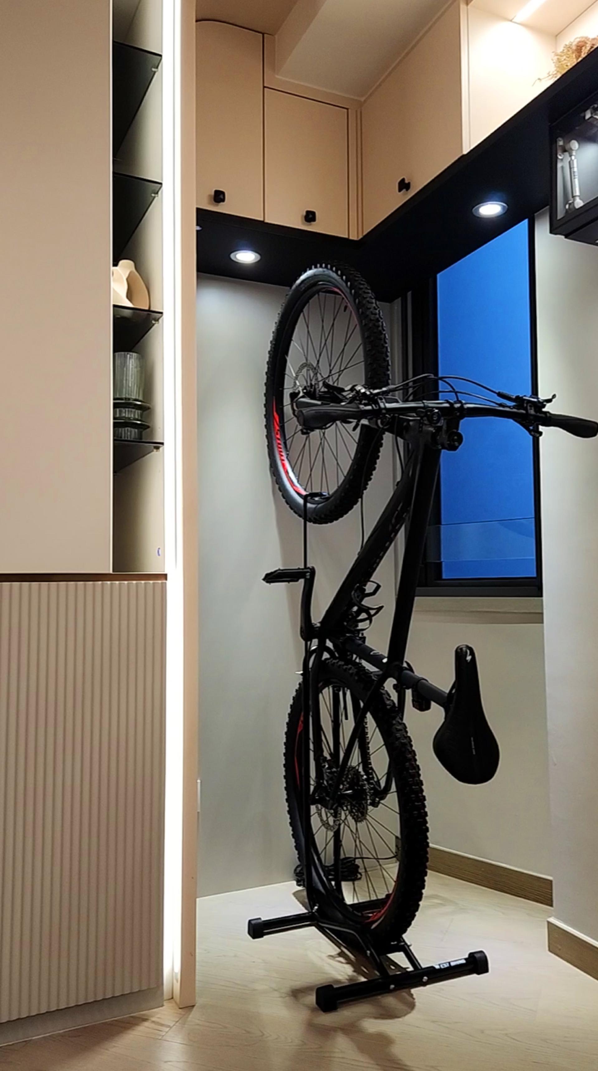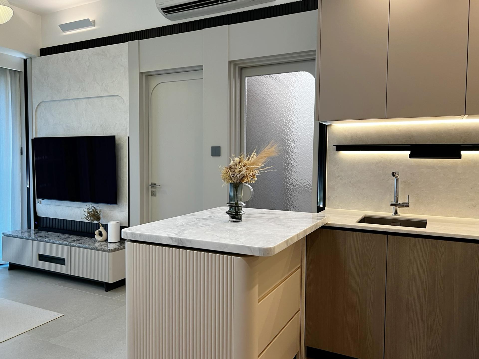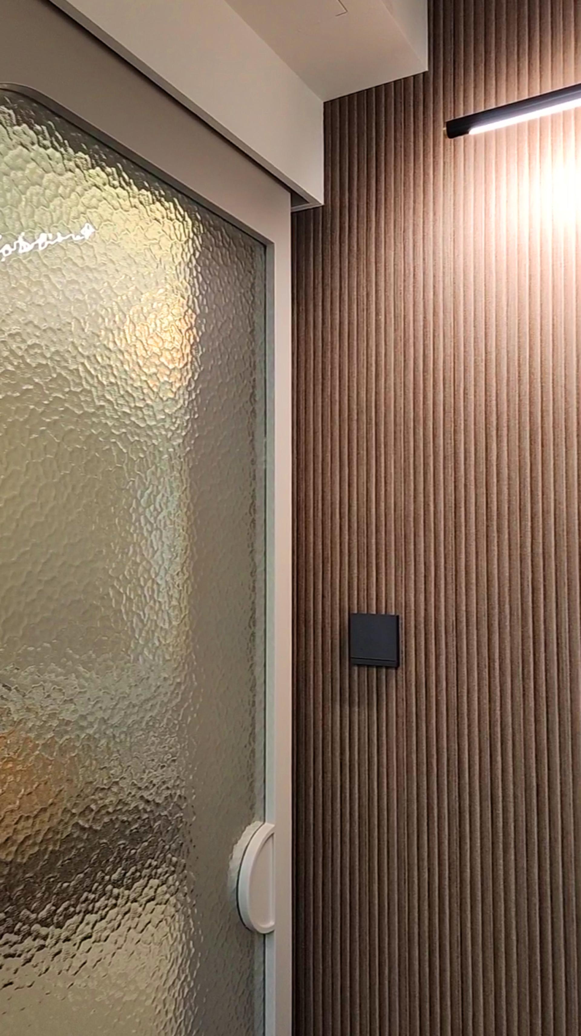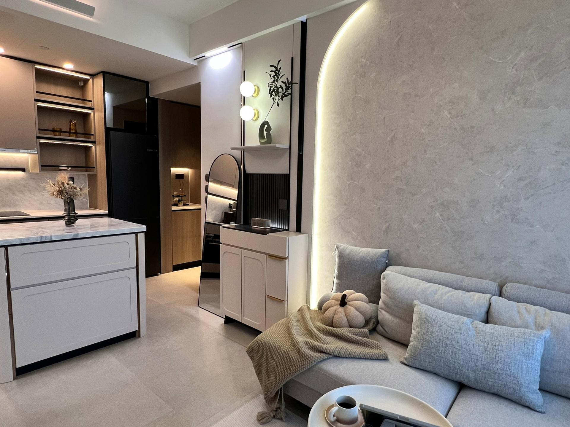 The study room's strategic conversion to a glass sliding system invites daylight to permeate the living area while amplifying its spatial perception through visual continuity. And the open kitchen features a central island that extends into a foldable dining table, accommodating dining needs for 4-6 people.The master bedroom design features glass cabinet doors with integrated ambient lighting inside the wardrobe, paired with minimalist decorative trim and sleek metallic handles to evoke a luxurious and sophisticated atmosphere.And the study room design with linen-striped wallpaper paired with wall-mounted lamps creates a soft and tranquil reading nook for evenings, while subtly incorporating the homeowner's passion for cycling into the design elements. Additionally, the compact room offers flexibility to later serve as either a guest bedroom or a children's room.