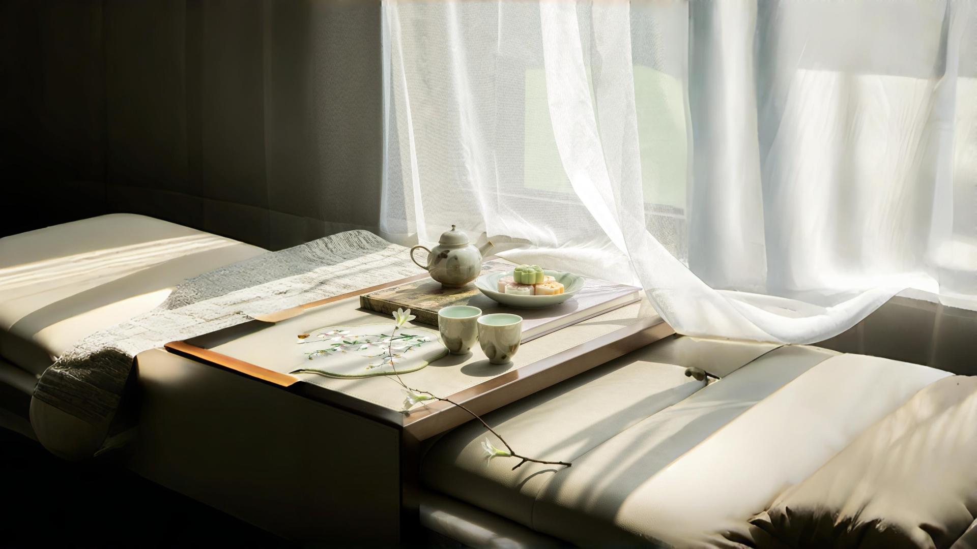 A touch-sensitive glass wall in the bathroom converts fingertip gestures into audiovisual responses—morning birdsong, evening rain—translating time into sensory interactions.