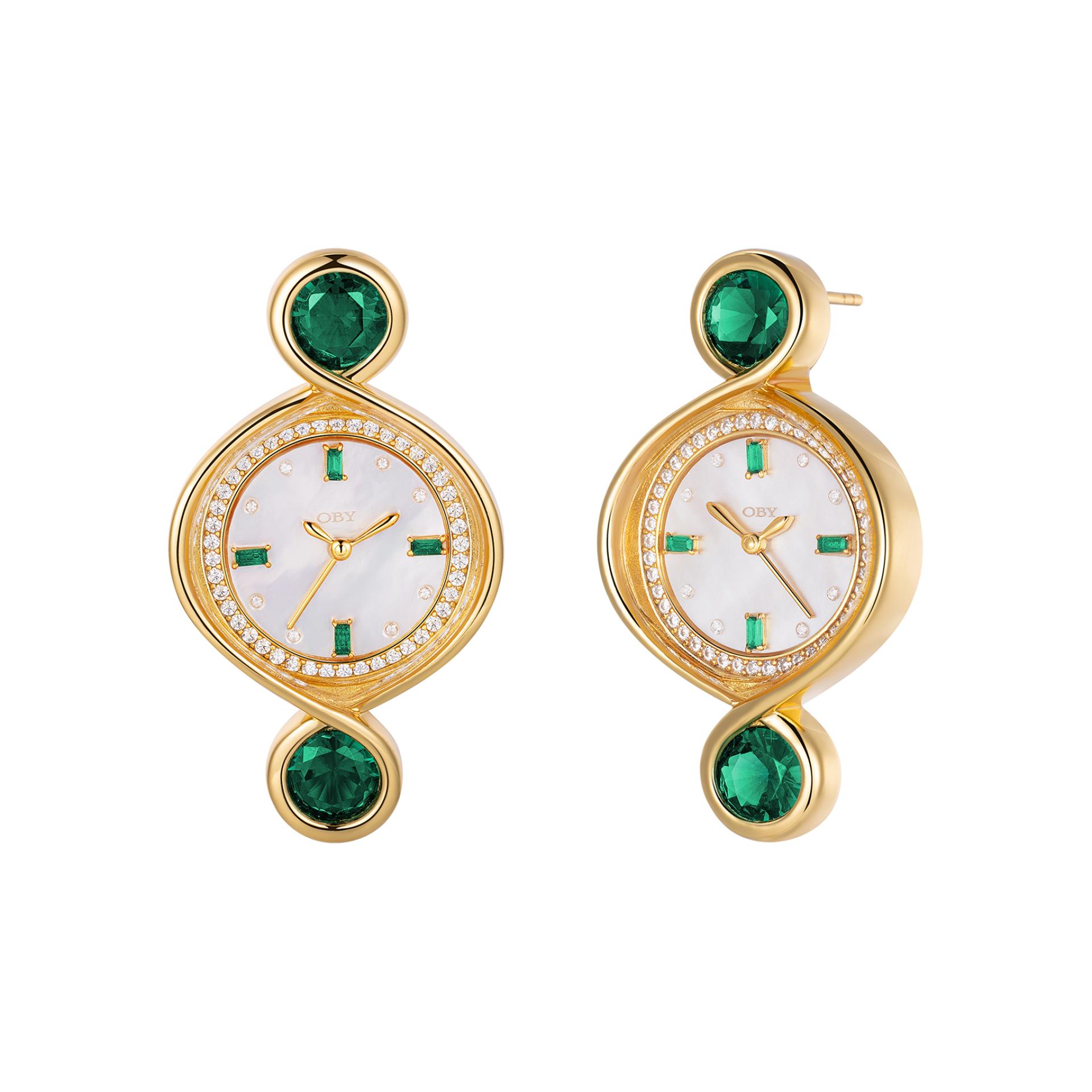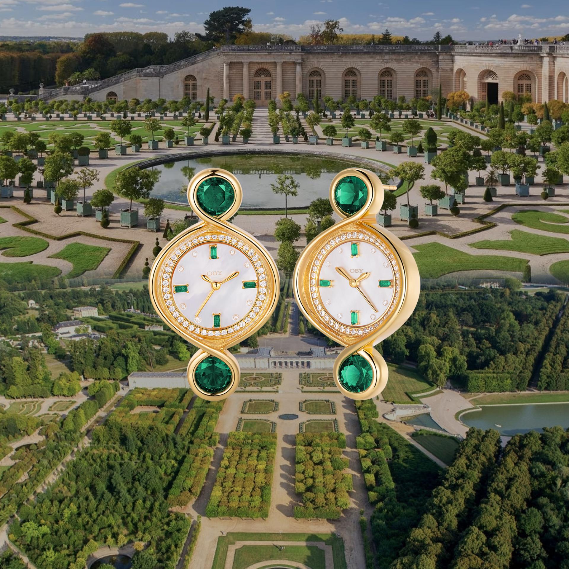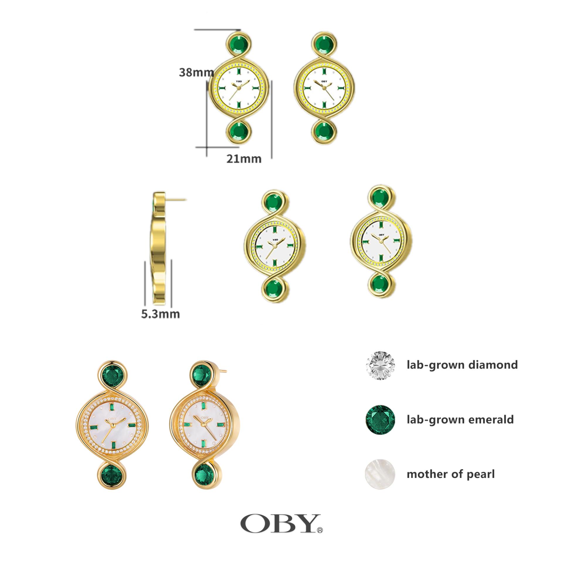 Inspired by the grandeur of Baroque architecture, the opulent gardens of Versailles, and the harmony of nature with modern craftsmanship, this earring is a masterpiece of timeless elegance. Graceful arcs, reminiscent of palace ornamentation, encircle a mesmerizing central clock face with a lustrous mother-of-pearl base—symbolizing women's enduring strength and nurturing essence. Vibrant, lab-grown emeralds evoke the richness of royal gardens, while sustainable diamonds add an ethereal brilliance, embodying responsible luxury. A tribute to French artistic heritage, this exquisite design empowers women to embrace elegance and eco-consciousness. Celebrated for its innovation and refinement, it earned the prestigious Gold Award at the French Design Awards, honoring its timeless beauty and commitment to sustainability.