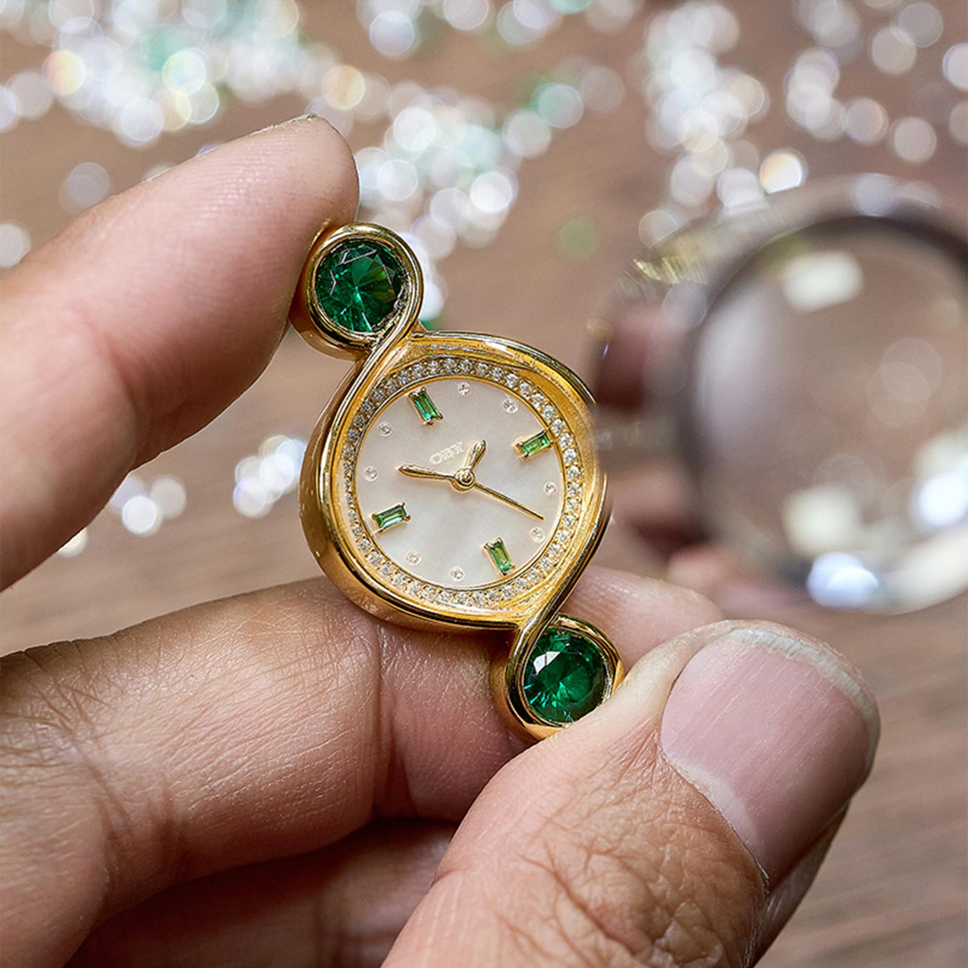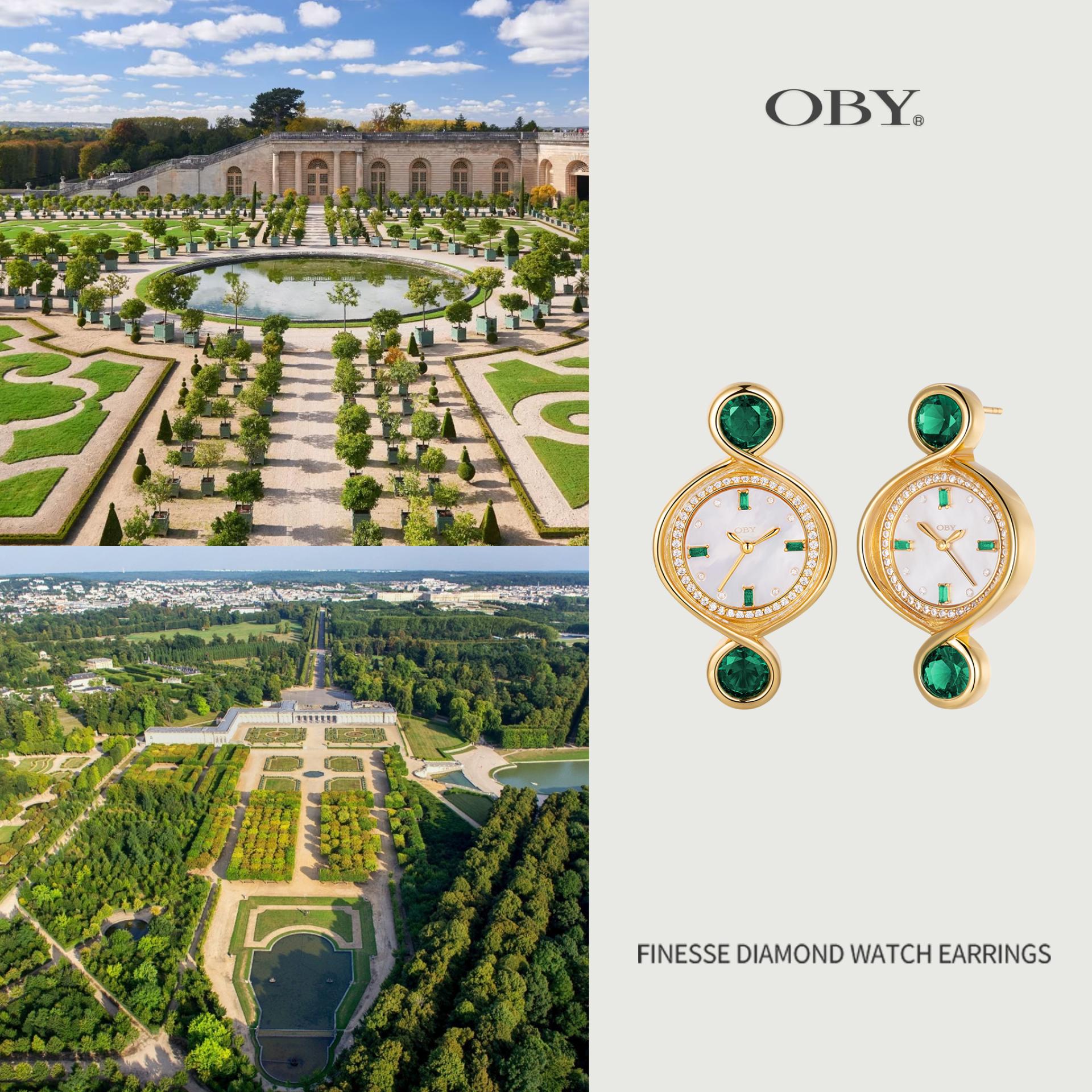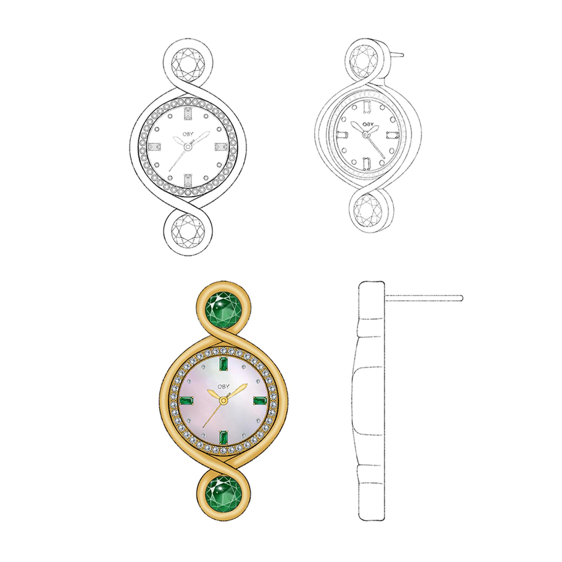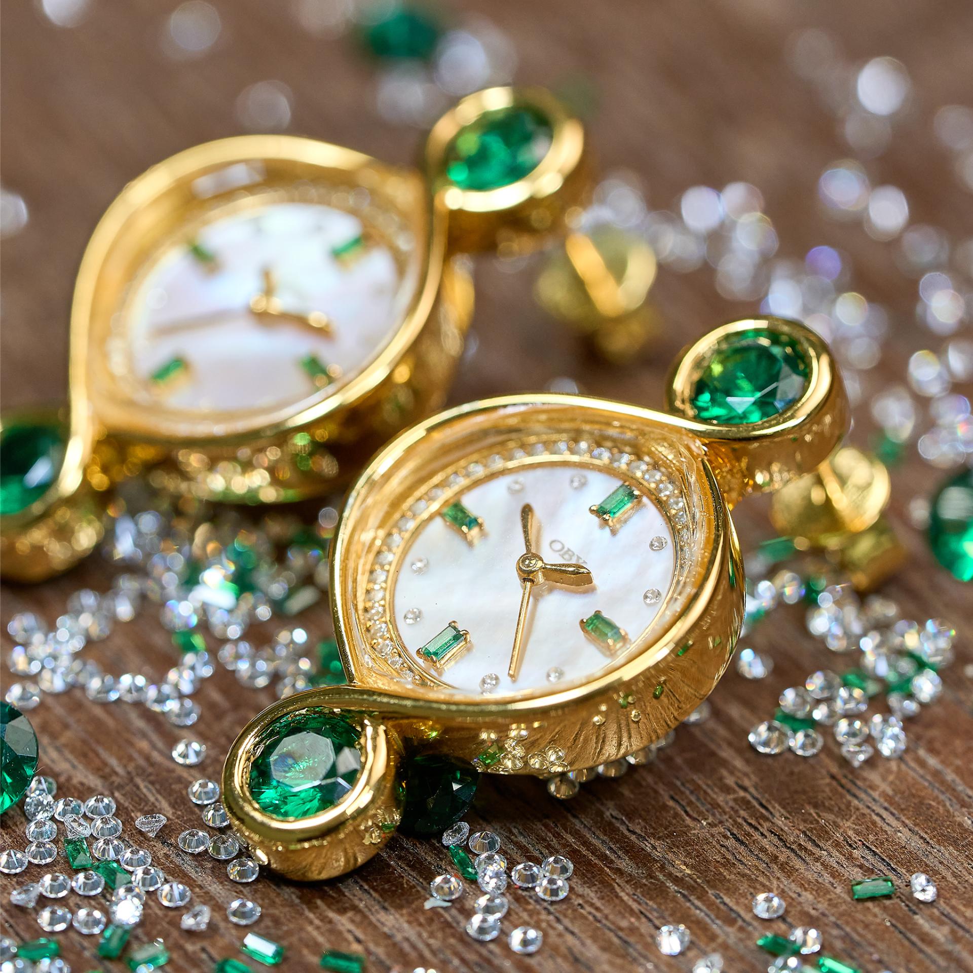 Inspired by the grandeur of Baroque architecture, the opulent gardens of Versailles, and the harmony of nature with modern craftsmanship, this earring is a masterpiece of timeless elegance. Graceful arcs, reminiscent of palace ornamentation, encircle a mesmerizing central clock face with a lustrous mother-of-pearl base—symbolizing women's enduring strength and nurturing essence. Vibrant, lab-grown emeralds evoke the richness of royal gardens, while sustainable diamonds add an ethereal brilliance, embodying responsible luxury. A tribute to French artistic heritage, this exquisite design empowers women to embrace elegance and eco-consciousness. Celebrated for its innovation and refinement, it earned the prestigious Gold Award at the French Design Awards, honoring its timeless beauty and commitment to sustainability.