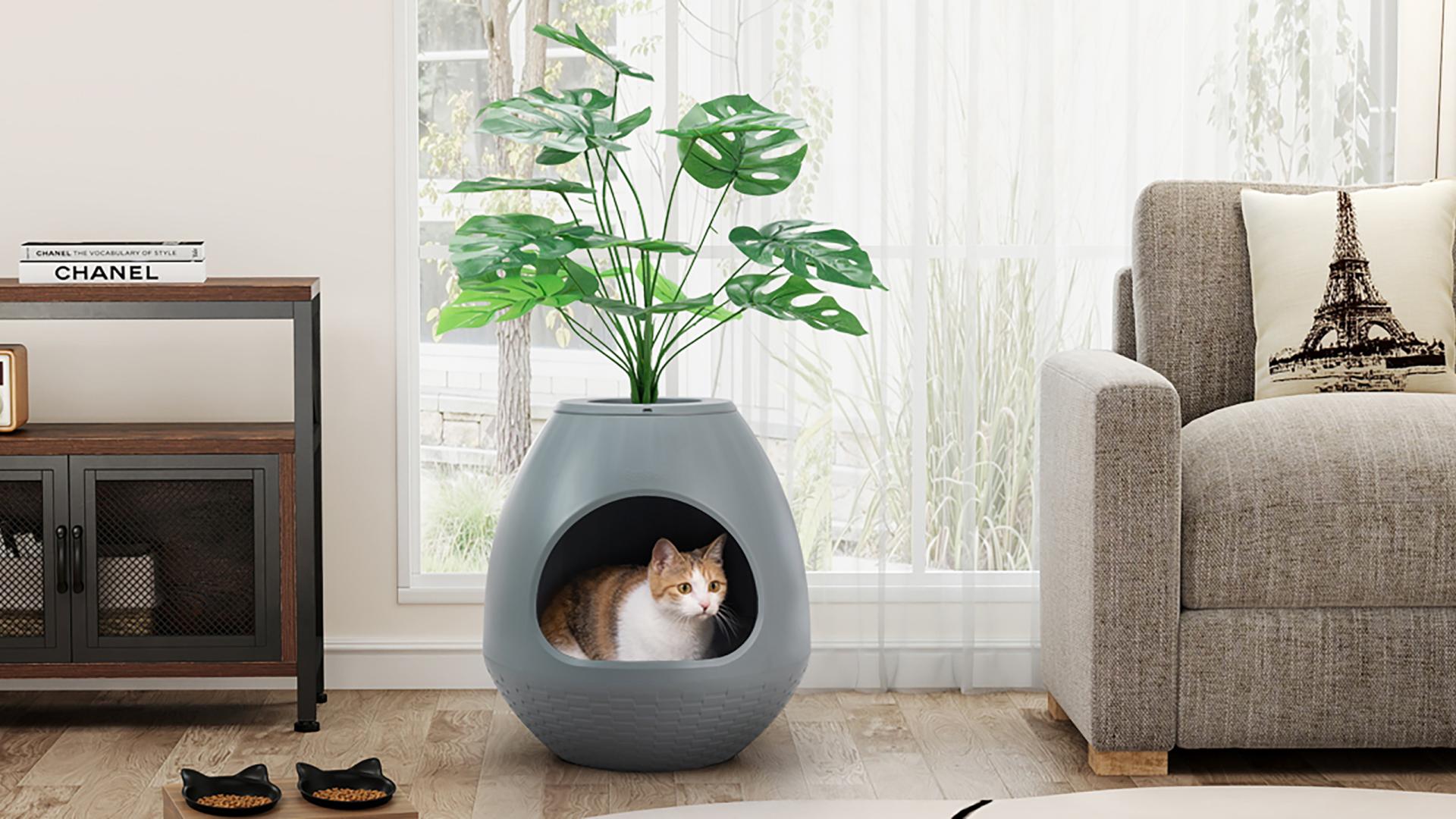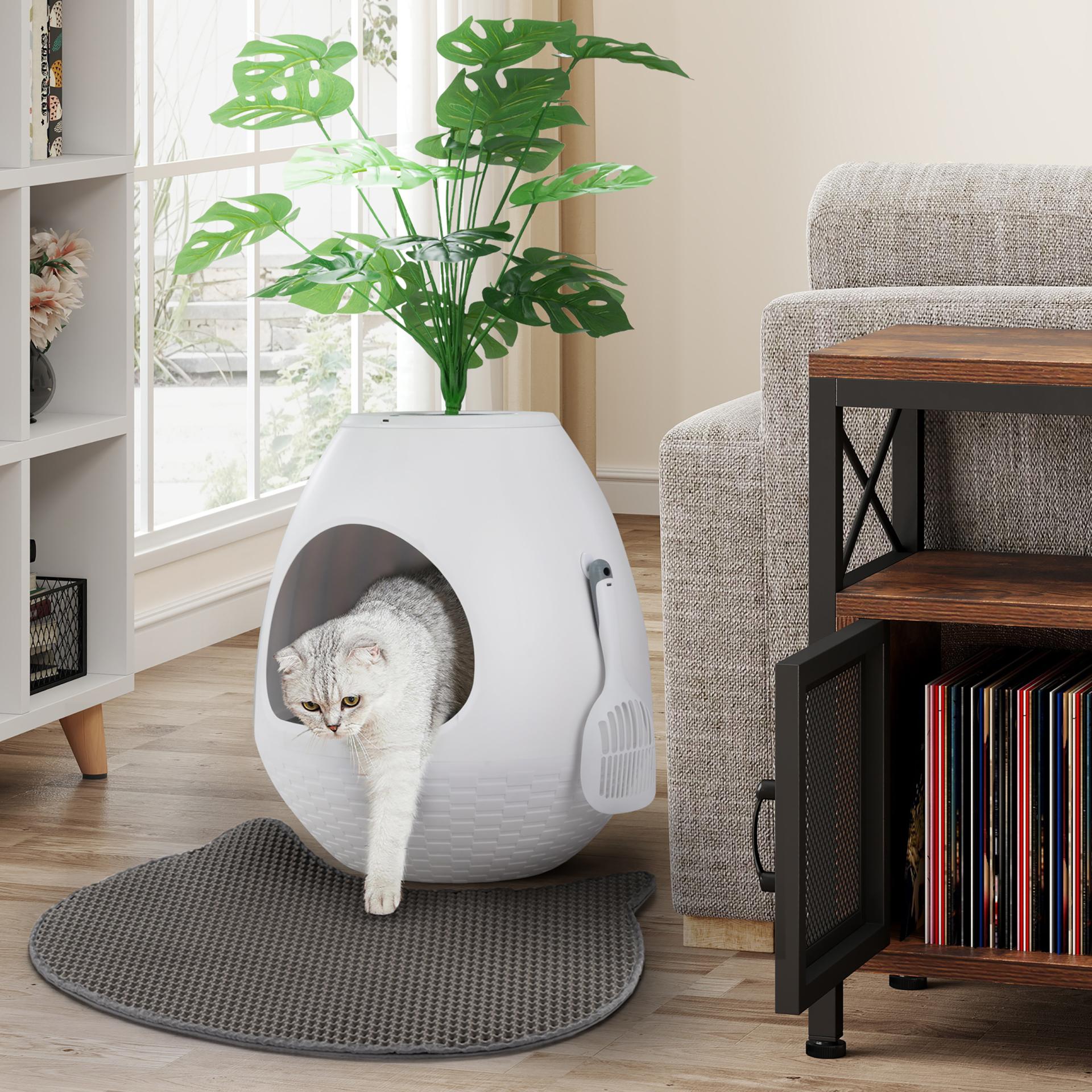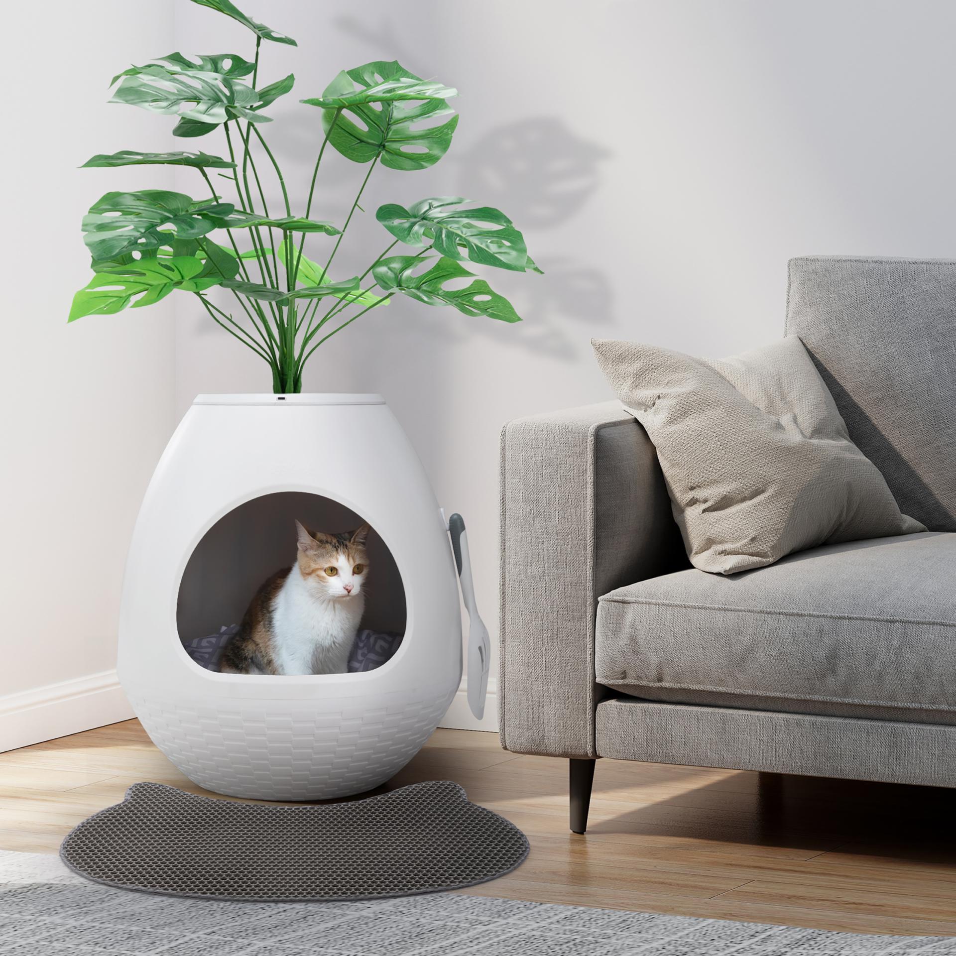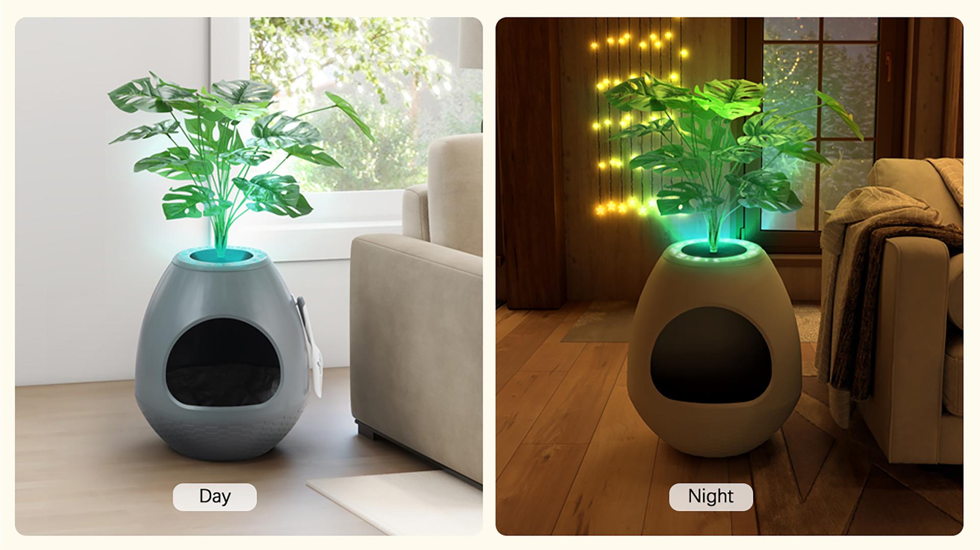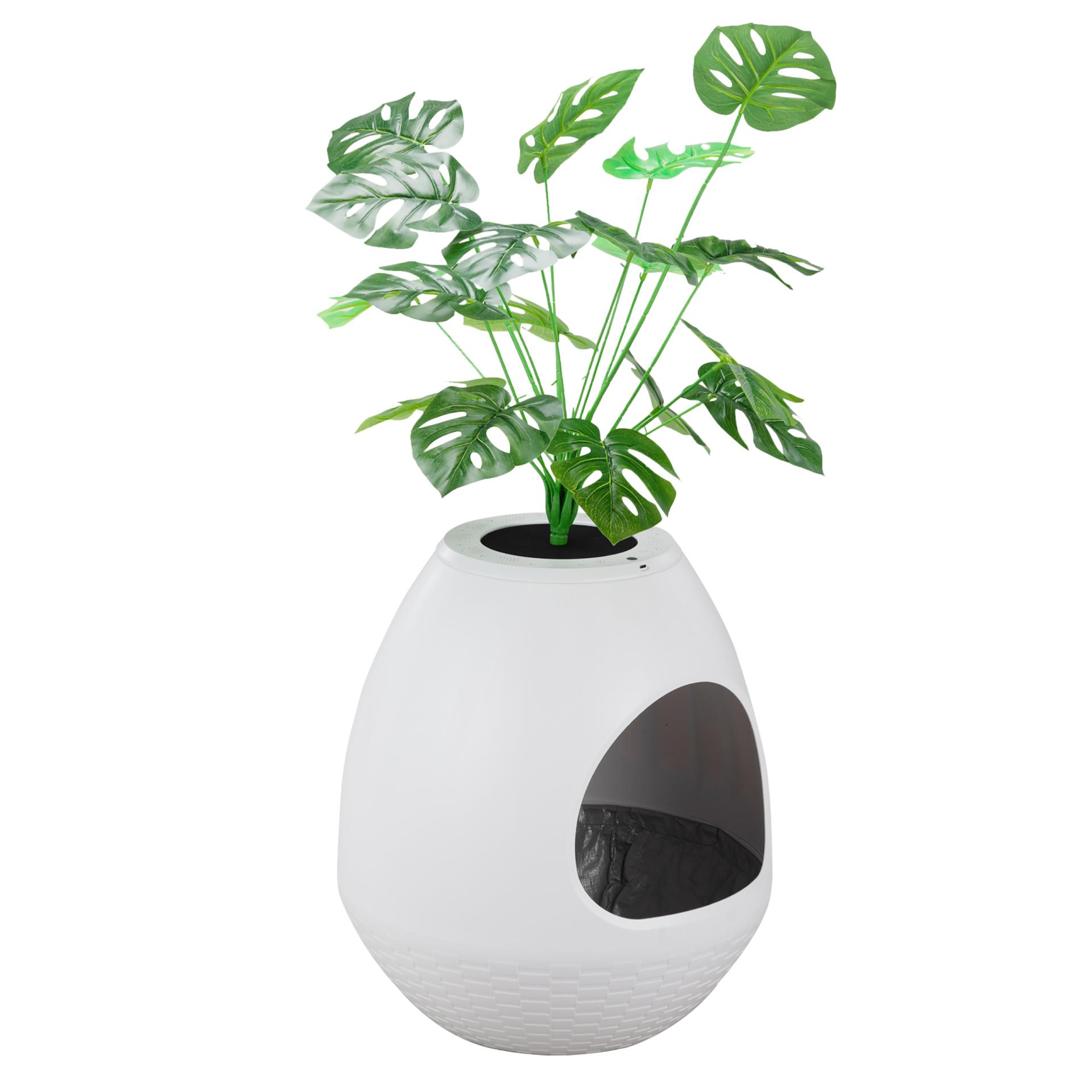 Eggloa6 Cat Litter Box innovatively combines the practicality of pet products with home aesthetics. Its egg-shaped exterior with smooth lines features biomimetic greenery at the top that simulates a natural environment. This allows cats to feel close to nature while using the toilet, thus reducing their sense of unfamiliarity and anxiety. Additionally, the biomimetic greenery breaks the monotony and homogeneity of similar products, making the litter box not just a practical pet product but a vibrant visual addition to indoor home decor.