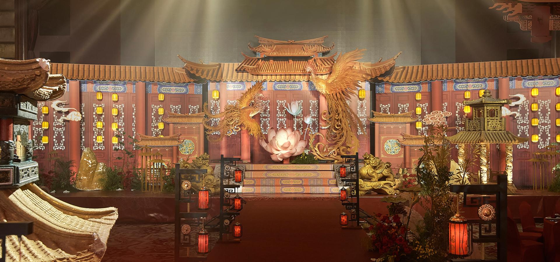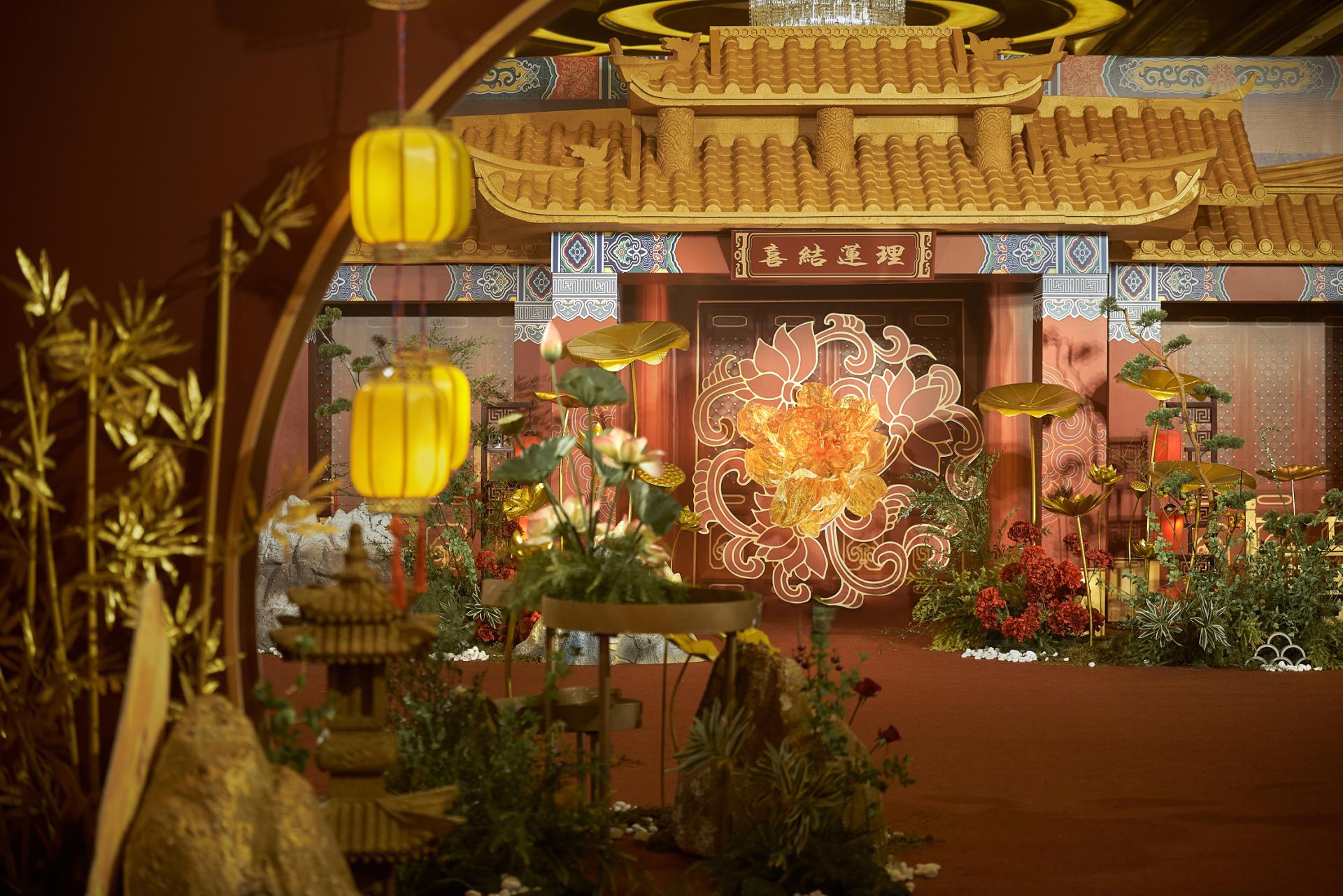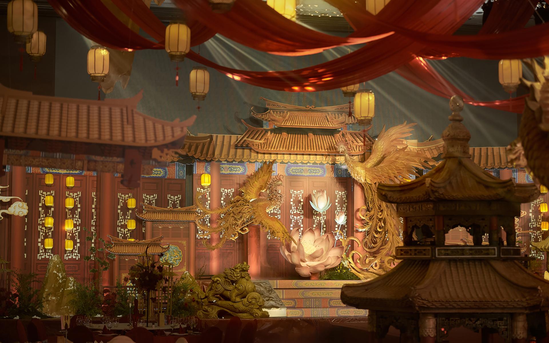 Classical elements from ancient Chinese architecture, such as the flying eaves, carved beams, painted rafters, and vermilion doors and windows are integrated into the wedding space in a well-arranged layout. Besides, patterns symbolizing Chinese classical aesthetics like the Treasure Flower Motif, Auspicious Dragon and Phoenix Texture, and Prosperous Peony Design are incorporated into every detail. These elements and patterns run from the stage backdrop to the sides of the aisle, enhancing the visual appeal of the space from multiple angles and infusing the wedding venue with a strong Chinese-style festive vibe.