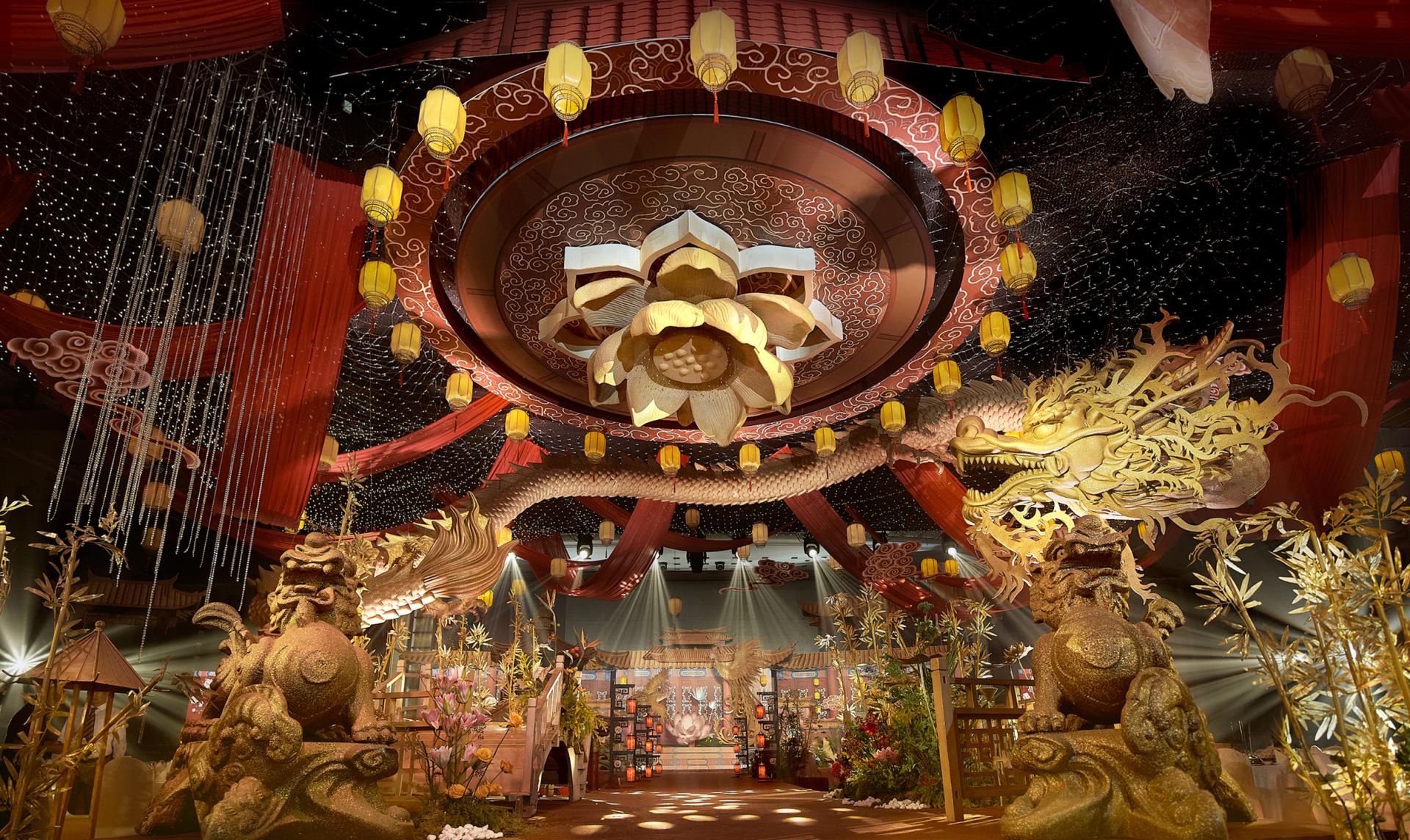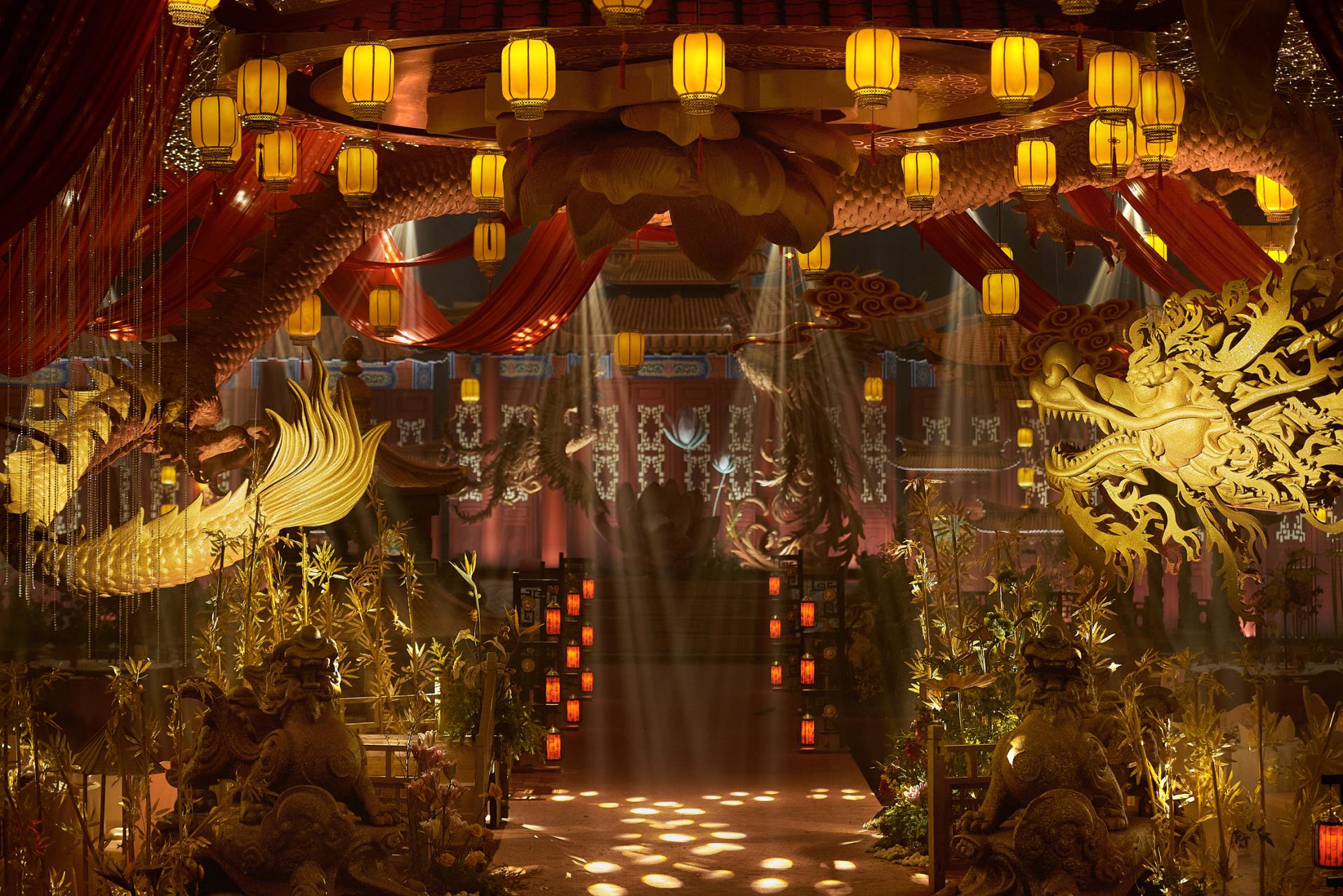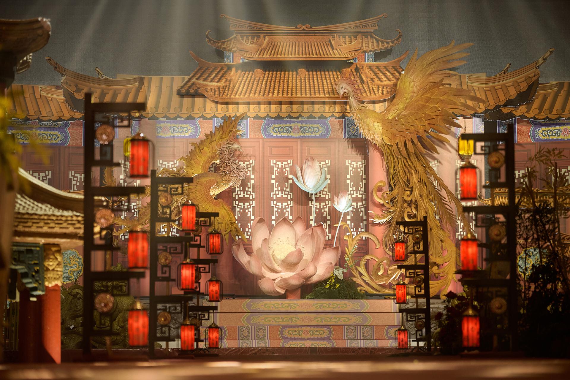 Classical elements from ancient Chinese architecture, such as the flying eaves, carved beams, painted rafters, and vermilion doors and windows are integrated into the wedding space in a well-arranged layout. Besides, patterns symbolizing Chinese classical aesthetics like the Treasure Flower Motif, Auspicious Dragon and Phoenix Texture, and Prosperous Peony Design are incorporated into every detail. These elements and patterns run from the stage backdrop to the sides of the aisle, enhancing the visual appeal of the space from multiple angles and infusing the wedding venue with a strong Chinese-style festive vibe.