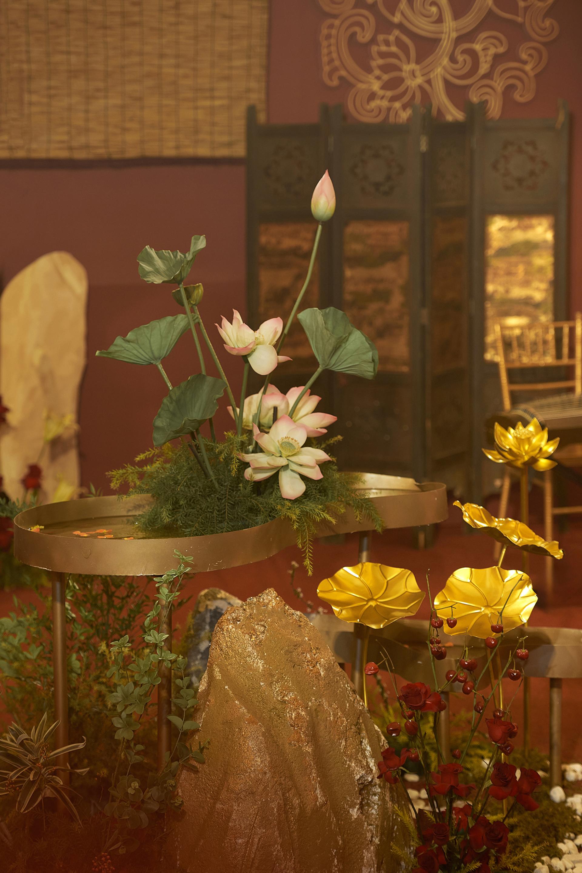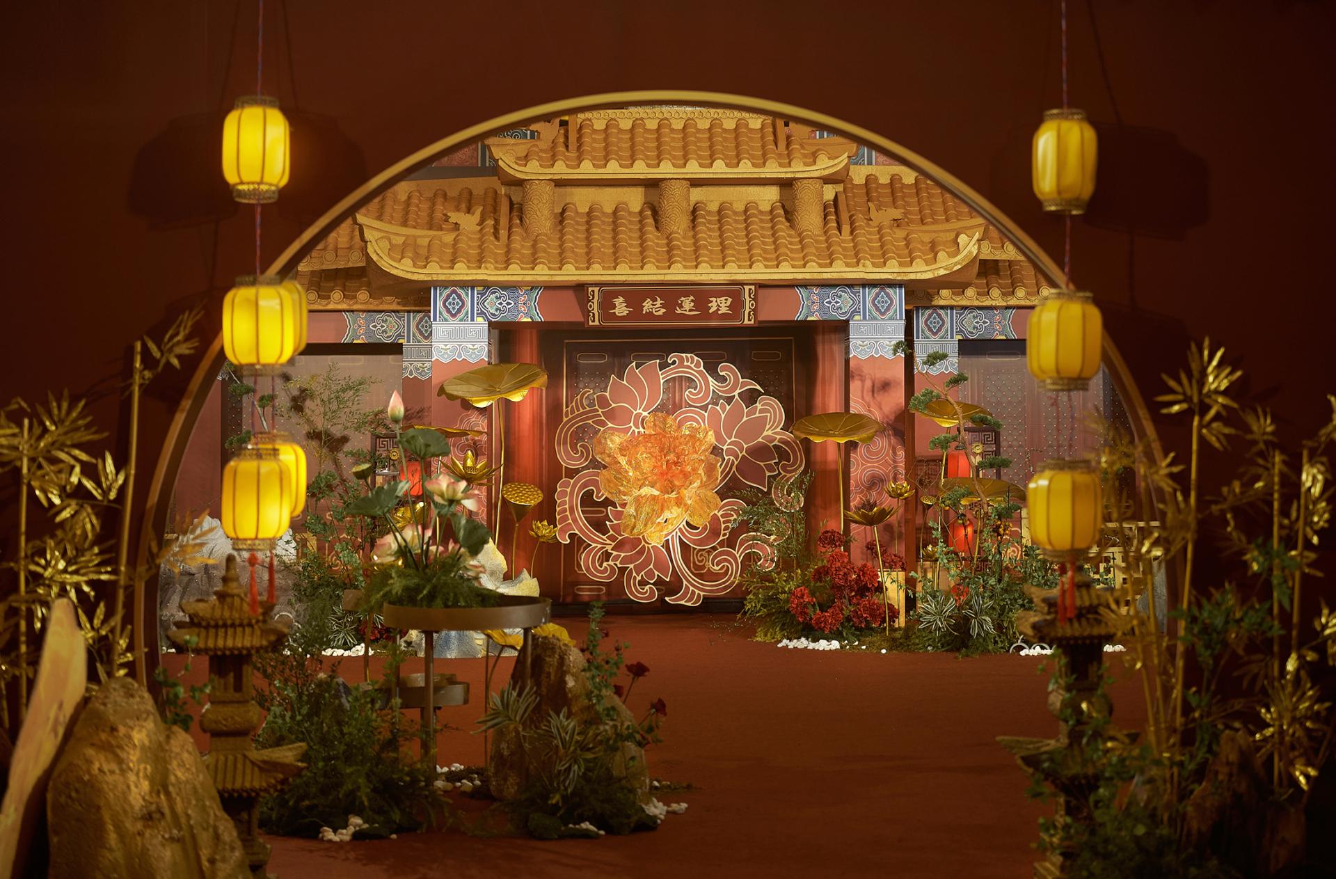 The ingenious use of the moon gate marks the highlight of the wedding space. It divides the long aisle into sections that are independent yet interconnected, with its unique framed view that adds layers and depth to the space, allowing everyone in the scene to continuously discover new visual focal points. Complemented by soft lighting, exquisite decorations, and appropriate greenery, this wedding venue becomes a perfect space that is both solemn and tender.