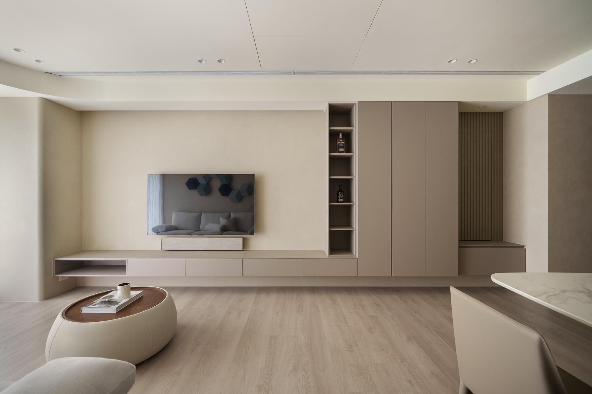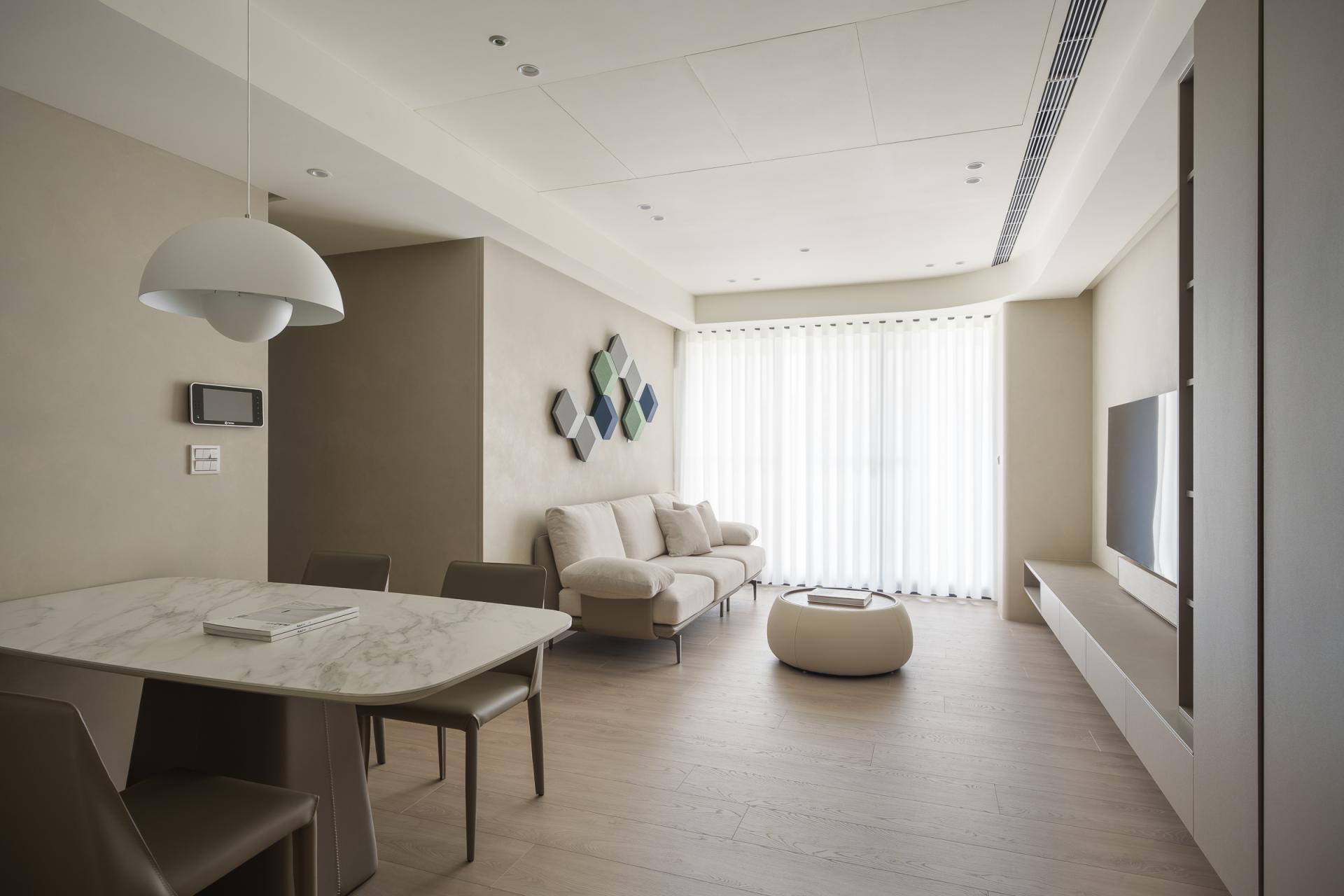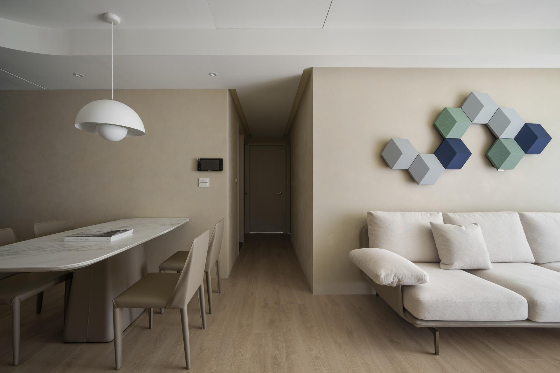 From the very beginning of the design process, the designer employed gentle off-white tones and bright natural light to paint a sweet picture of a family of four cozily nestled together. The curved corners in the living room were created to provide a safe play area for the children. Entering the dining area, extended indirect lighting softly envelops the moments of daily meals. The low-saturation color palette not only accompanies the family but also listens to all weariness, dissolving into the space as smoothly as cream. Every corner of the home blends comfort and beauty in everyday life.