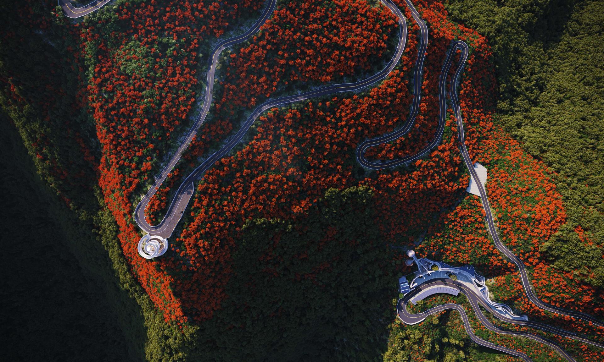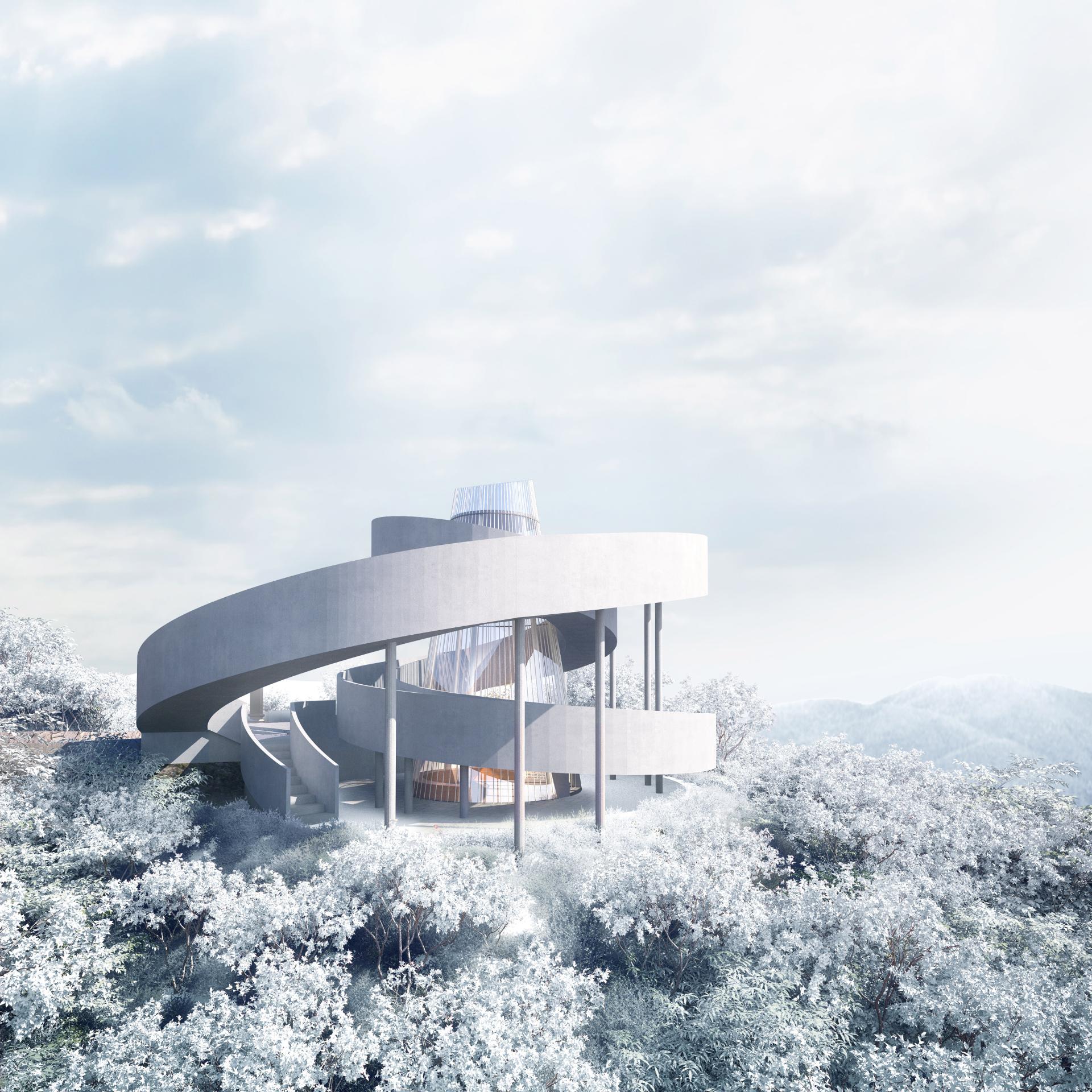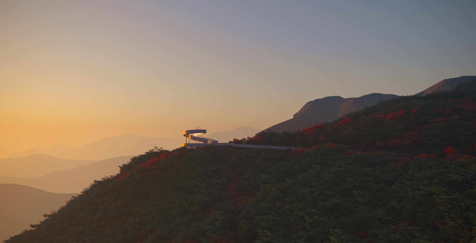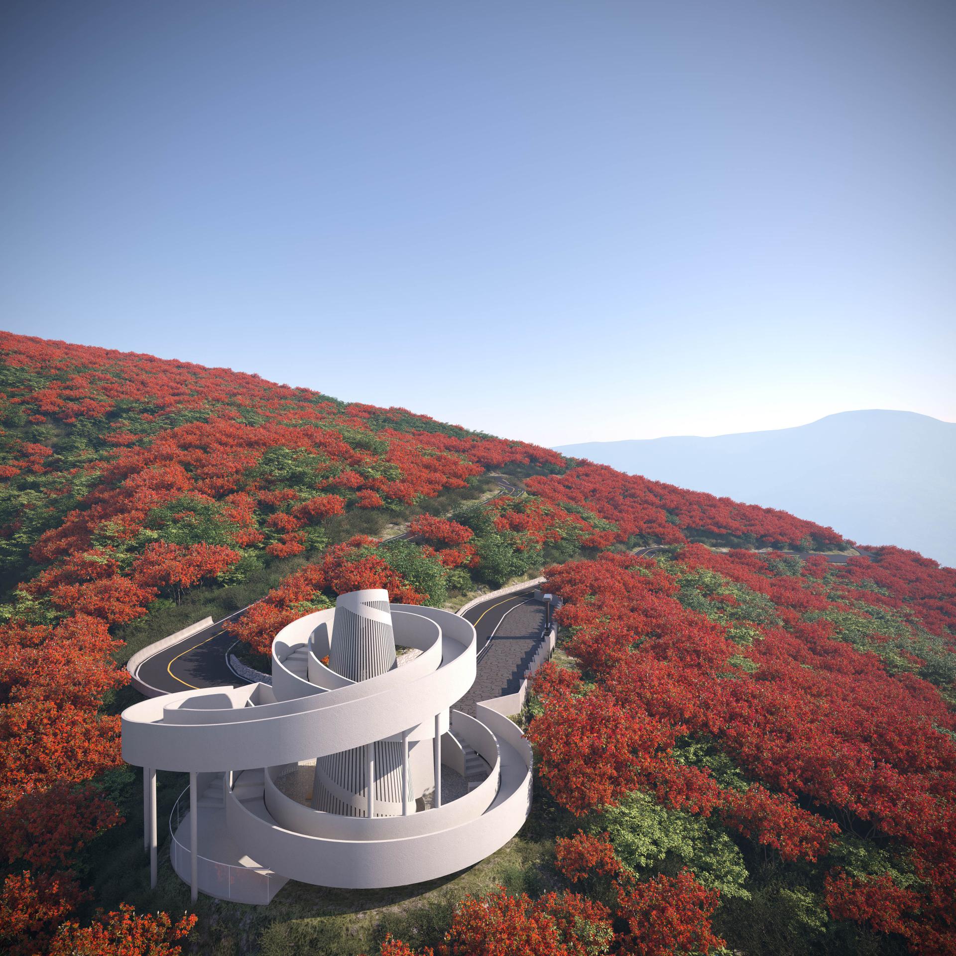 Cloudscraper Outlook reimagines the dialogue between an existing observation platform and its rugged context. By meticulously calibrating the gradient, radius, and anchoring points of a helical walkway, the design orchestrates a symbiotic relationship with the mountain's undulating topography. The spiral form appears to both emerge from and dissolve into the azalea-covered cliffs, framing a dynamic spatial experience that oscillates between human engineering and wild florascape.