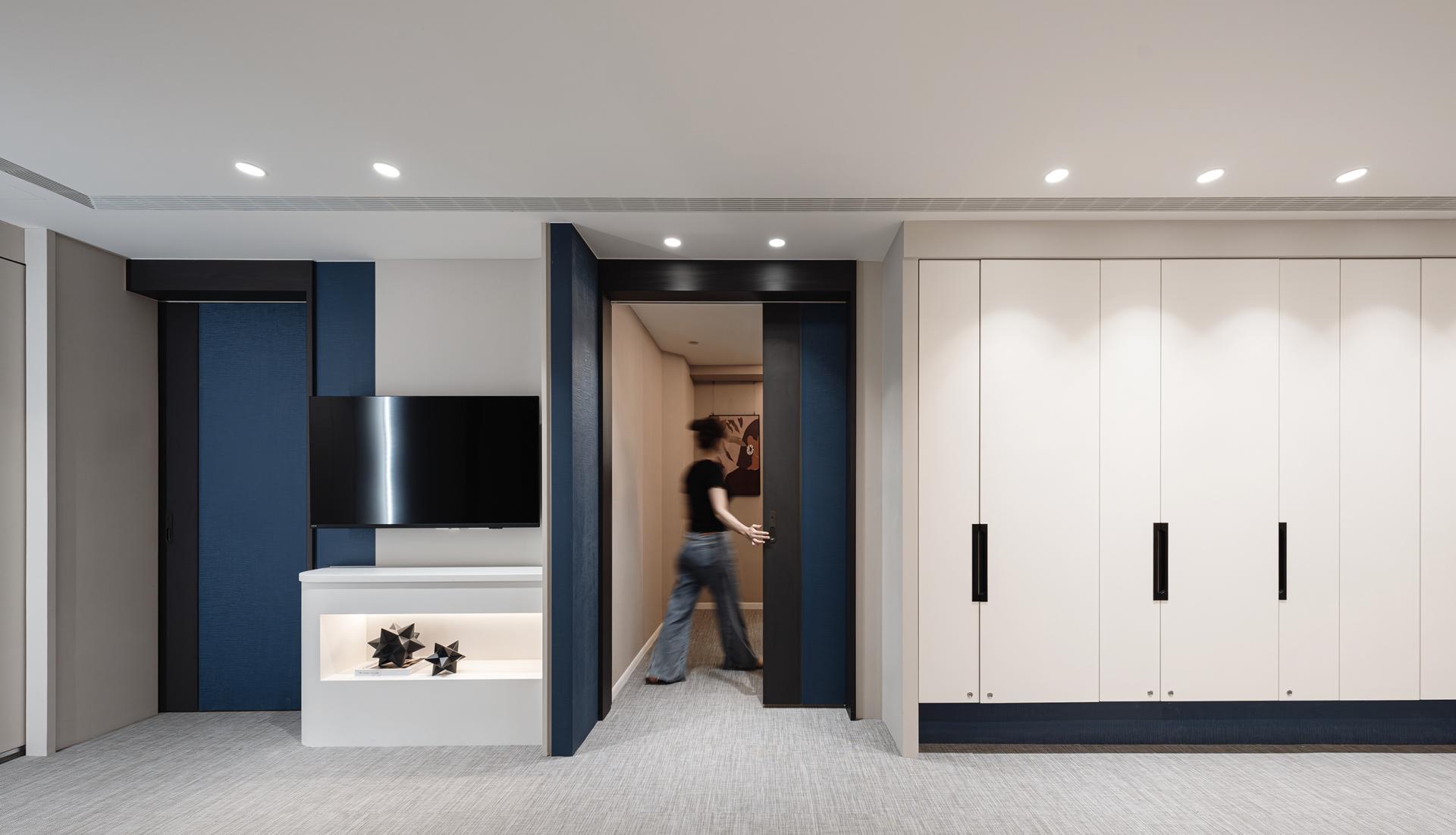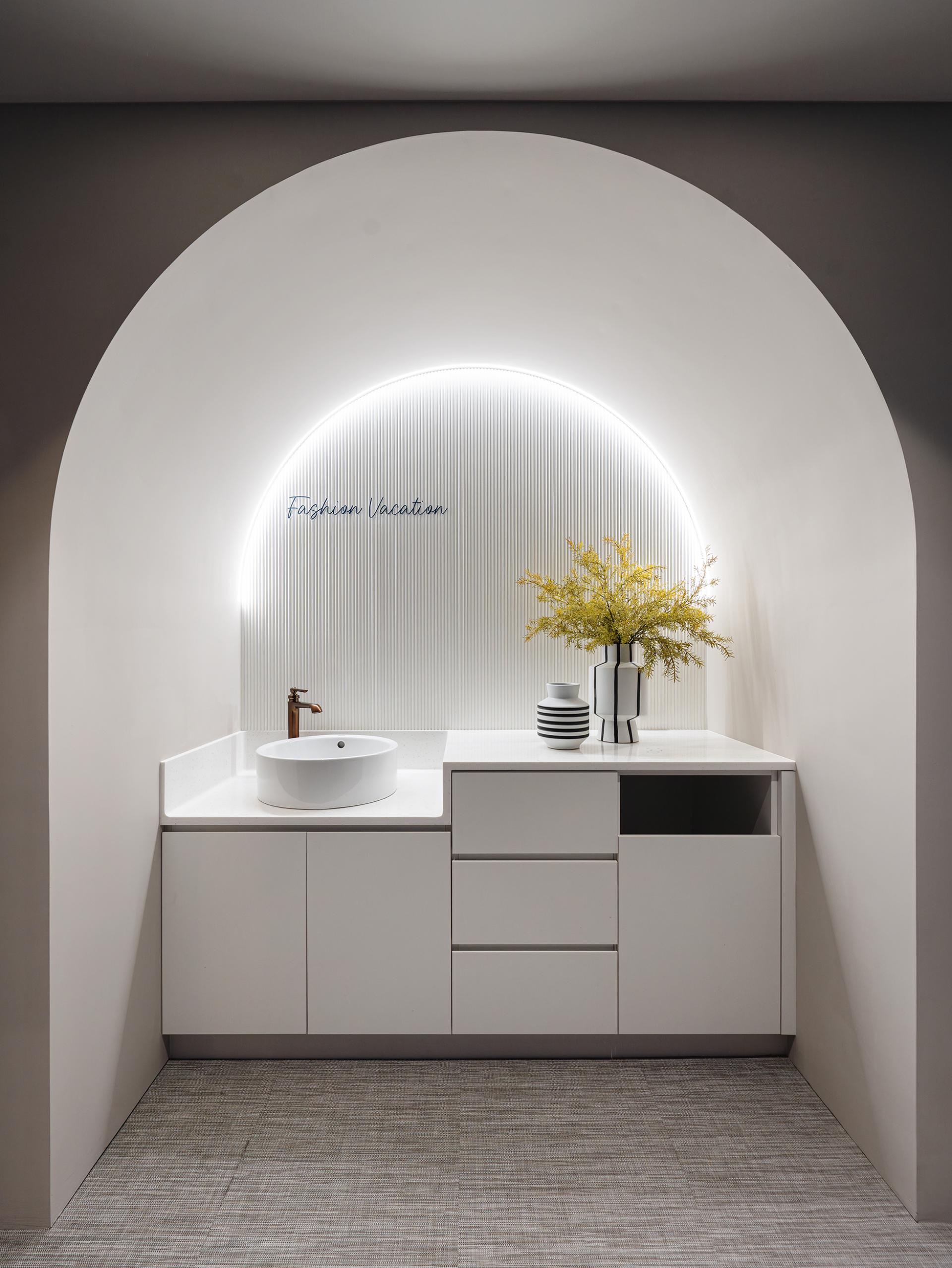 The concept of "Ring of Genes" is integrated into the space through curved archways, walkways, and wall treatments, creating fluid circulation and continuous visual harmony. Every movement through the area reveals the refined and gentle details, achieved through the interplay of multiple materials and dynamic lines. Metal panels and glass partitions lend a futuristic vibe, while lacquered finishes and quartz countertops add a touch of high-end sophistication.