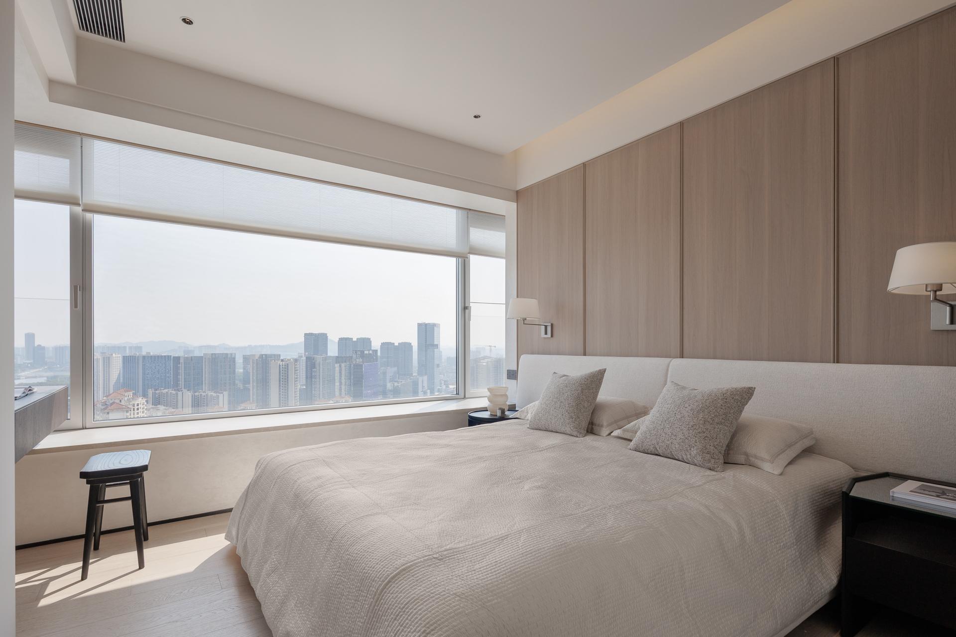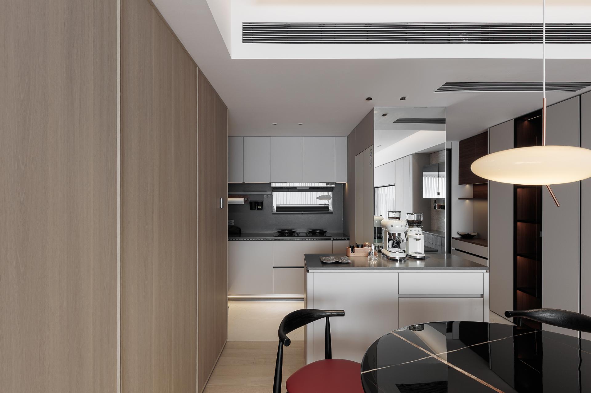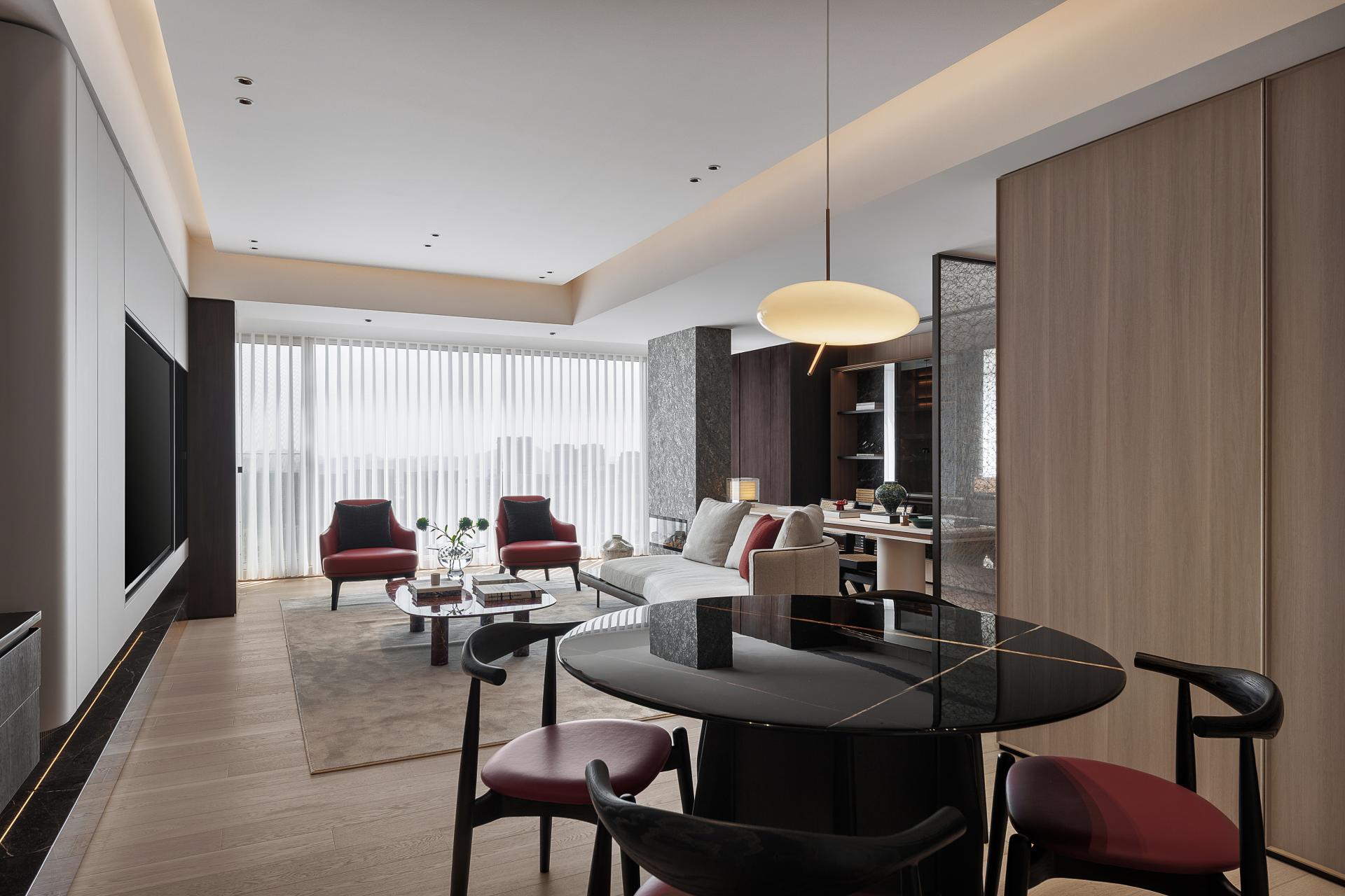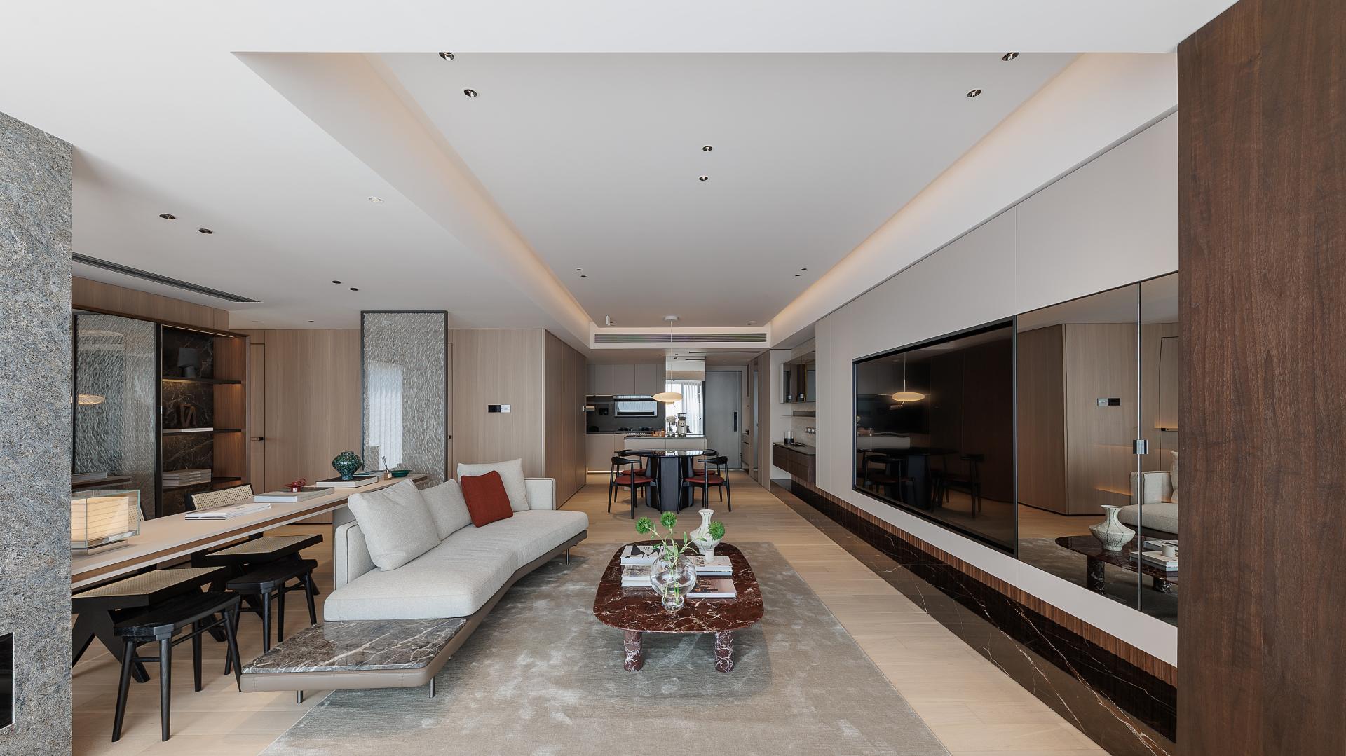 The LDK open-plan concept is achieved by removing partitions and incorporating the balcony, forming a seamless flow between living, dining, and kitchen areas. A sculptural sofa and low-profile stone coffee table define an intimate yet unrestrained social hub. The frameless floor-to-ceiling windows, paired with automated sheer blinds, introduce dynamic natural light and panoramic city views, while embedded LED strips at night frame the skyline as a living artwork.