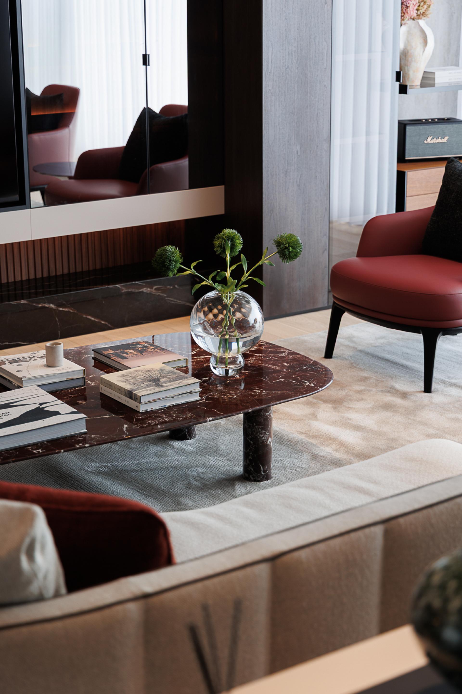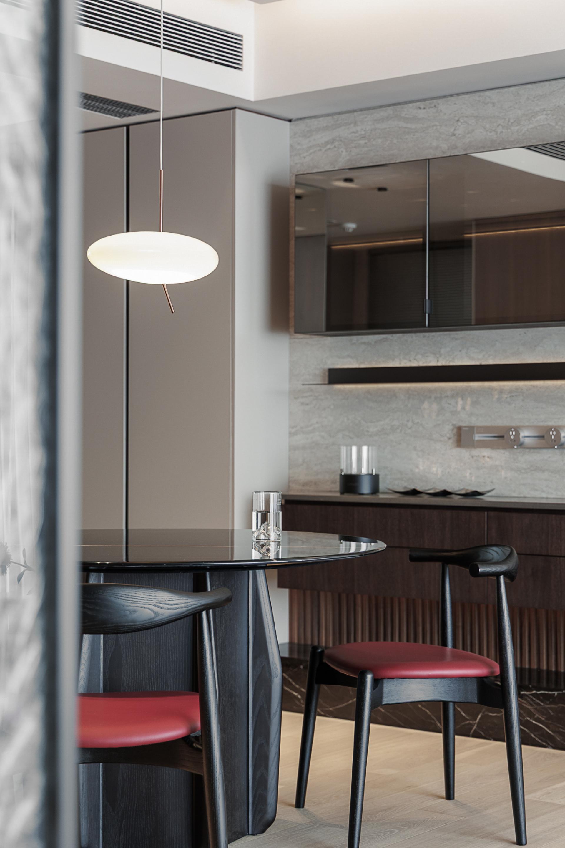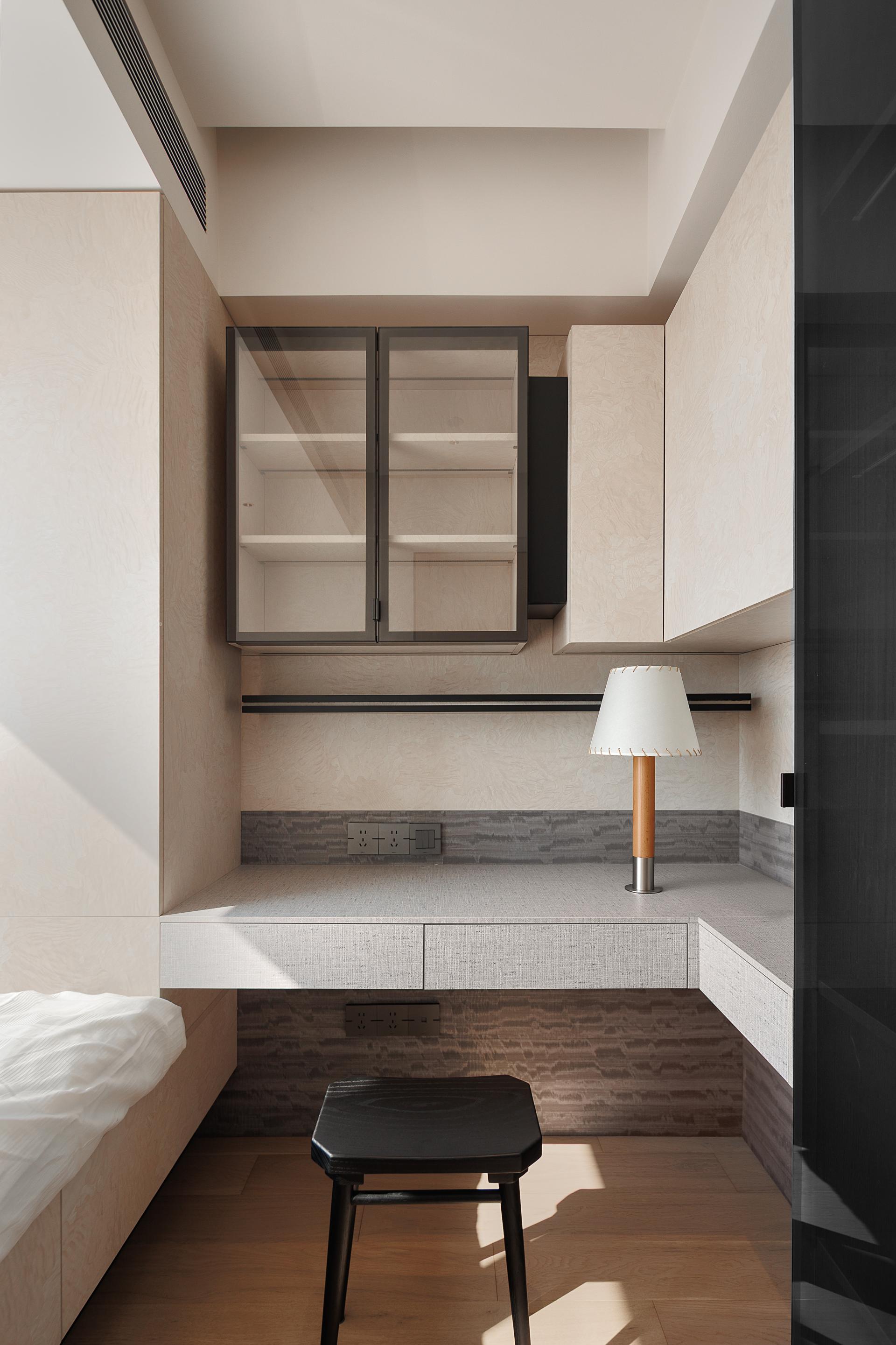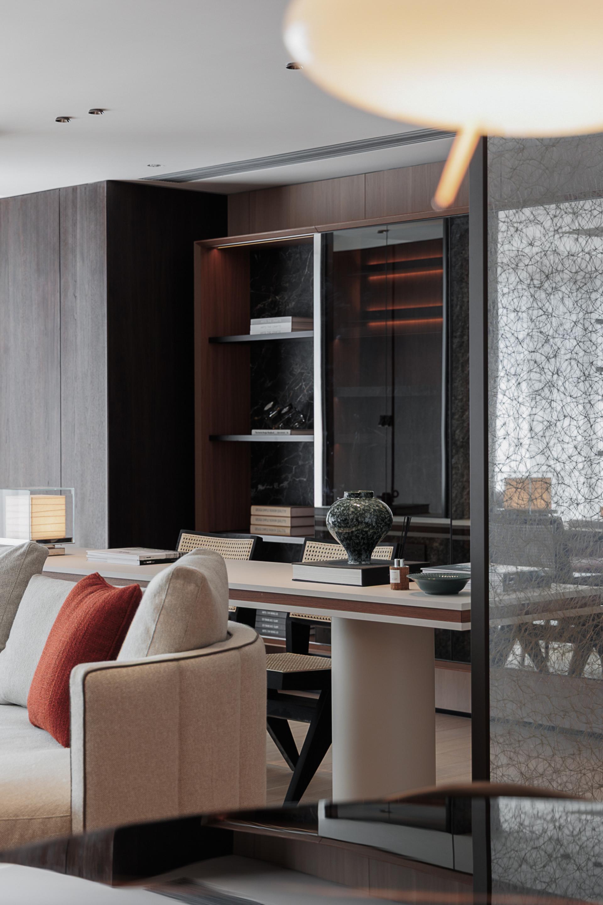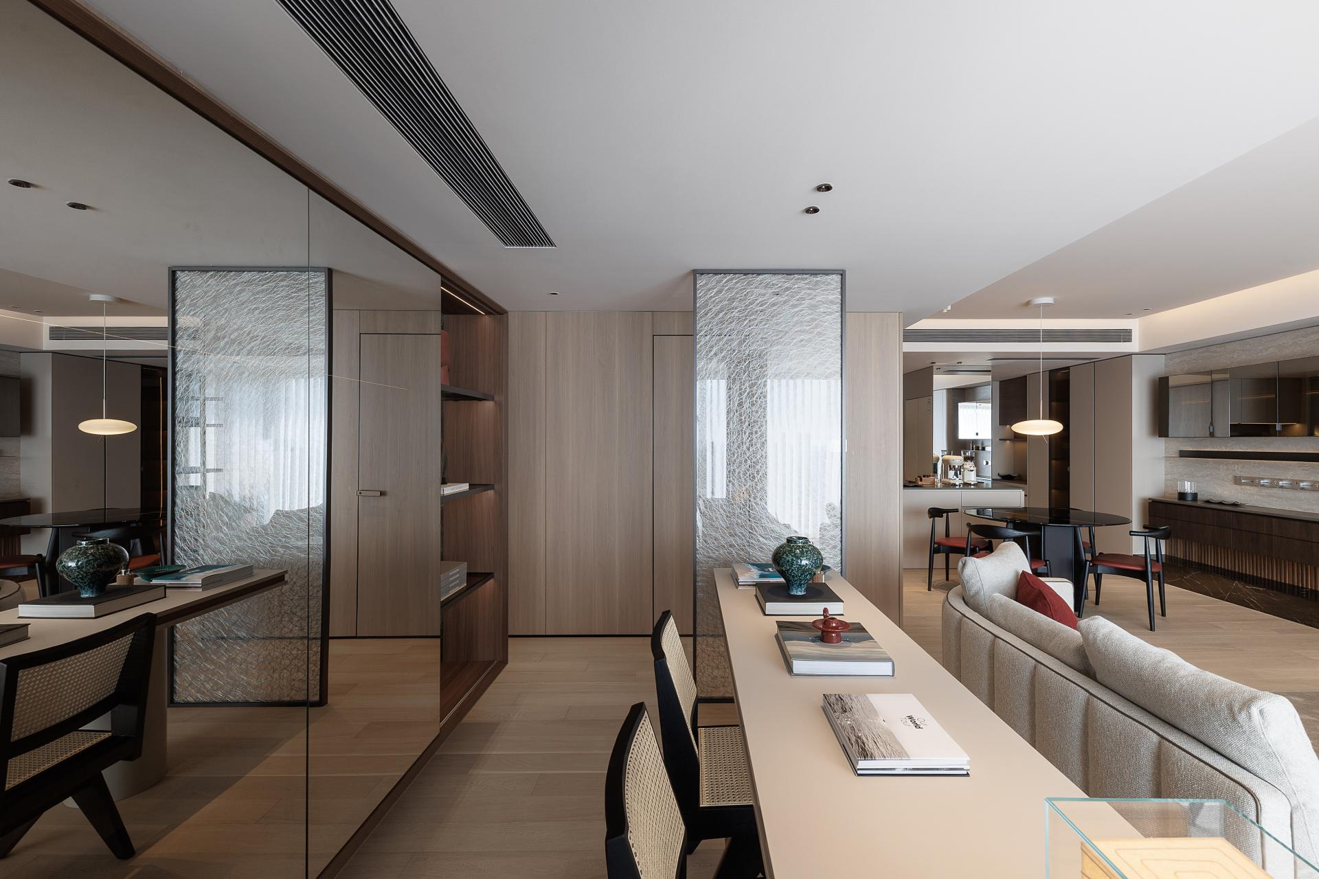 The study, an extension of the living space, serves as a hybrid zone for work and social interaction. A custom-built, elongated desk, semi-transparent wire-glass screen, and a mirror-glass bookcase with concealed lighting amplify spatial depth while enhancing visual lightness and sophistication.