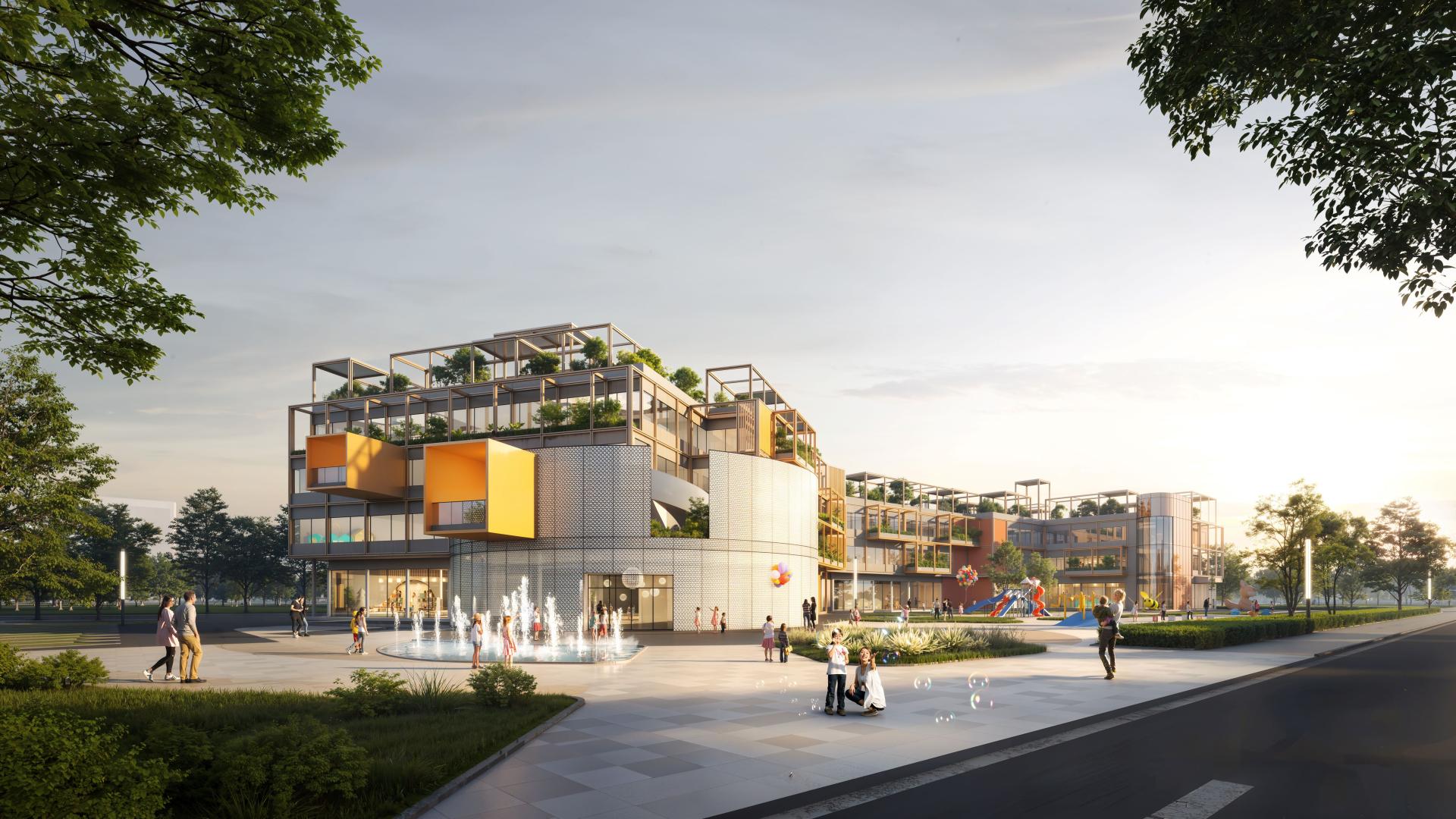 Landscape Design:Breaking from traditional enclosed layouts, the project organically integrates the western park’s greenbelt through a 100-meter plane tree forest corridor, creating a "Green Corridor Homecoming" experience. A three-tier spatial sequence of "sunken courtyard - skywalk - tree-lined interface" links the 21-class kindergarten to the north and the western park, achieving a soft transition.