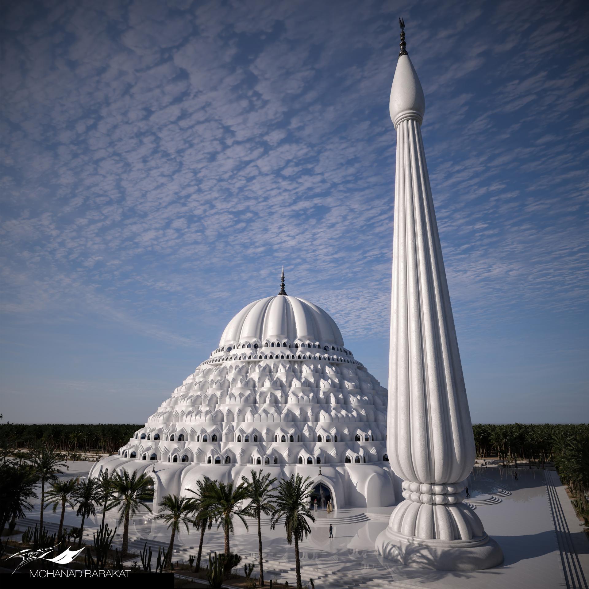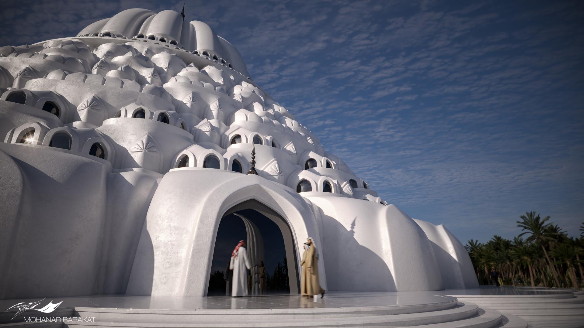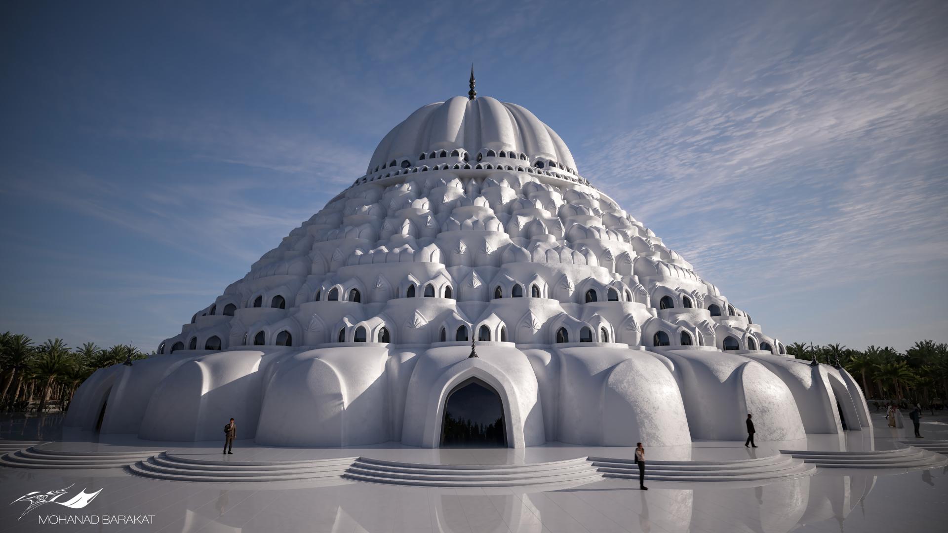 The Muqarnas Mosque stands as a breathtaking embodiment of Islamic architectural mastery, inspired by the intricate muqarnas of Oman. This white-domed marvel showcases a meticulously tiered structure, where cascading geometric patterns create a rhythmic visual harmony. The mosque's exterior is adorned with thousands of arched recesses, forming a fluid transition between traditional Islamic artistry and contemporary design sensibilities. The grand dome, crowned with delicate ornamental details, exudes a celestial presence, while the towering minaret complements its grandeur.