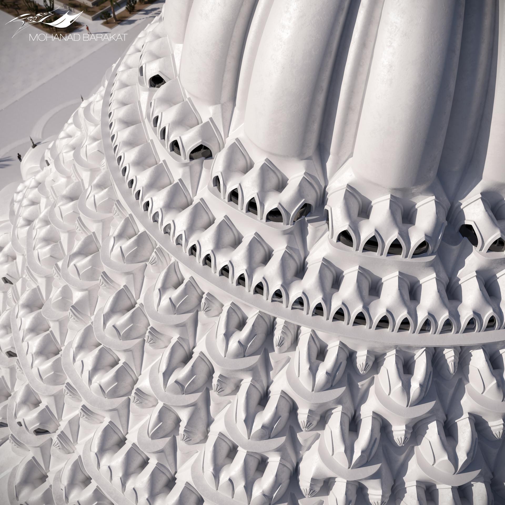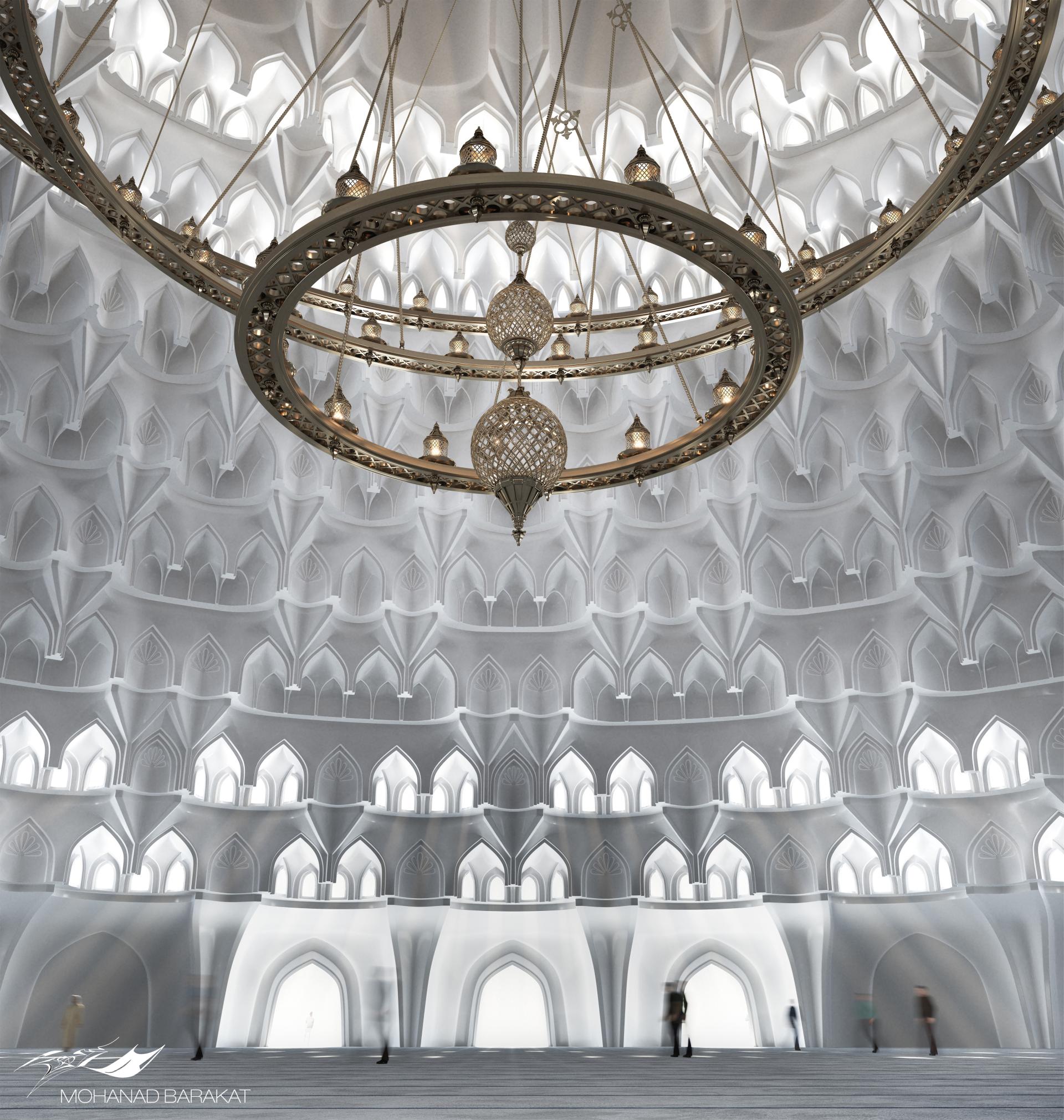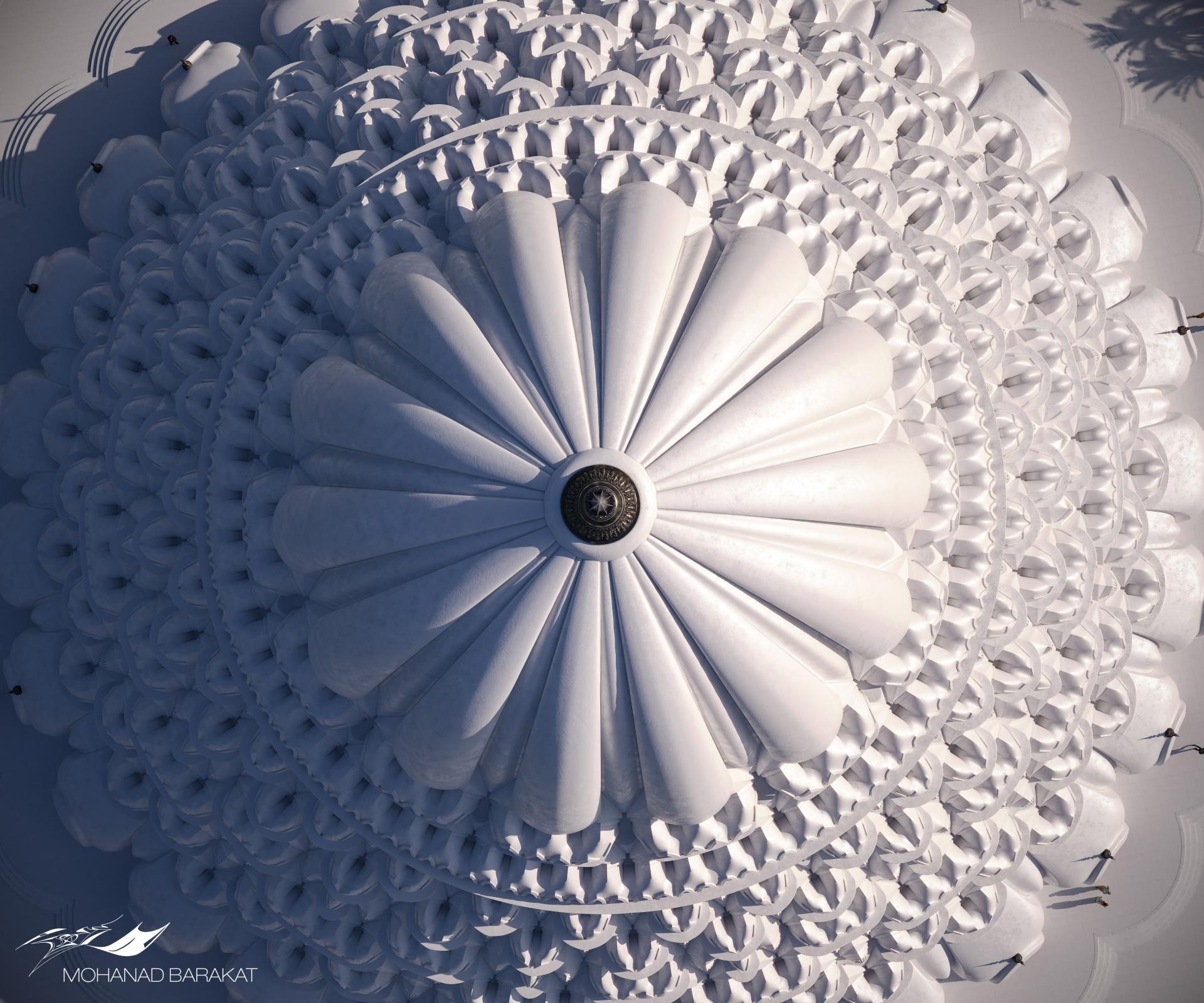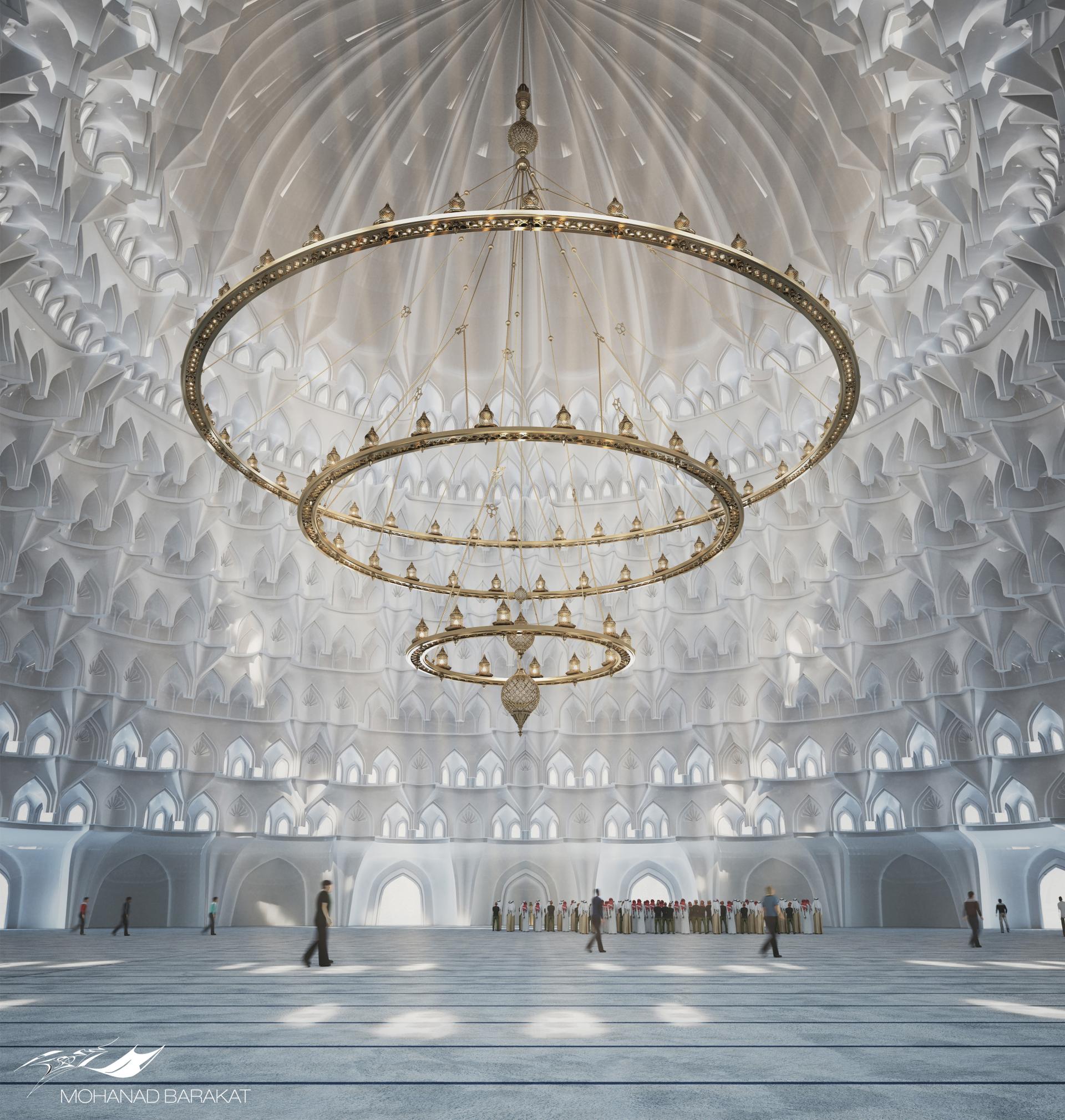 The Muqarnas Mosque stands as a breathtaking embodiment of Islamic architectural mastery, inspired by the intricate muqarnas of Oman. This white-domed marvel showcases a meticulously tiered structure, where cascading geometric patterns create a rhythmic visual harmony. The mosque's exterior is adorned with thousands of arched recesses, forming a fluid transition between traditional Islamic artistry and contemporary design sensibilities. The grand dome, crowned with delicate ornamental details, exudes a celestial presence, while the towering minaret complements its grandeur.