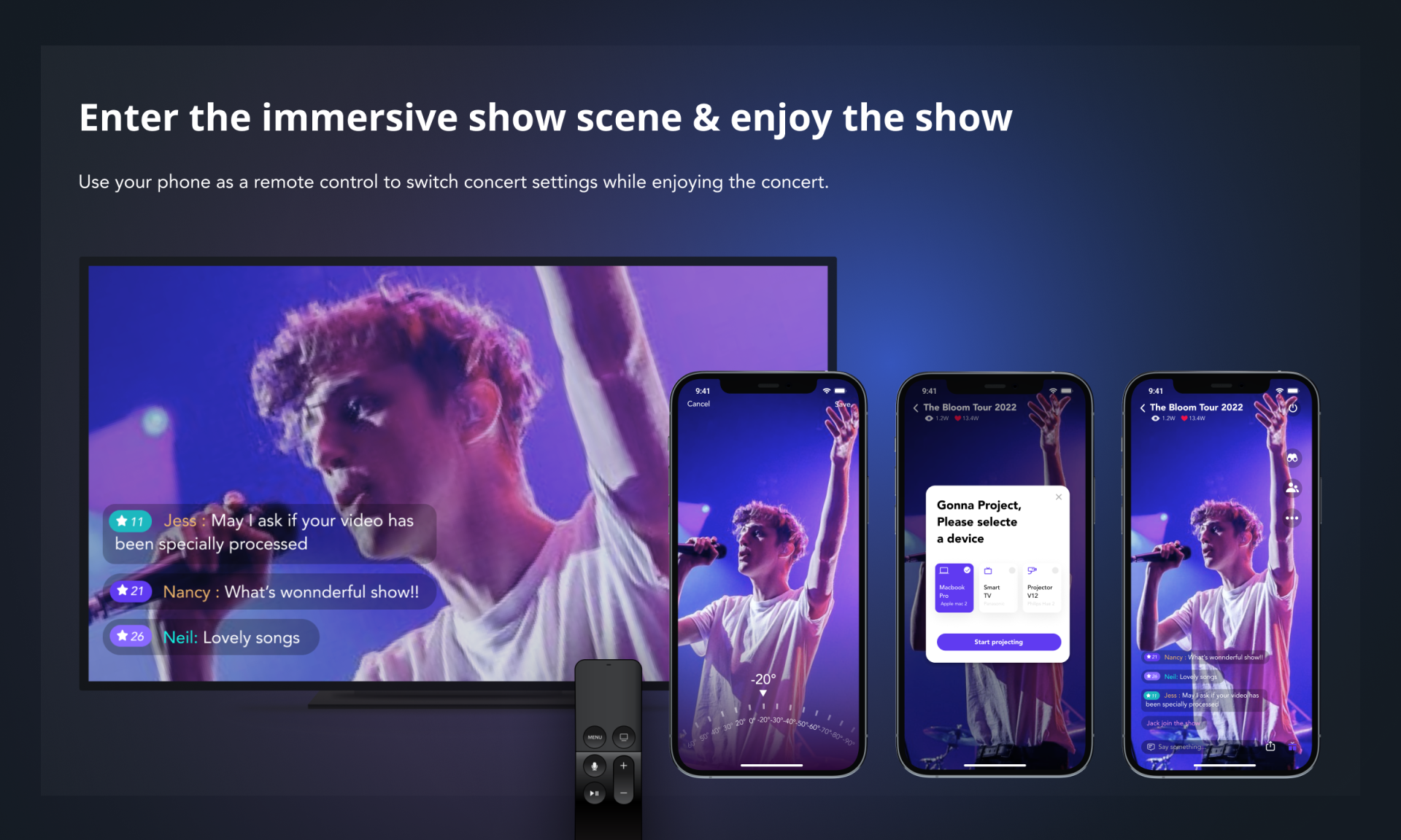 Vocal Space is an AI-powered immersive virtual show platform designed to transform the at-home concert experience through a combination of smart customization, real-time interaction, and advanced technology integration.