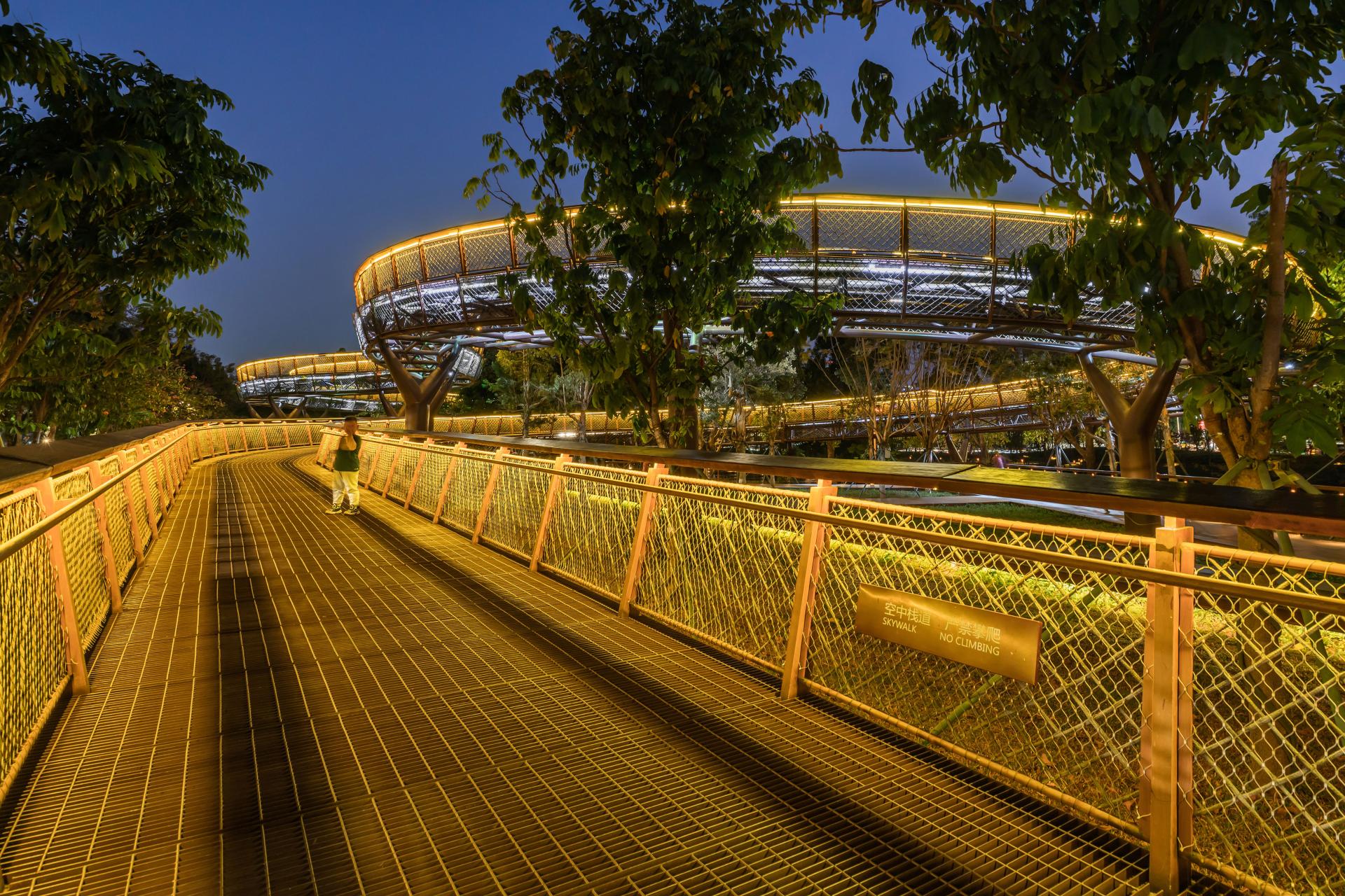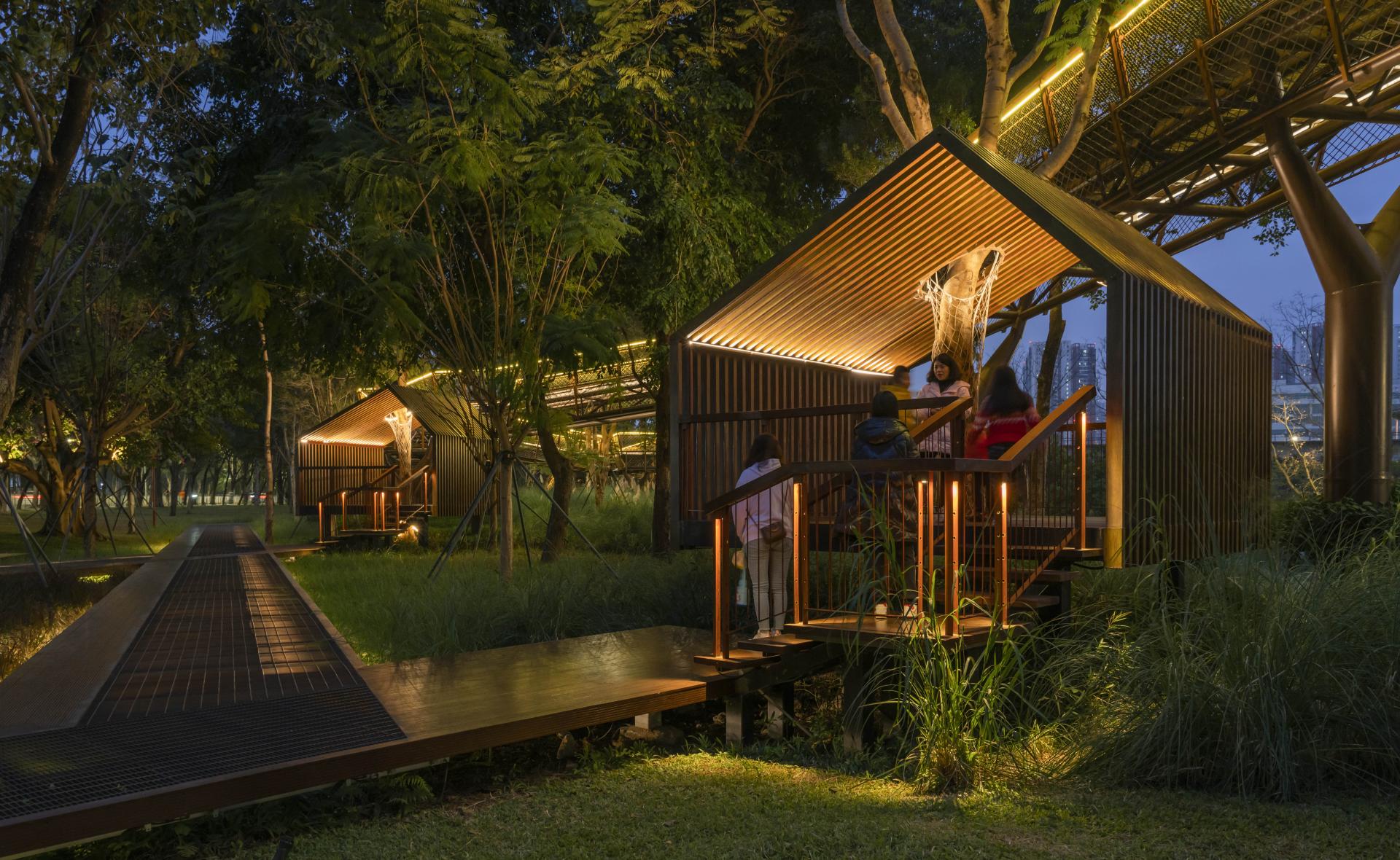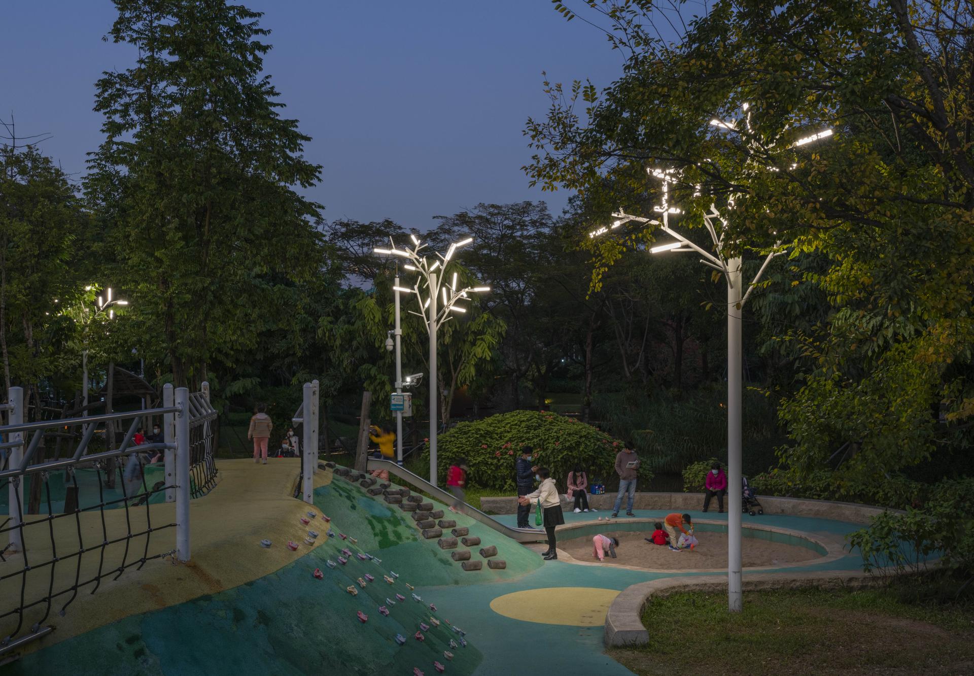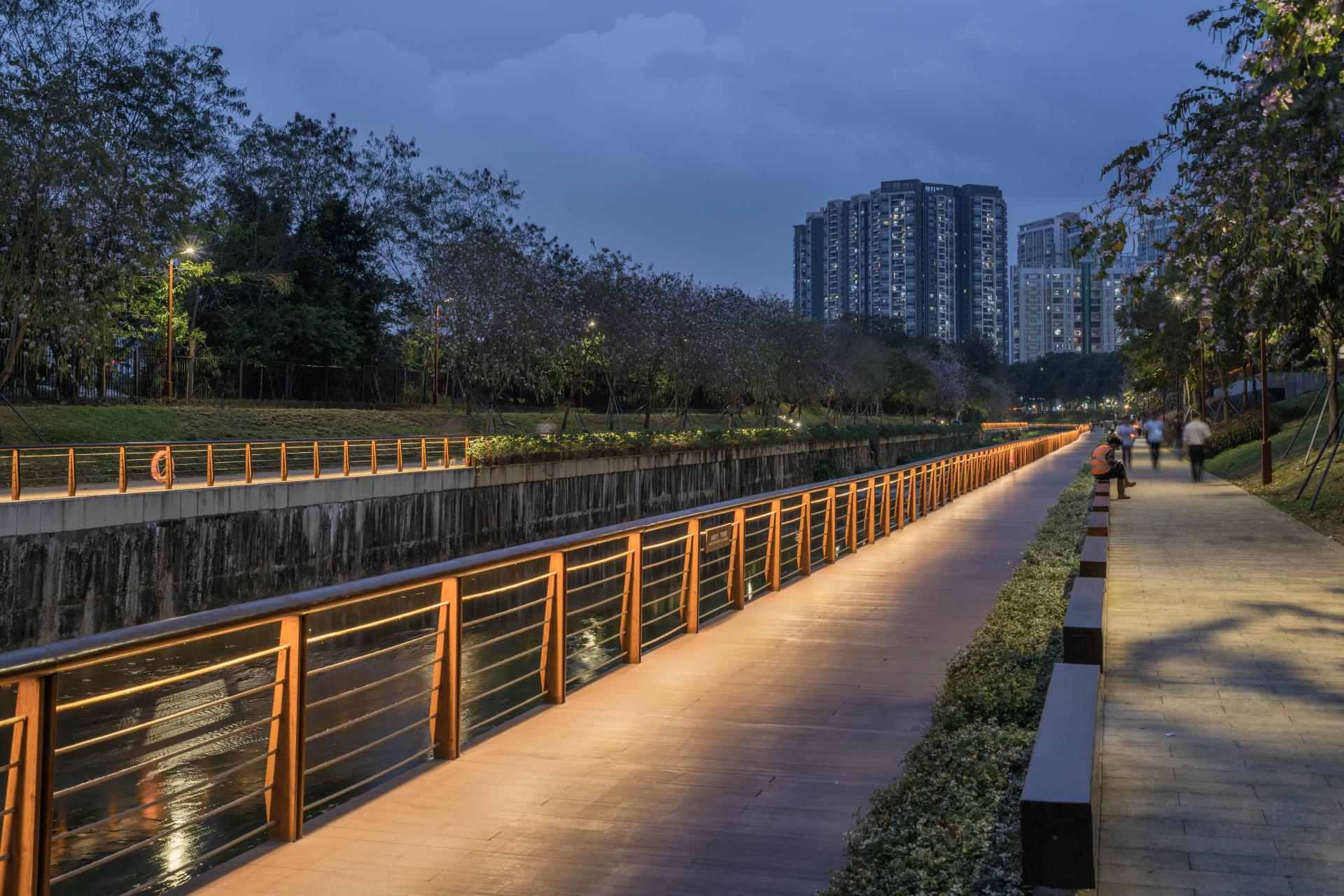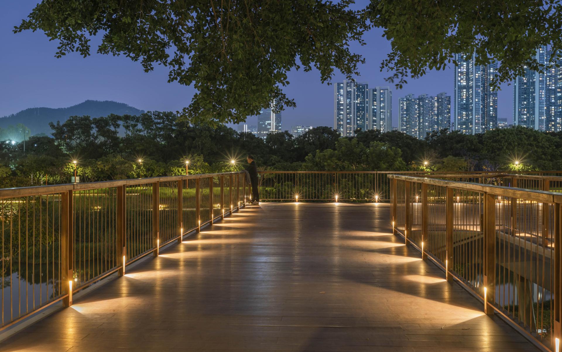 深圳大沙河是深圳西部的母亲河,全长约15公里,自北向南蜿蜒成一条美丽的城市“绿色飘带”。夜景光环境将根据景观“活力水岸、城市森林、学院之道”三大主题,塑造起深圳“时光之河”的城市景观意象,采用“以光绘景,以景造境”的方式将时光在空间上延续,同时将情感注入到设计之中,让每一束光都变得富有价值。对于大沙河生态长廊夜间光环境设计,将从空间的连续性、空间的独立性、空间的舒适性三个方面来进行考虑。根据“活力水岸、城市森林、学院之道”三大主题,灯光分别赋予夜间光环境不同的空间感受,“活力水岸”段以简洁现代的线条和明亮的光环境将深圳国际化滨水空间的气质彰显出来;“城市森林”段则尽可能减少灯光的介入,以低干扰的方式塑造城市森林静谧感;“学院之道”则通过富有趣味性、创意感的景观灯光装置赋予大学城的特别的体验。