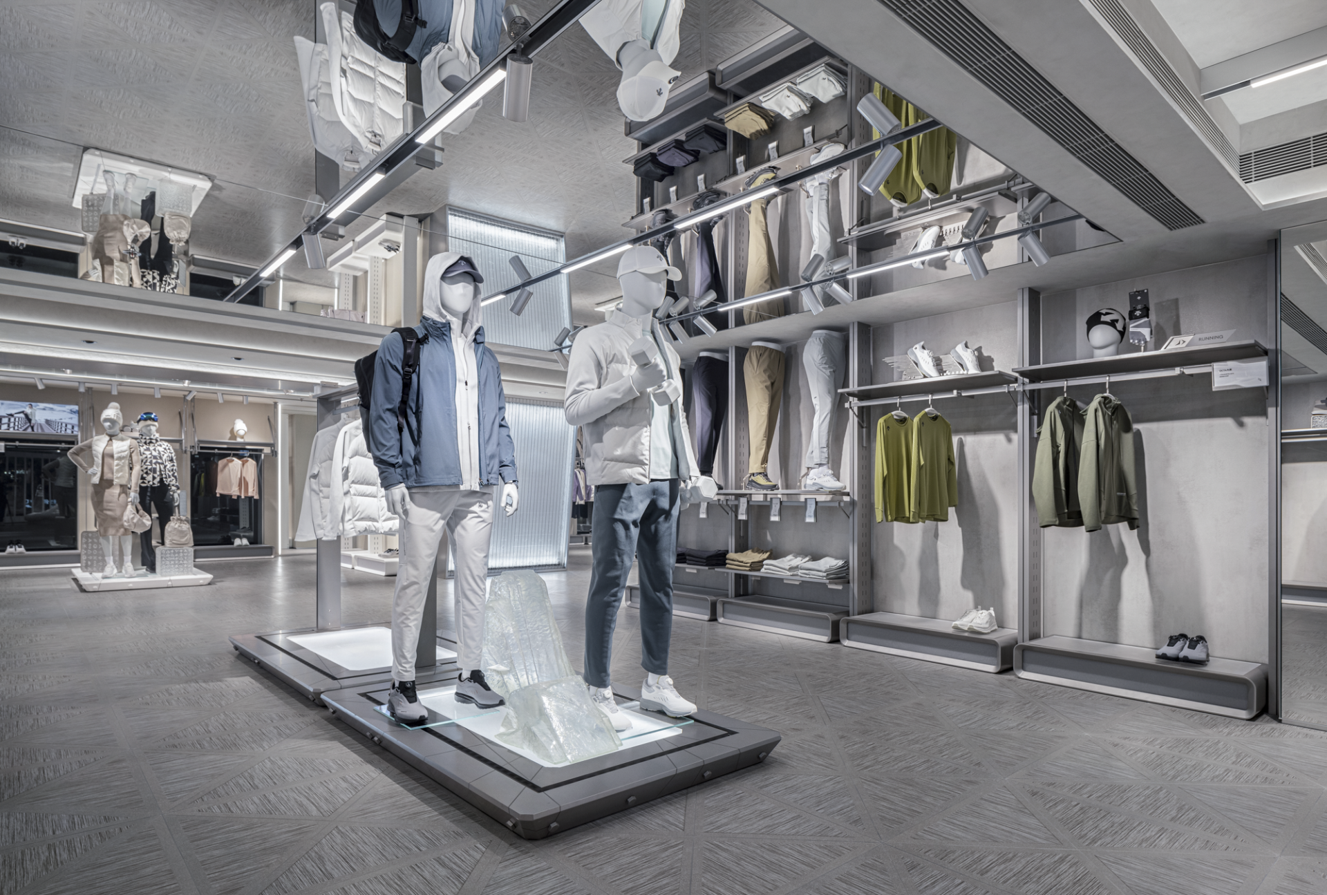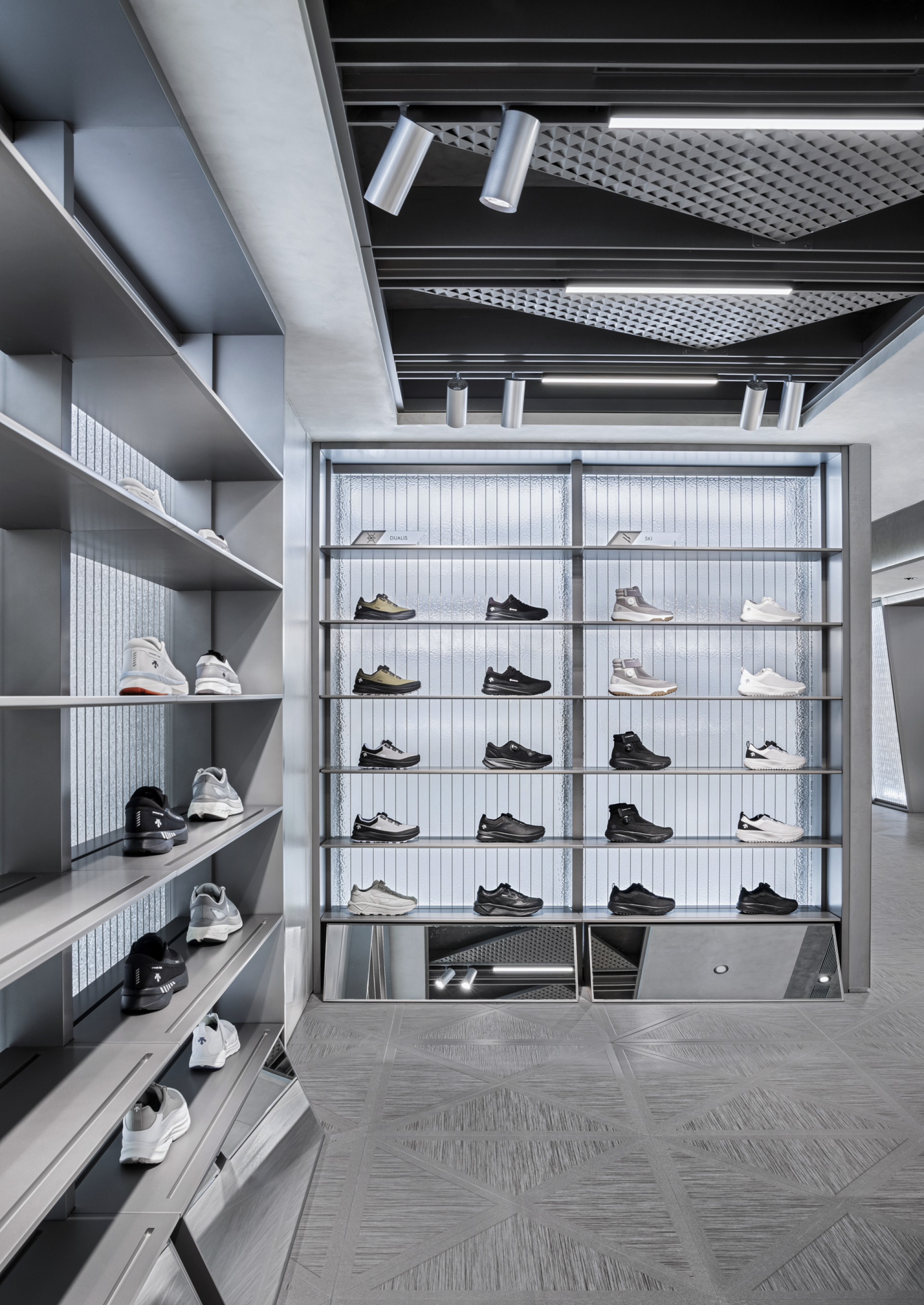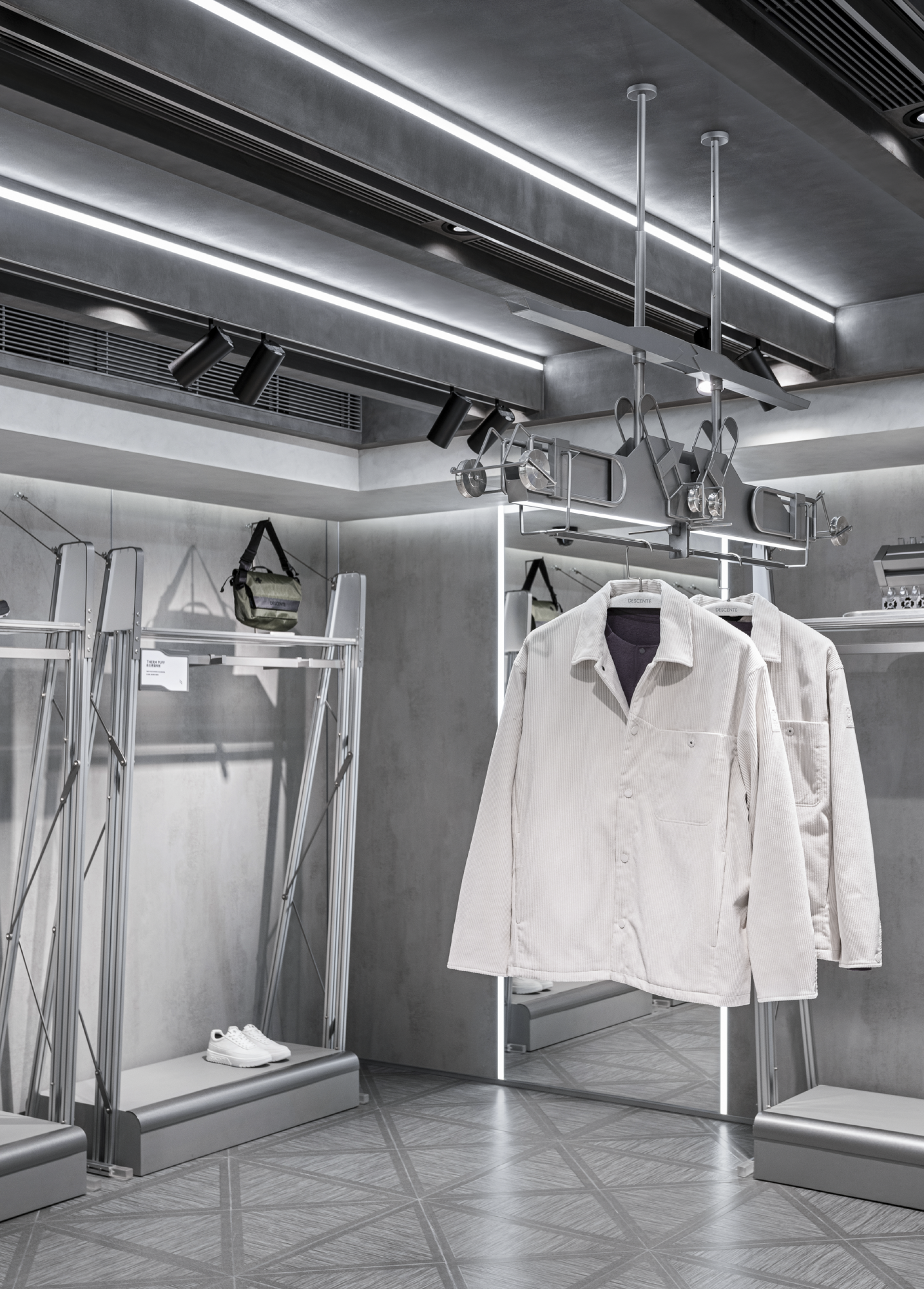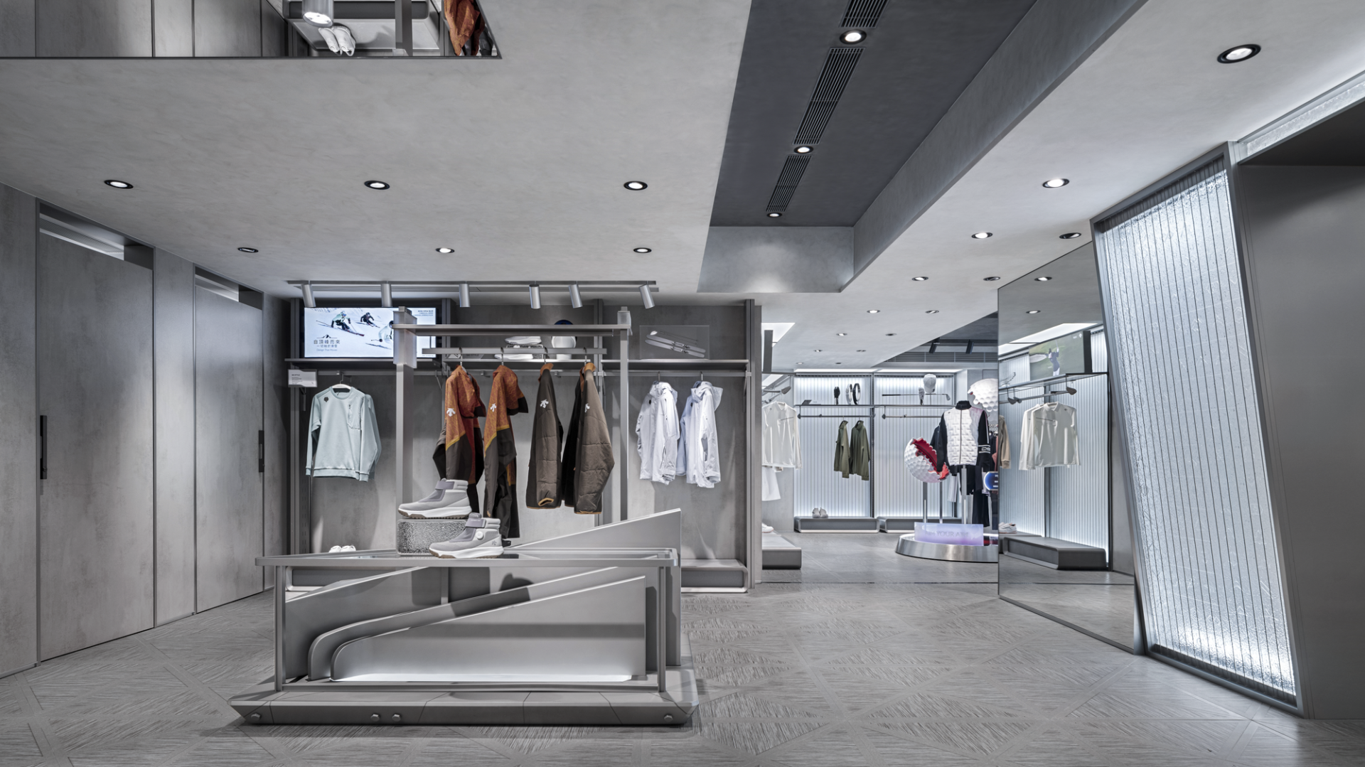 At the entrance, a sequence of diamond-shaped motifs unfolds across both floor and facade, establishing a rhythmic visual language reminiscent of genetic chains. Slanted walls and cantilevered display fixtures disrupt static balance, invoking a sense of anti-gravity tension that symbolizes DESCENTE’s icy DNA and spirit of exploration. Geometric lines extend throughout the space, not only delineating functional zones but also creating a spatial rhythm through strategic lighting and material contrasts, guiding consumers on an immersive journey into a futuristic realm.