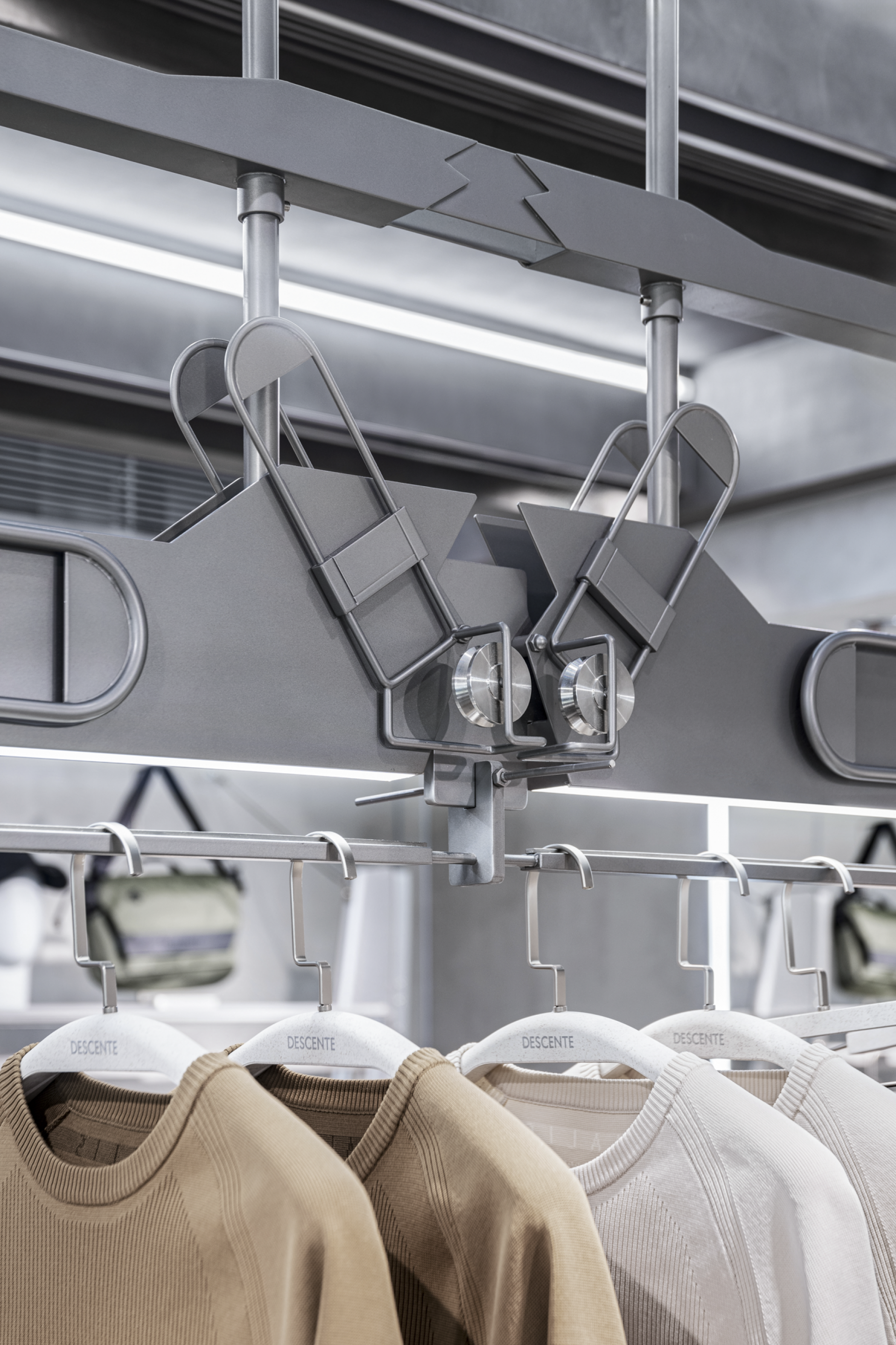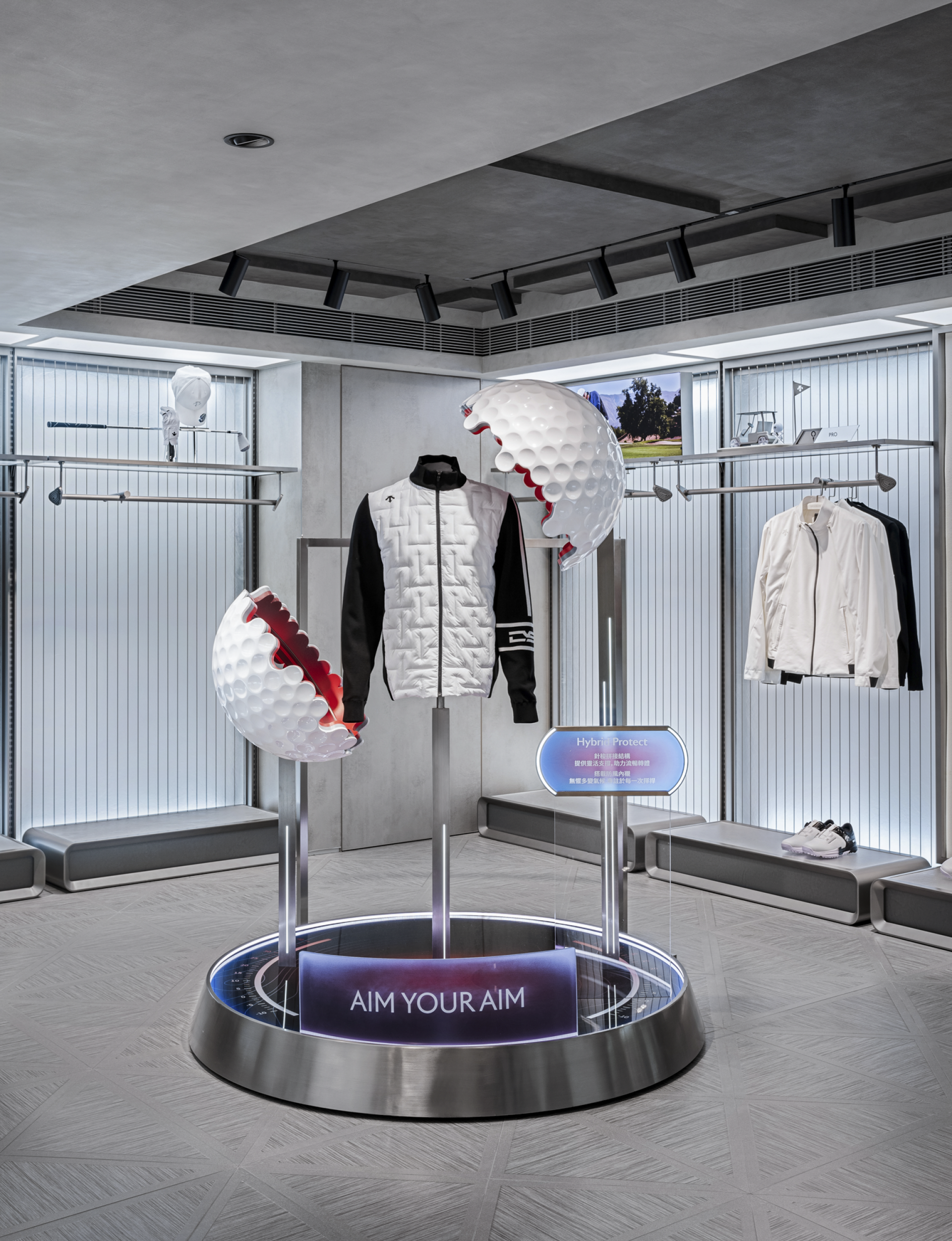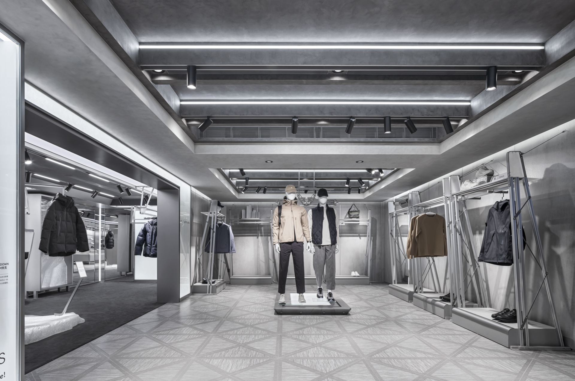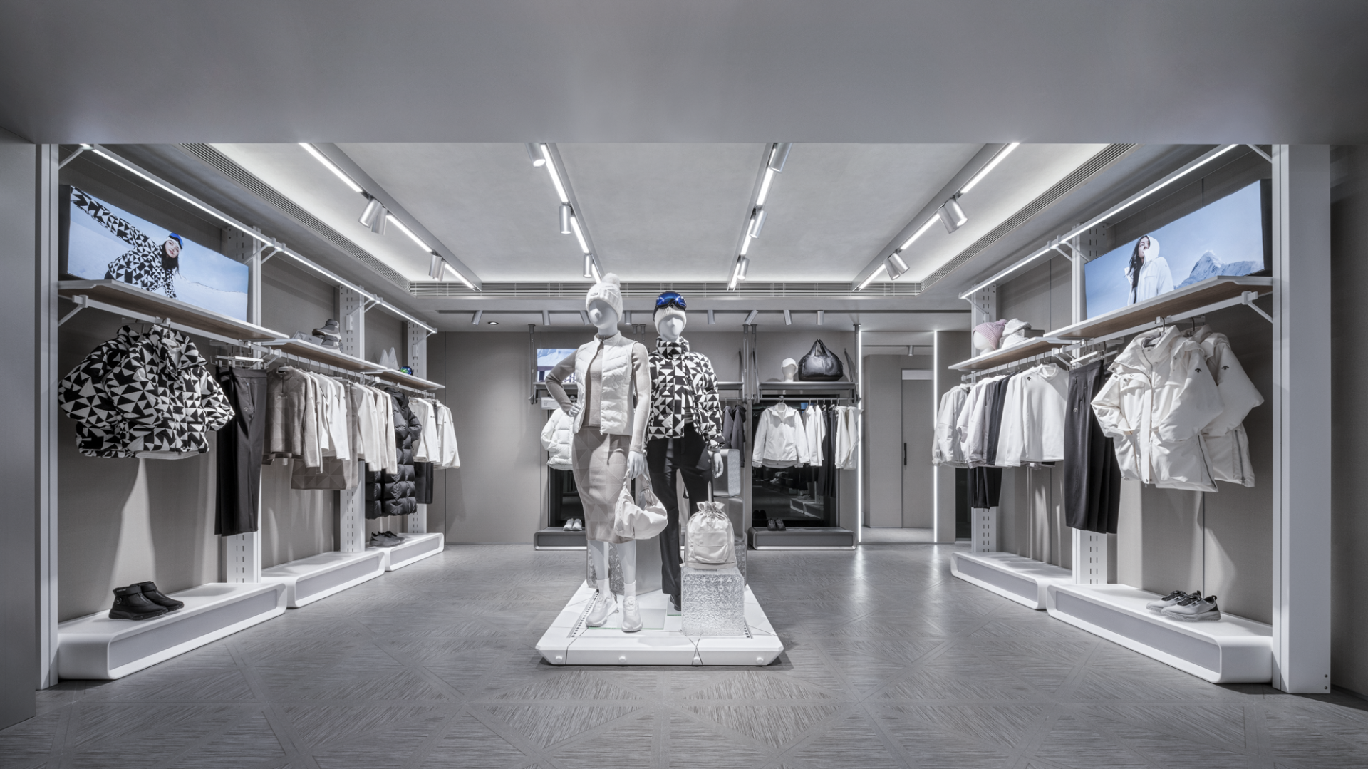 At the entrance, a sequence of diamond-shaped motifs unfolds across both floor and facade, establishing a rhythmic visual language reminiscent of genetic chains. Slanted walls and cantilevered display fixtures disrupt static balance, invoking a sense of anti-gravity tension that symbolizes DESCENTE’s icy DNA and spirit of exploration. Geometric lines extend throughout the space, not only delineating functional zones but also creating a spatial rhythm through strategic lighting and material contrasts, guiding consumers on an immersive journey into a futuristic realm.