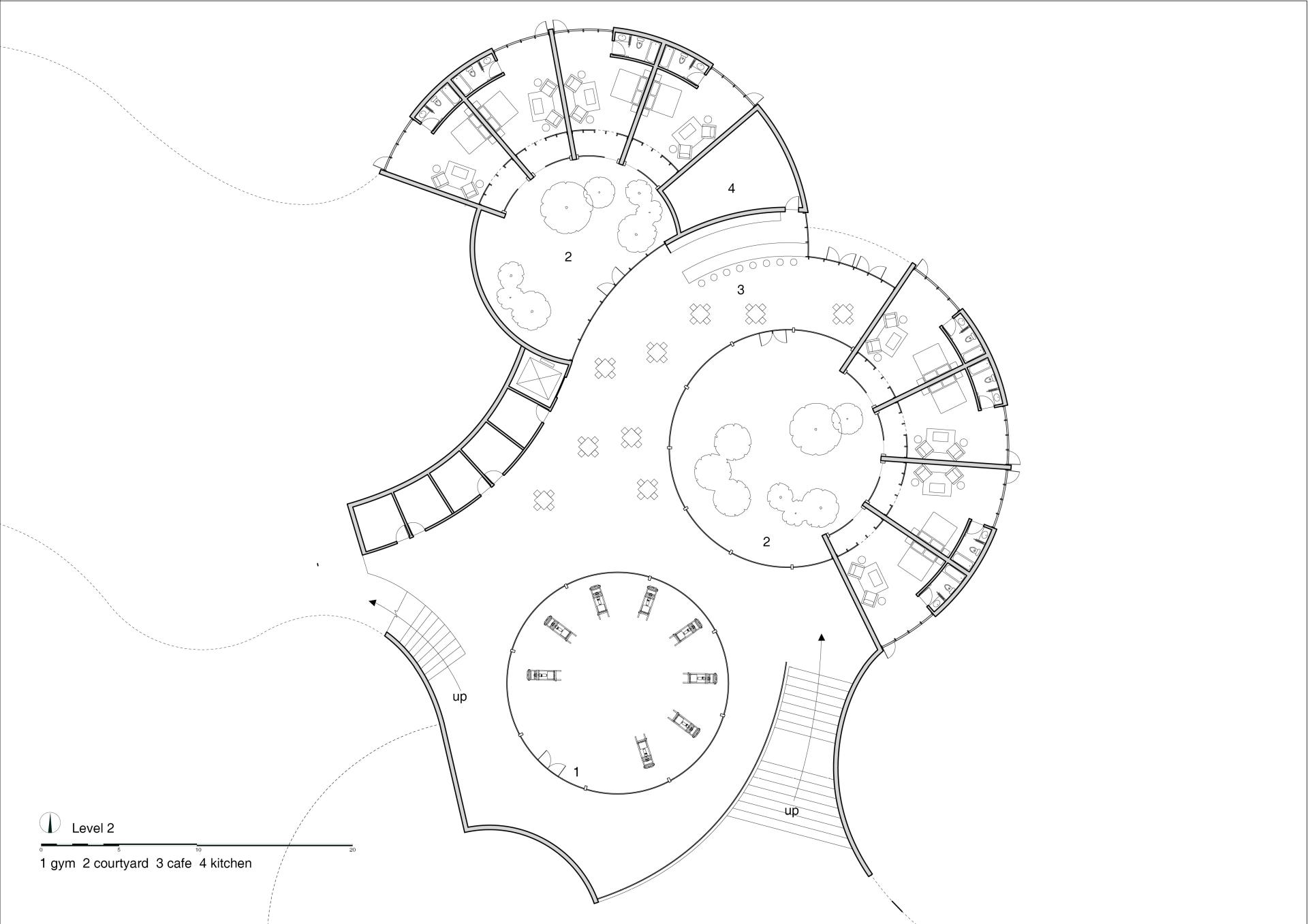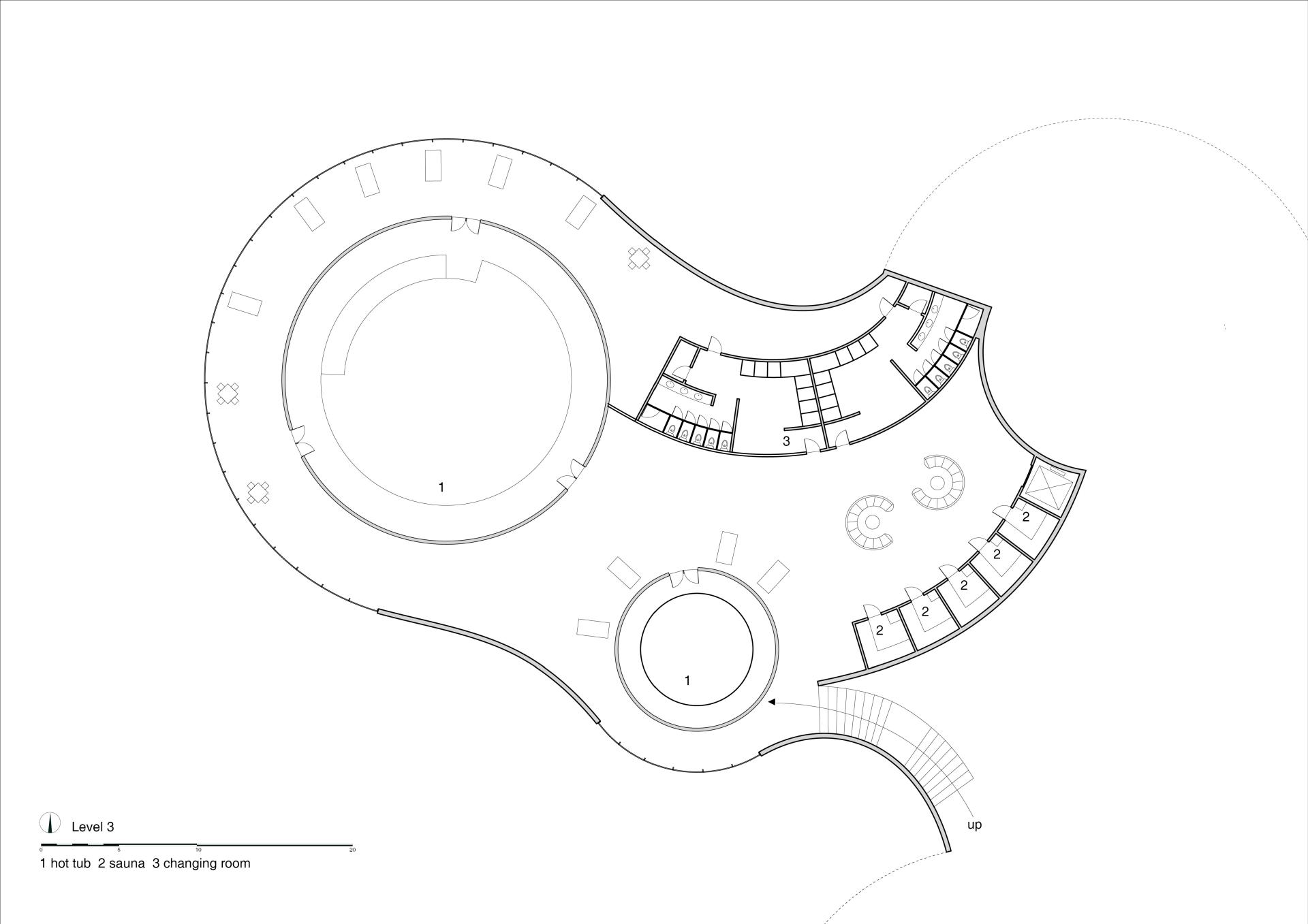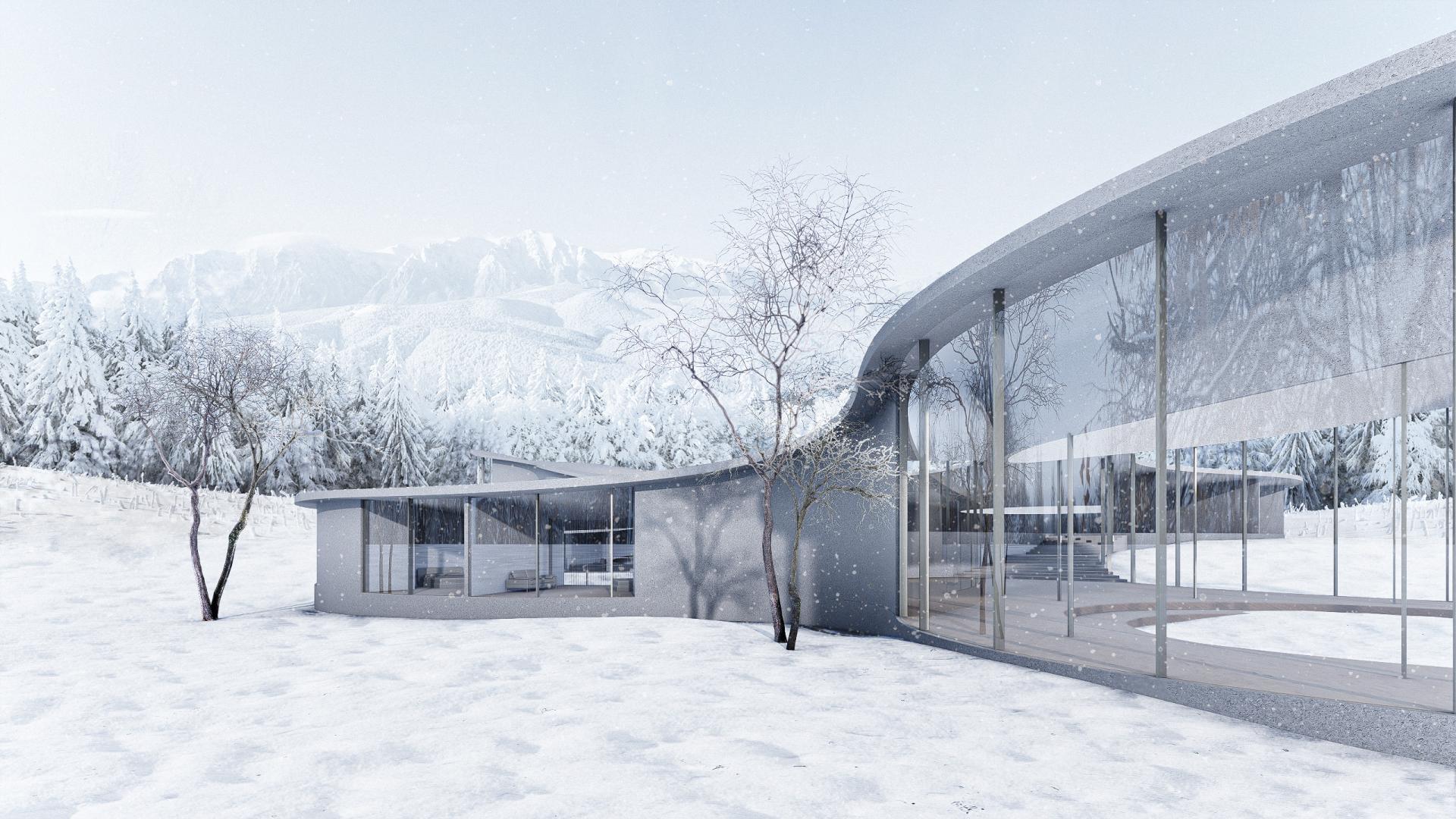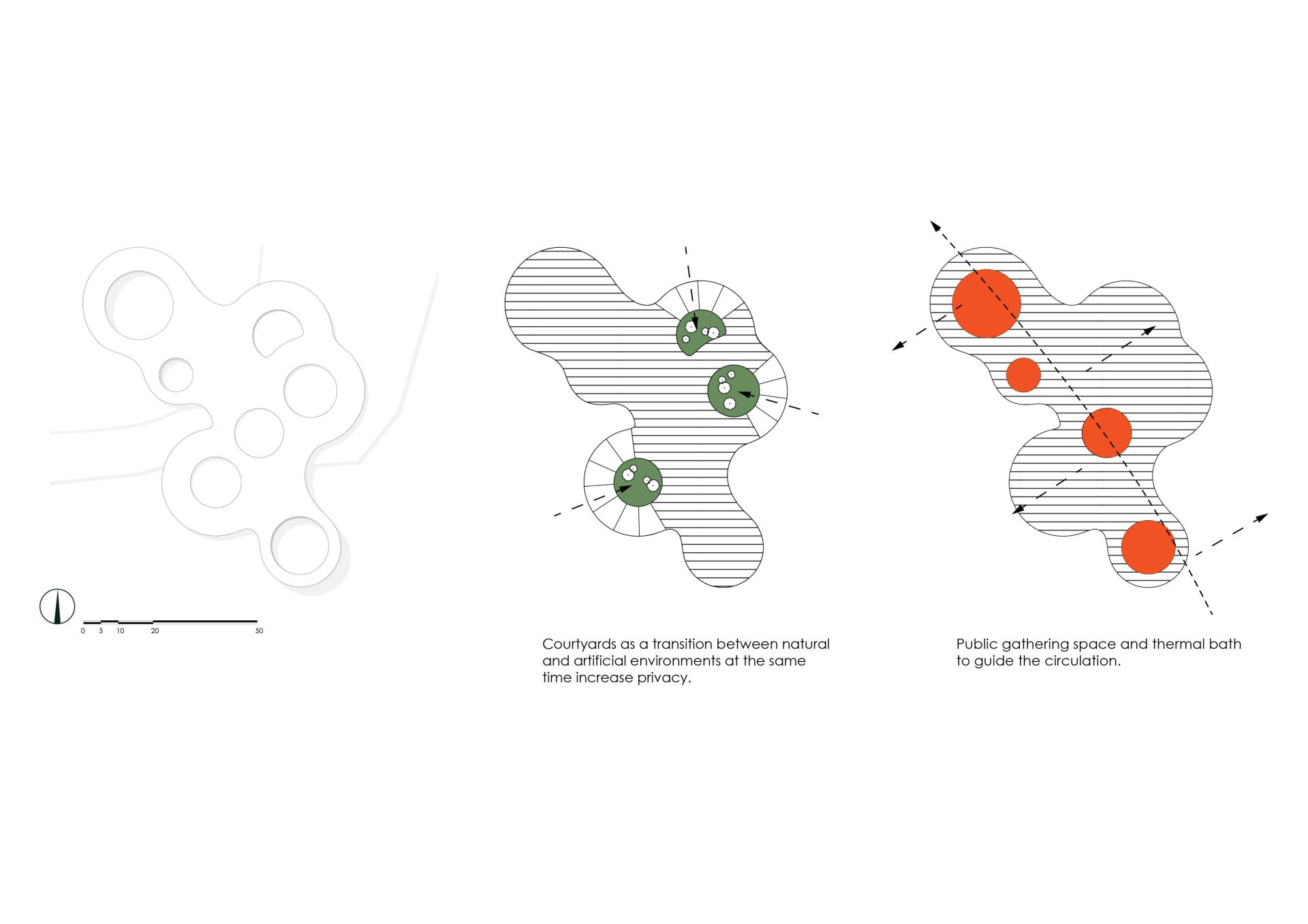 To harmonize with the environment and preserve privacy, the architecture adopts upright and inverted tapered forms—shaped as thermal baths and courtyards—that merge seamlessly with the topography. These sculpted geometries reinterpret familiar rituals through a new architectural lens, creating a spatial experience that is at once unconventional and deeply rooted in place. The site is designed to remain self-sufficient and accessible, ensuring both autonomy and a deep connection to its remote, forested context.