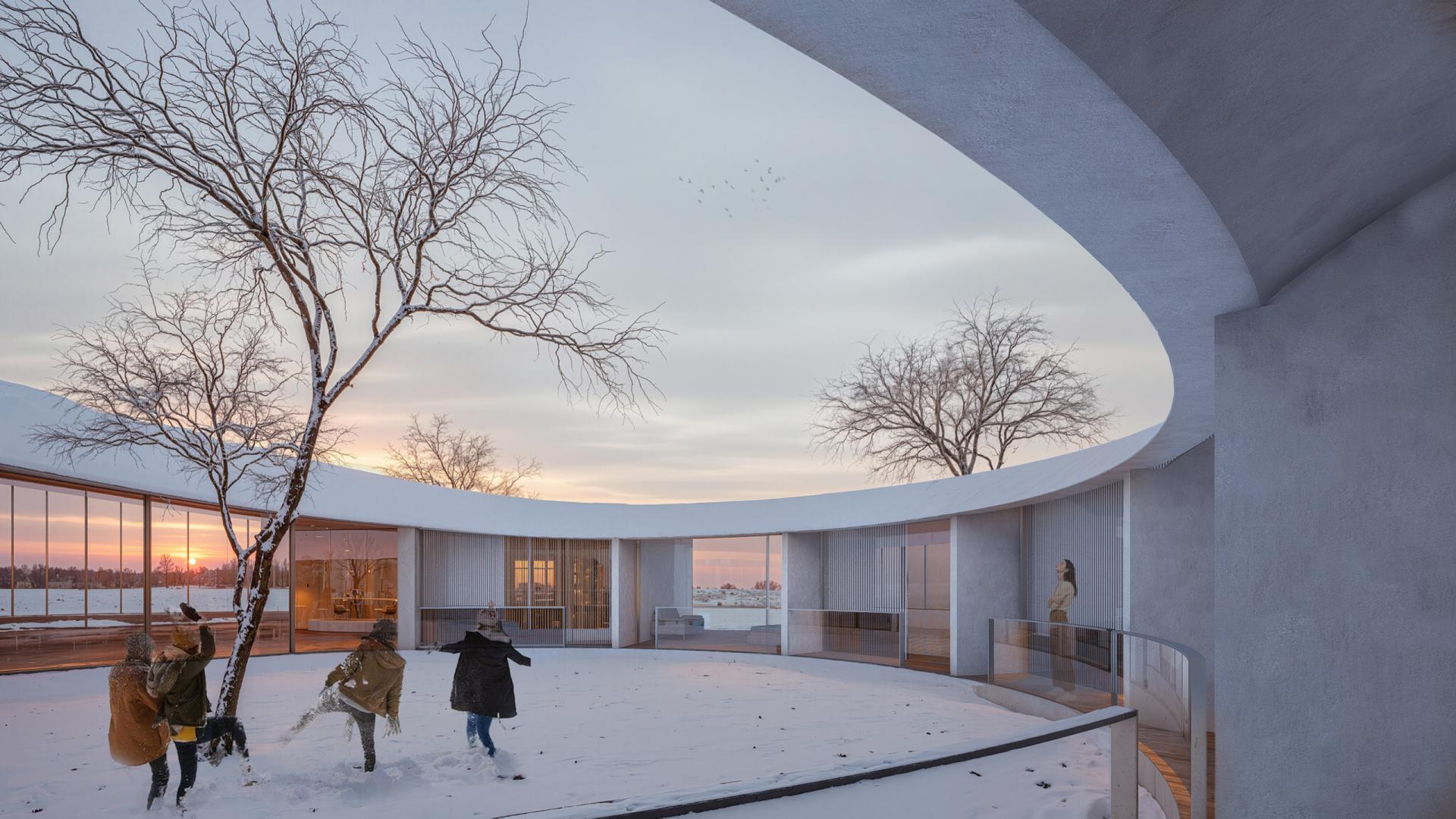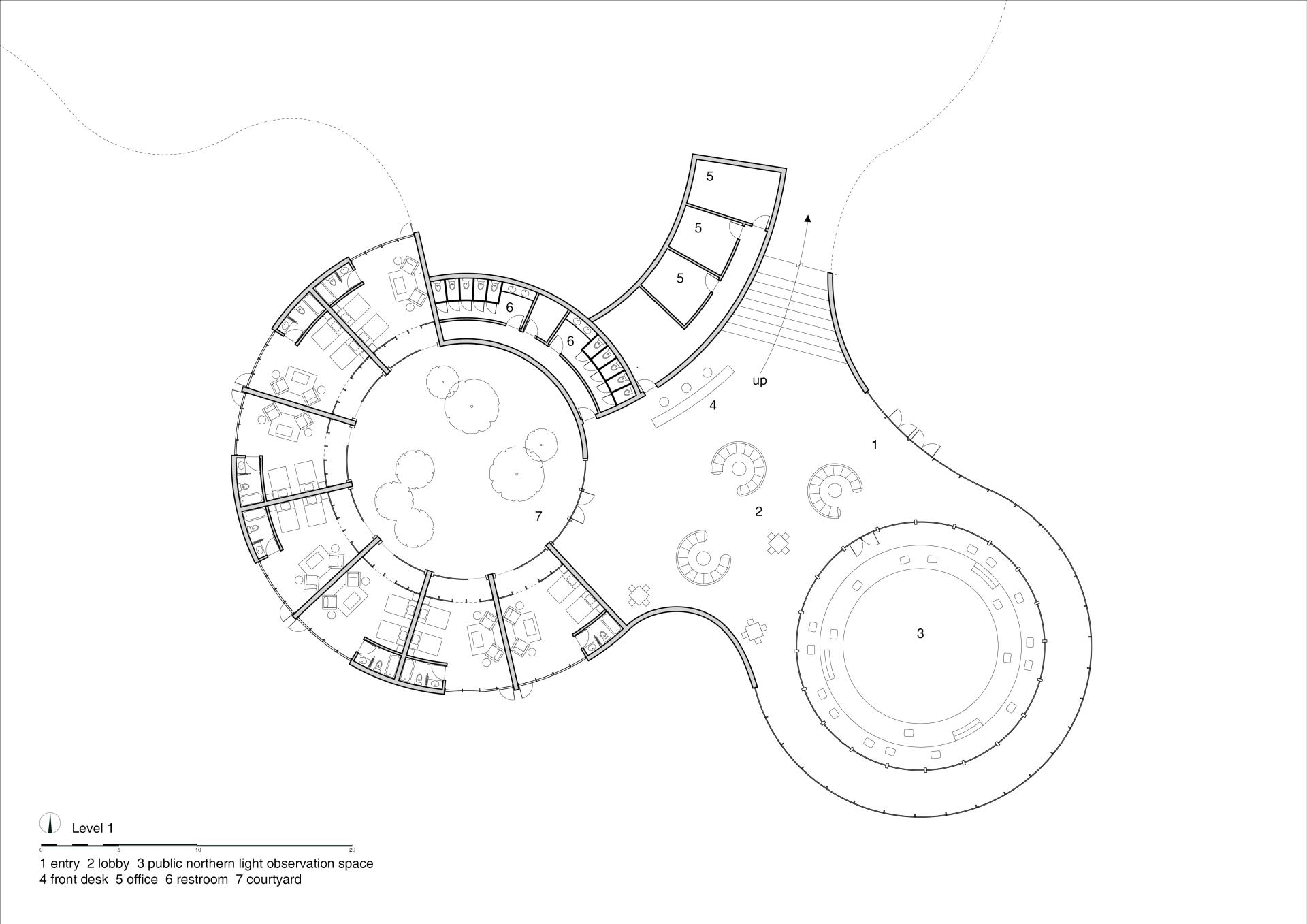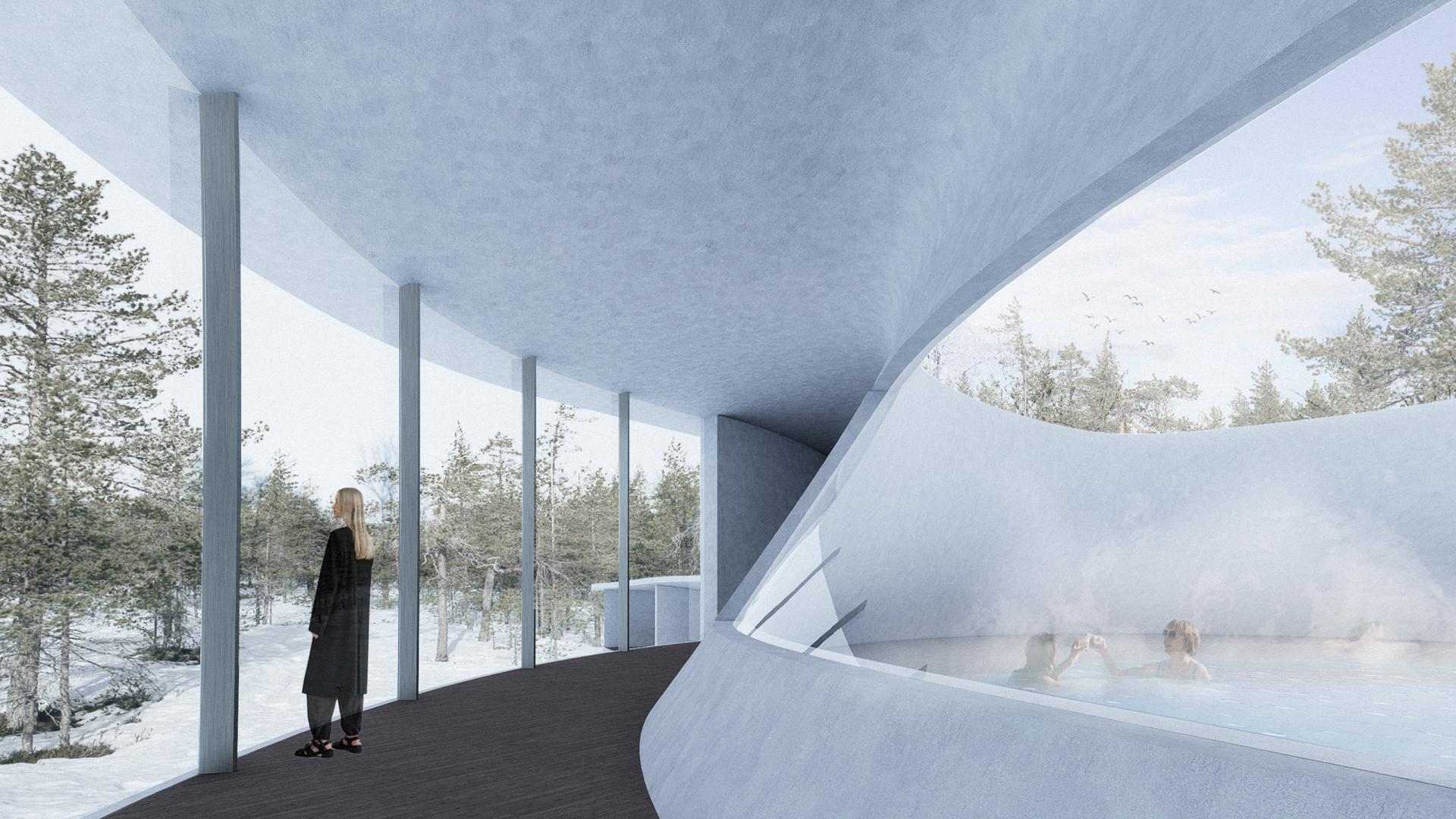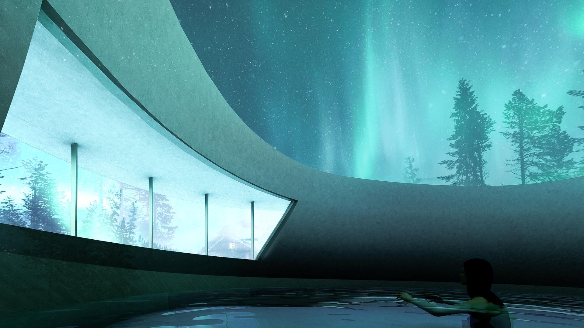 Rooted in Finnish culture, the project weaves thermal baths and saunas into the Arctic hotel experience, while drawing the surrounding forest and northern lights into the architecture itself. The hotel is envisioned as the heart of a refined network of services—offering guests an immersive retreat that balances comfort, seclusion, and nature. Elegant suites are nestled into the landscape, and open-air pools invite visitors to experience the Aurora Borealis from the warmth of the water.