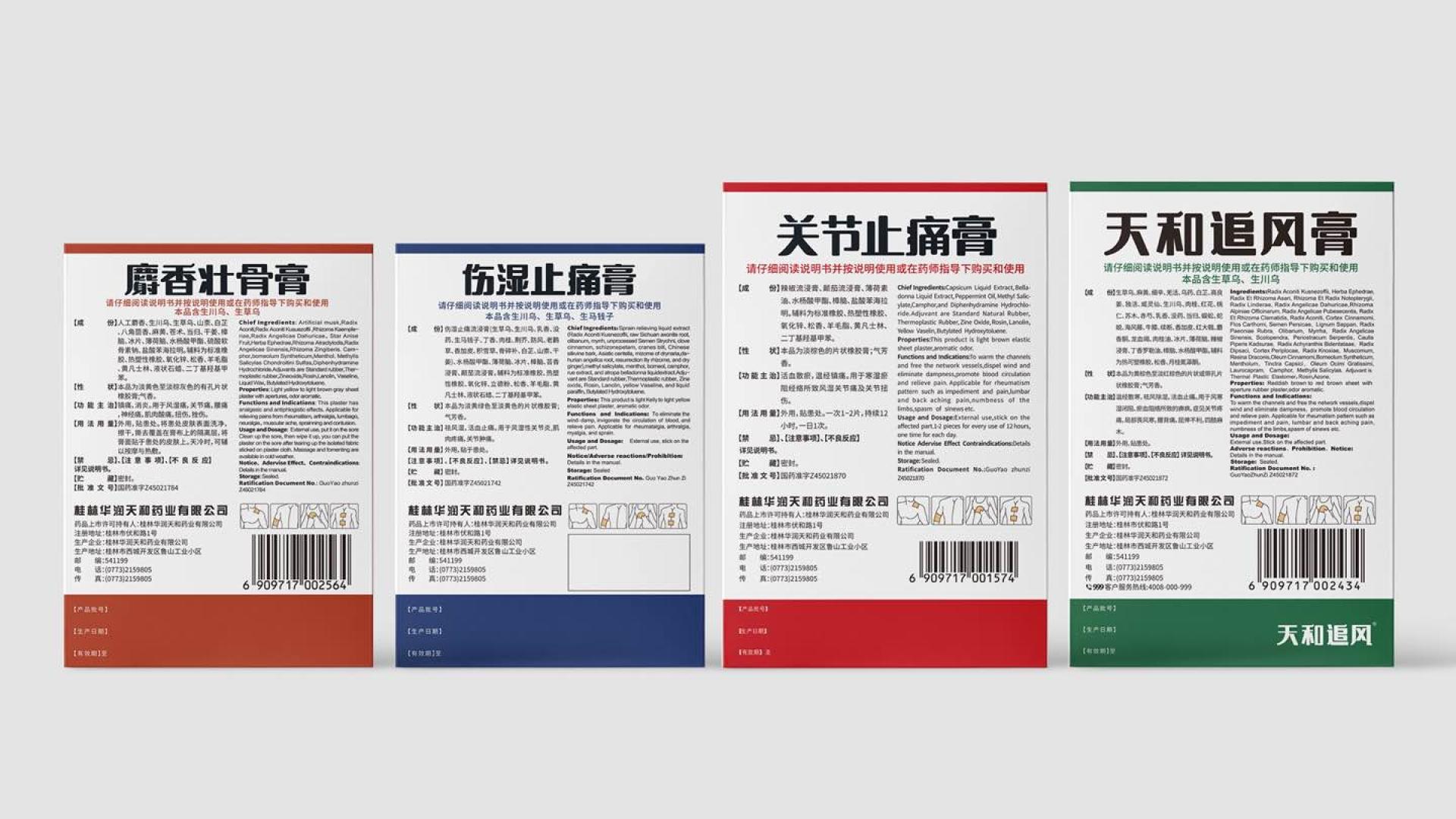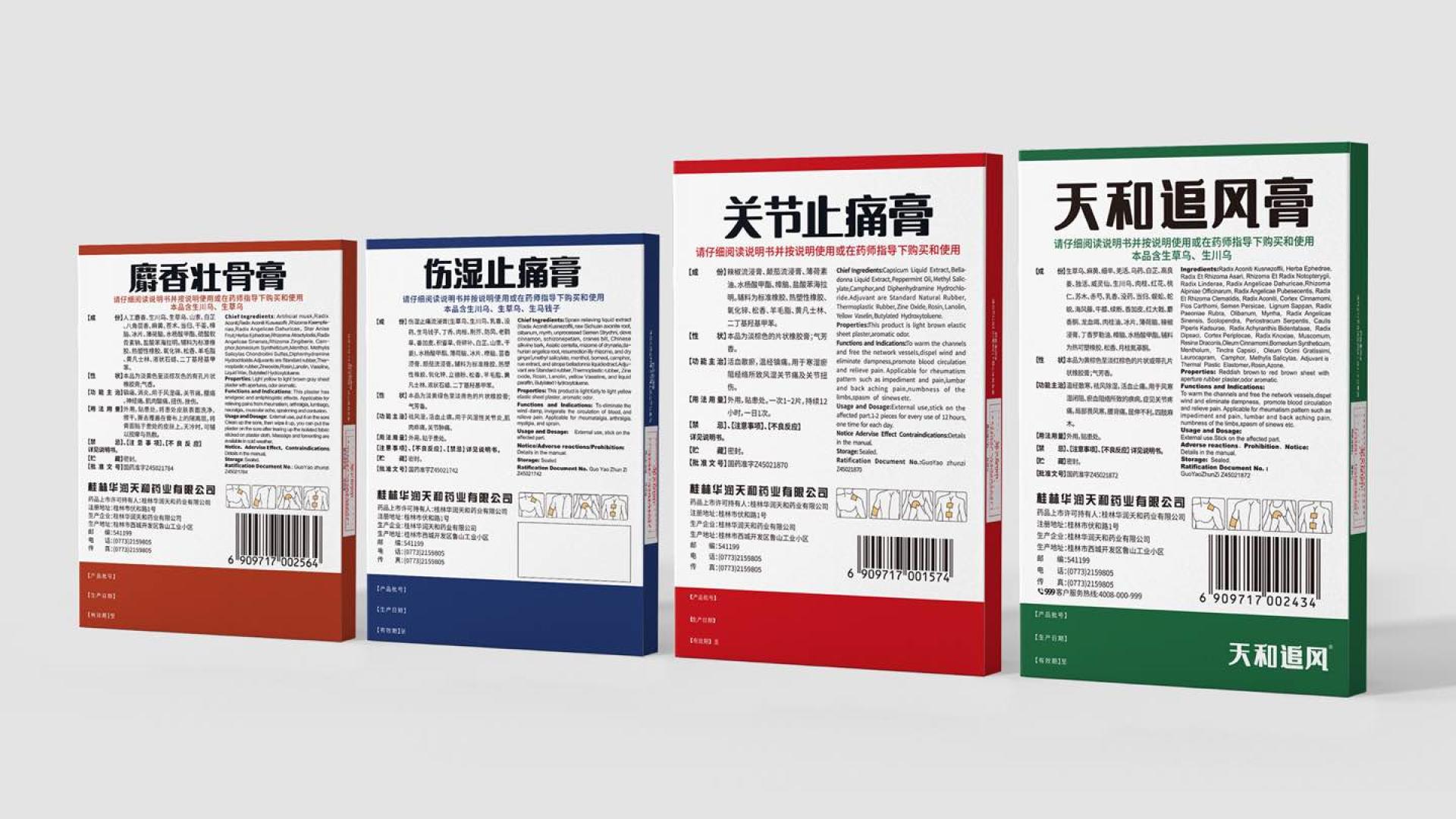 The Tianhe Plaster Series maintains a familiar yet refreshed aesthetic, ensuring consumers instantly associate it with trusted injury relief solutions. The bold use of Chinese characters, including “Zhuang” (strengthening), “Shi” (dampness), “Zhi” (relieving), and “Feng” (wind-cold), reinforces each product’s purpose. Meanwhile, its clear instructional design enhances usability, and the striking color-coding system (red, green, blue, dark blue) boosts shelf visibility.