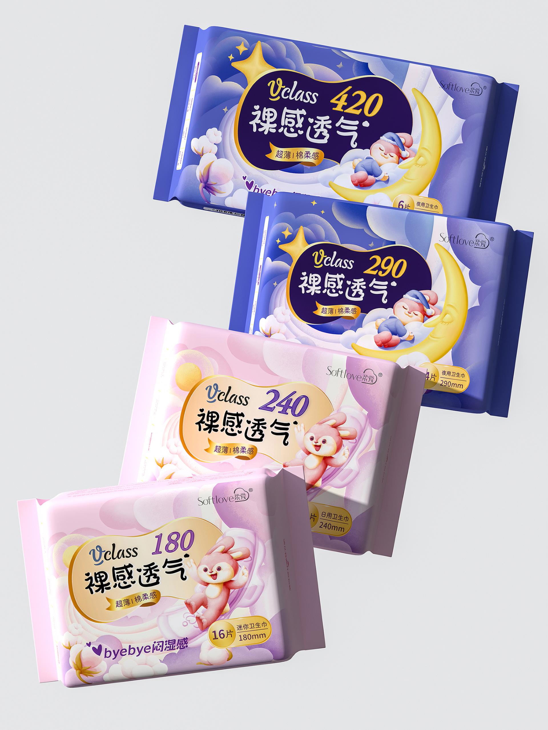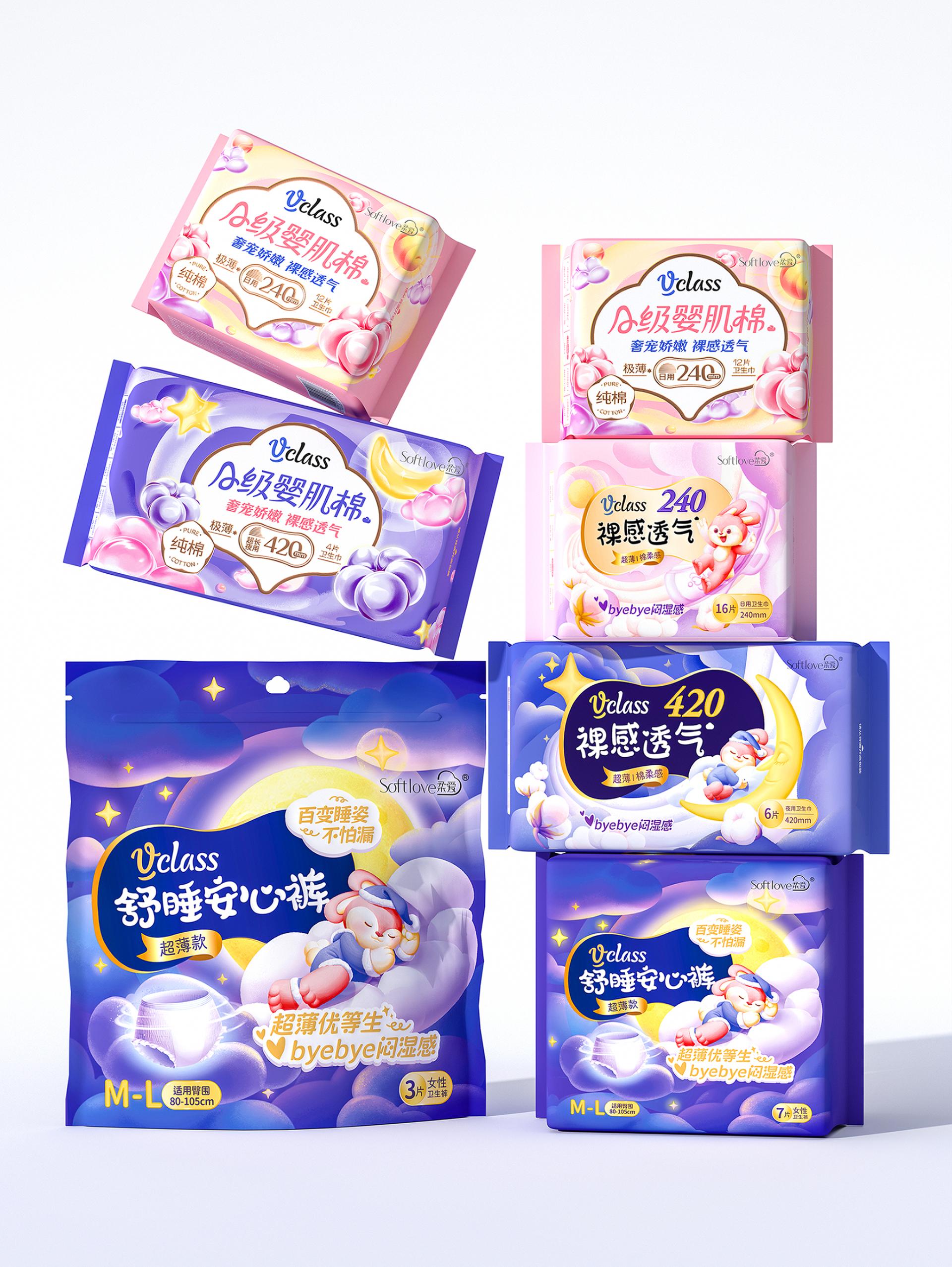 Mind & More was commissioned by the global professional care brand Jiatong Paper Products to expand its female personal care product line by creating a new sub-brand, 「Vclass Weileshi」. The project involved establishing the brand architecture and enriching the product portfolio through systematic visual creation and extensions, including a user-centric color system, emotionally resonant illustrations, and high-recognition visual hammers to unify the three product series.