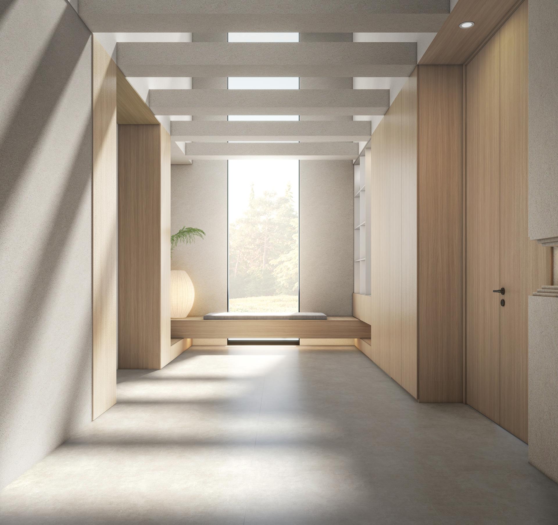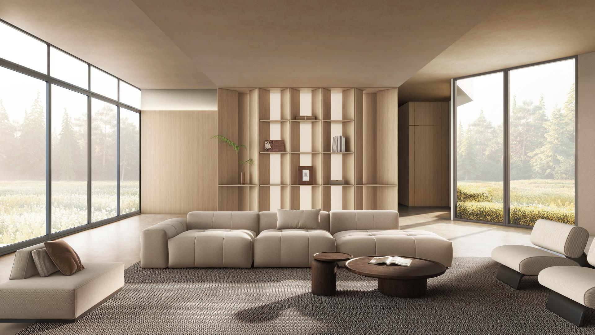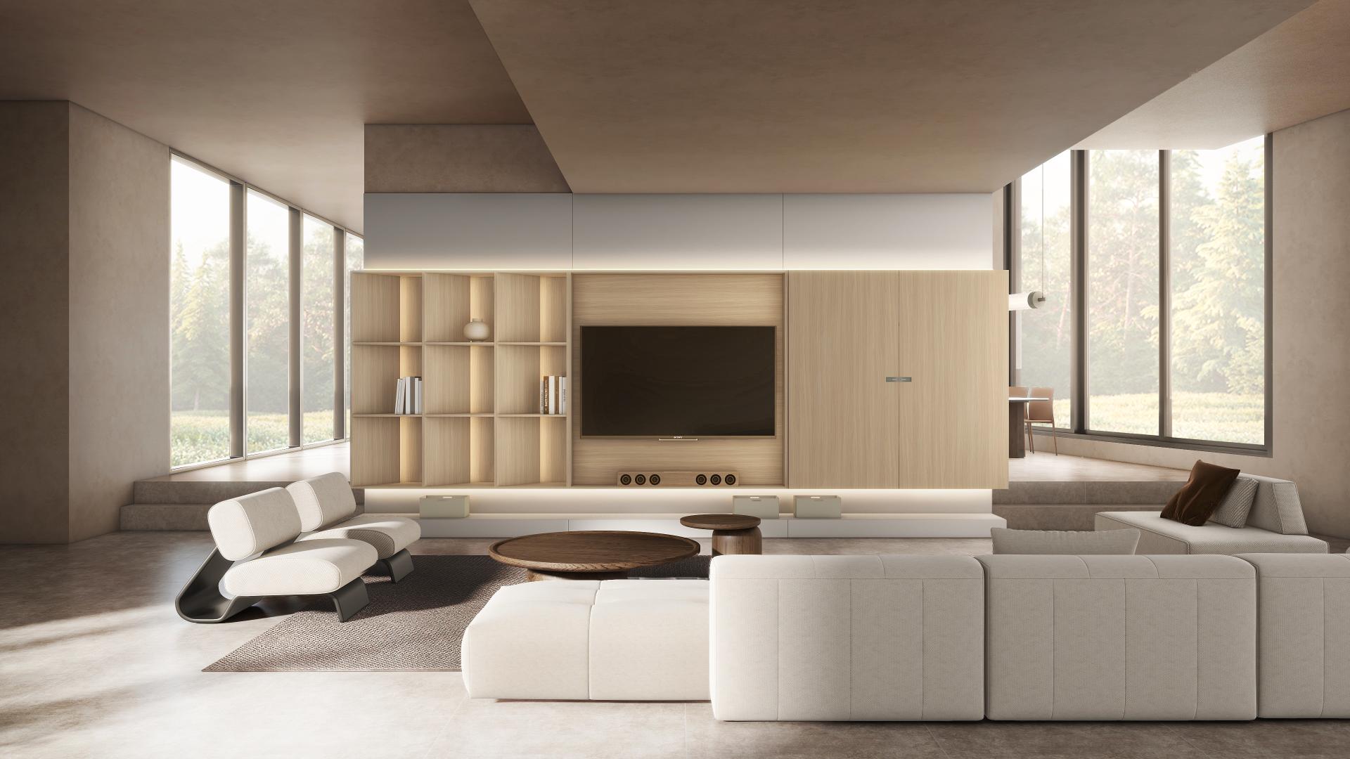 Living Room: Sliding doors interact with minimalist monolithic volumes to fluidly shift between functional modes, embodying quiet strength through design.
