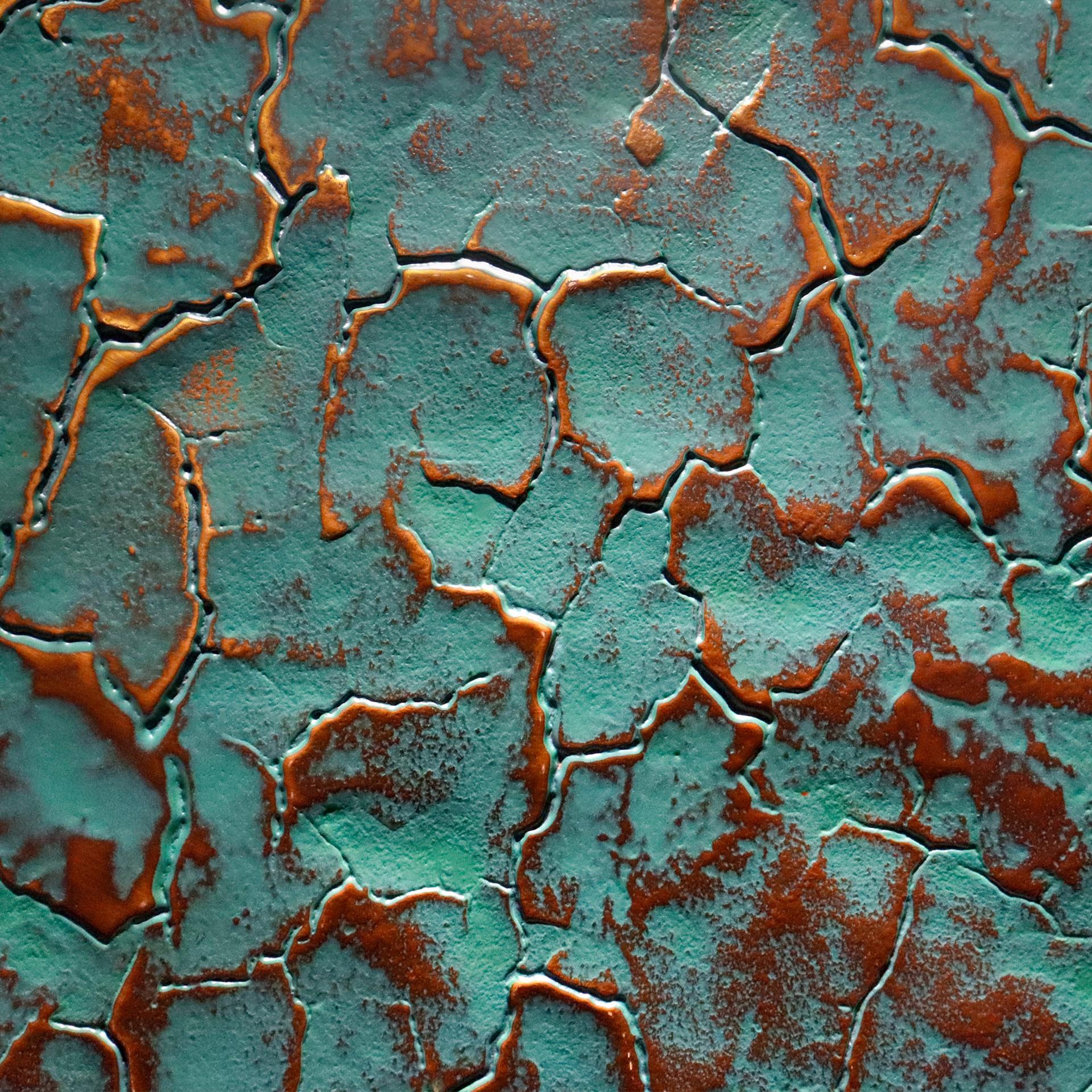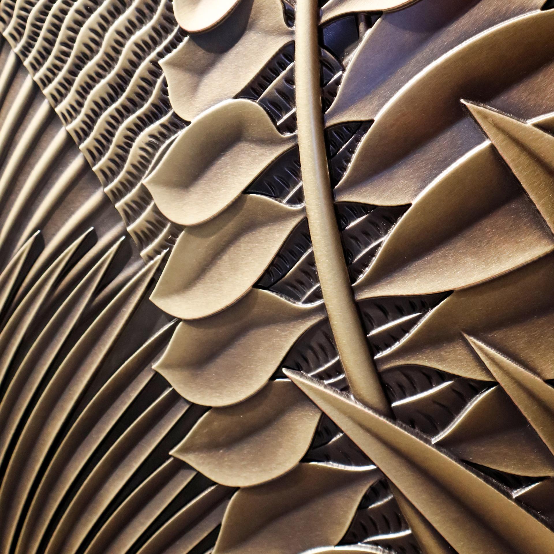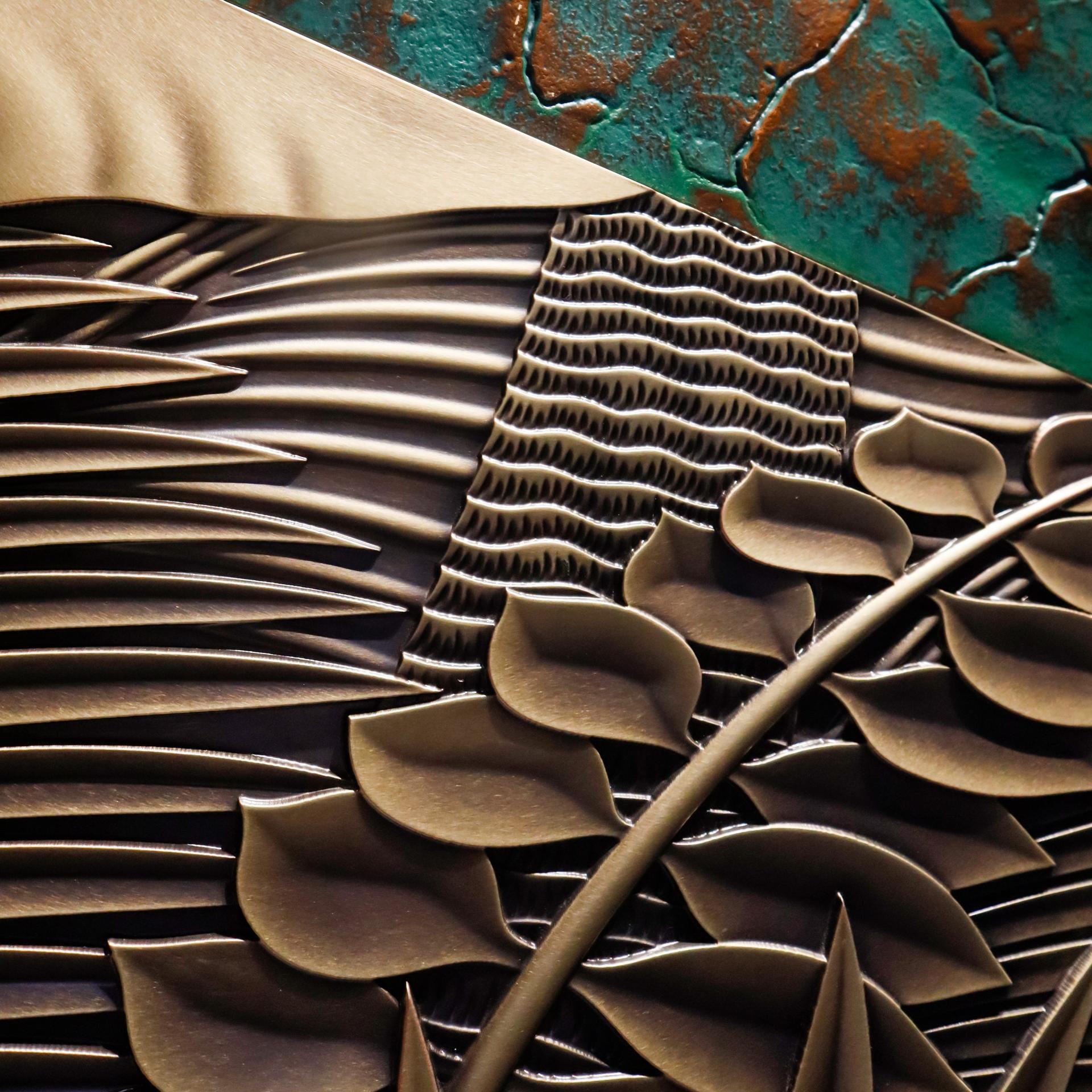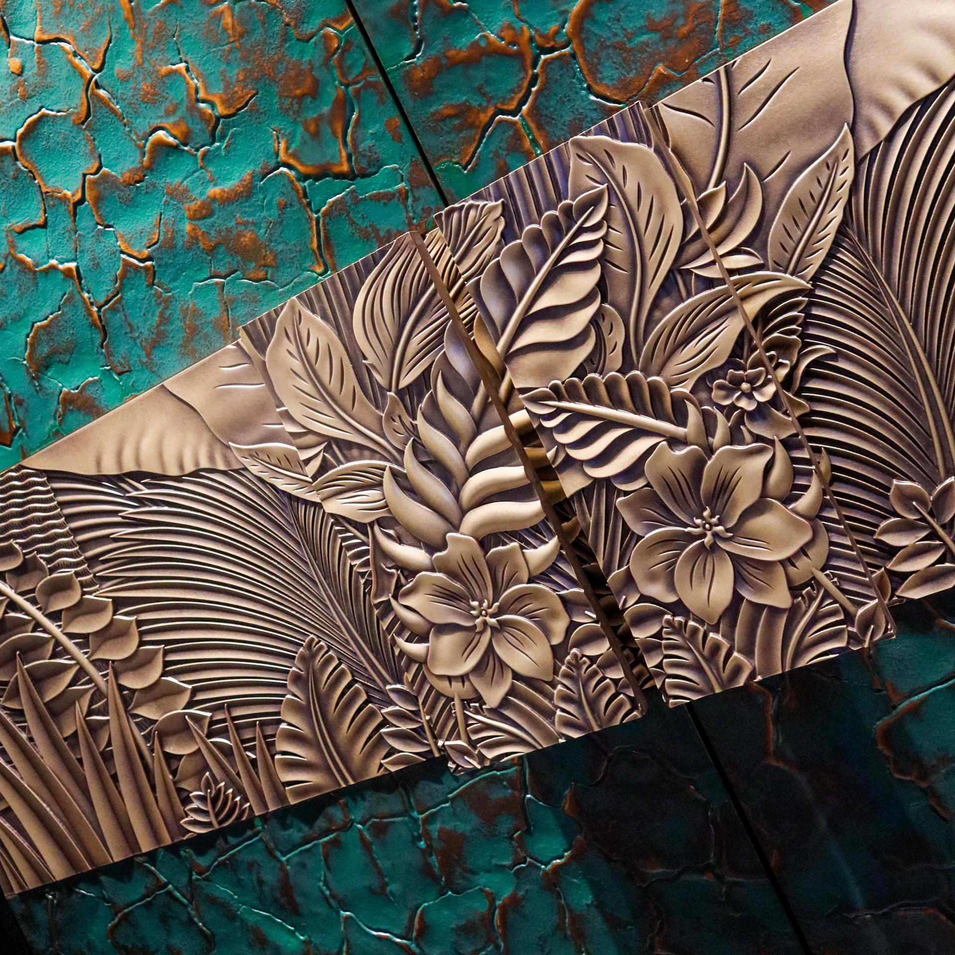 The embossed center—produced through precision CNC German engraving—presents botanical motifs with intricate reliefs of leaves, palm veins, and rhythmic textures, evoking a sense of natural rhythm and ritual dignity. The background mimics ancient tortoiseshell patterns layered over aged green-bronze textures, infusing the piece with historical depth and cultural soul.