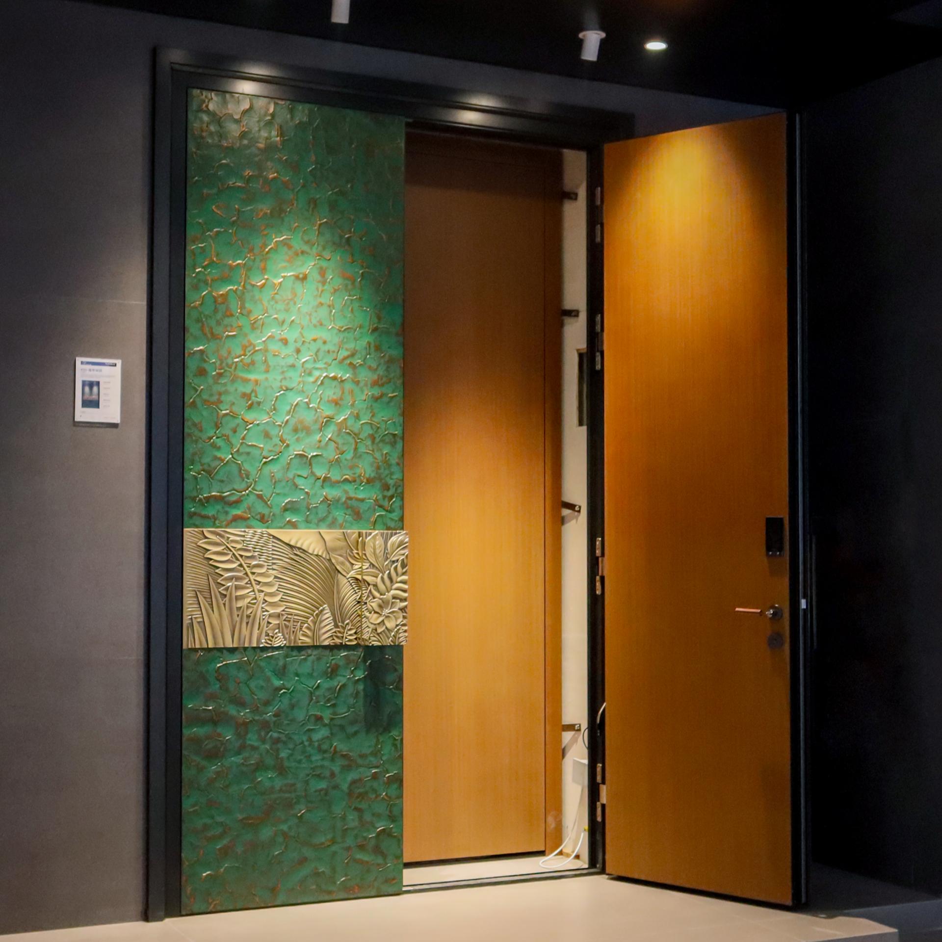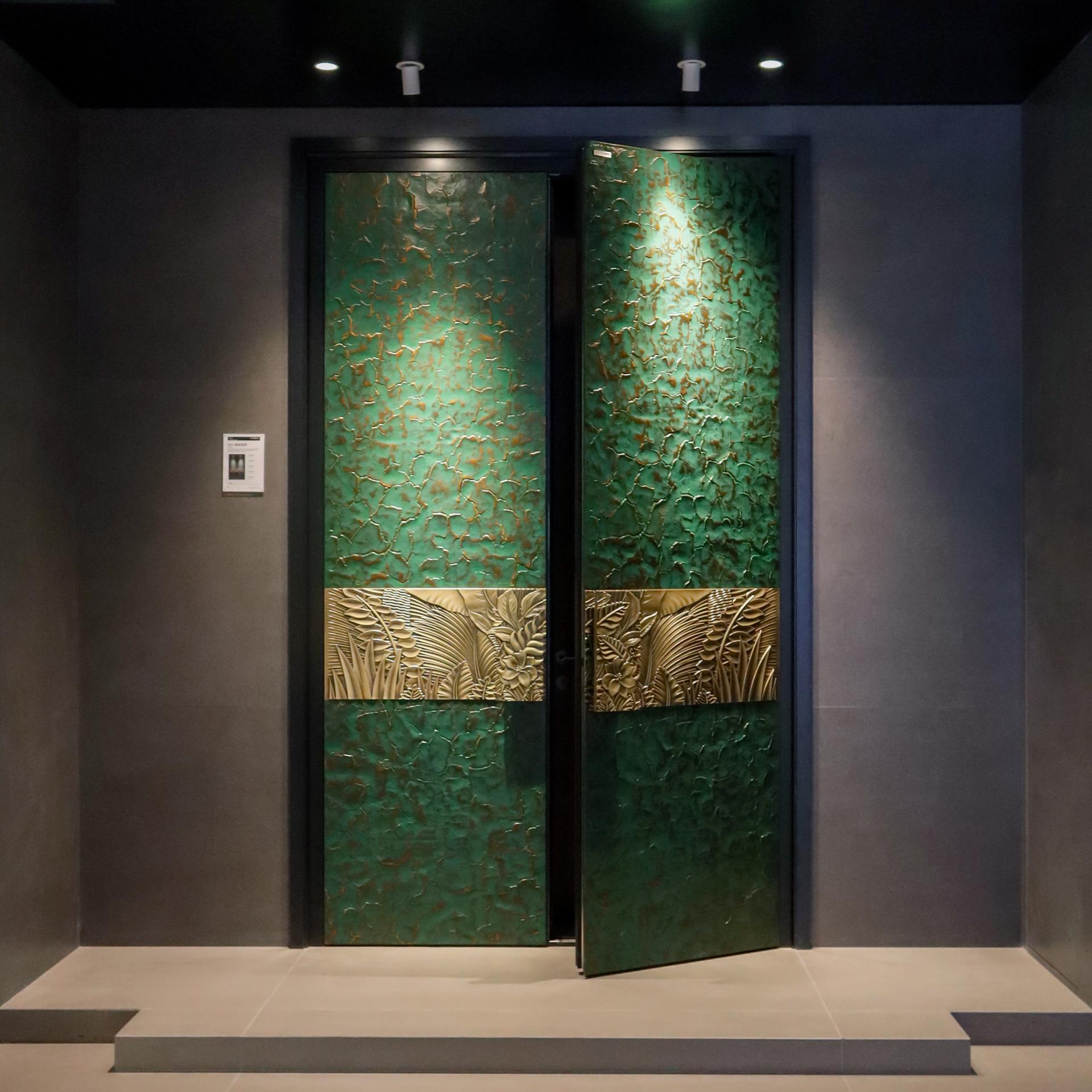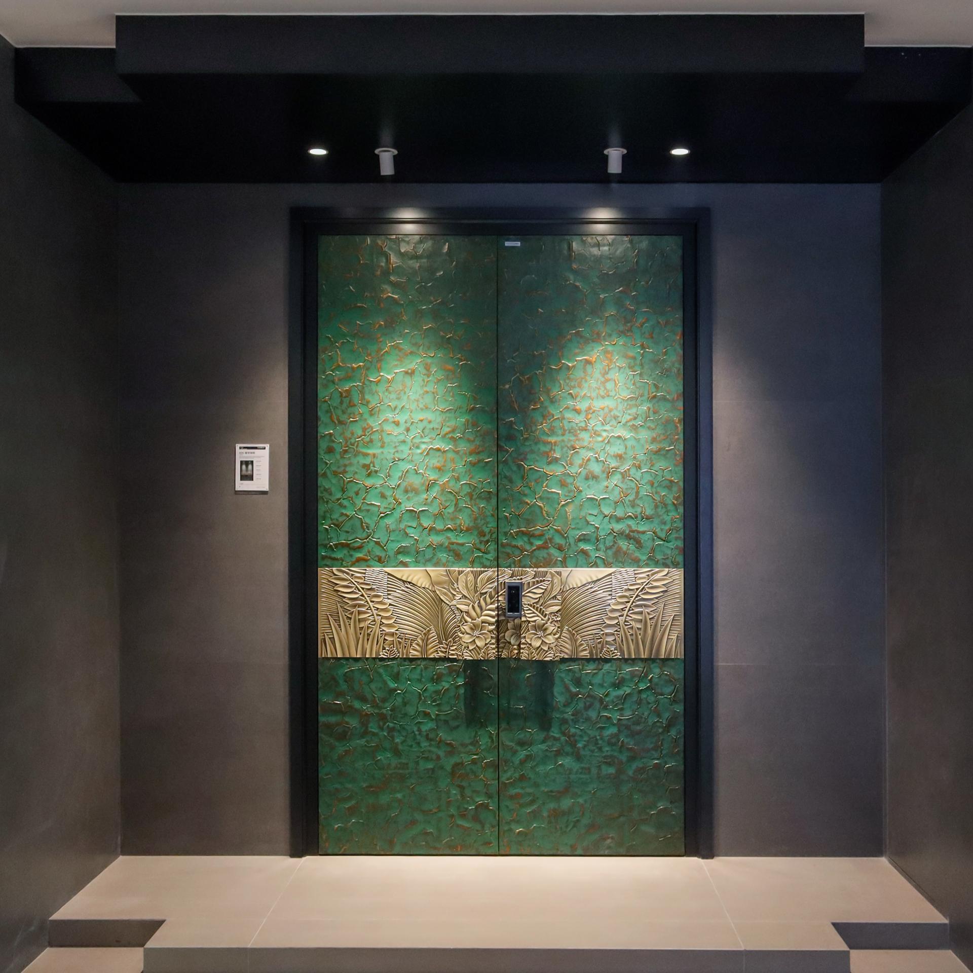 Crafted from aerospace-grade aluminum, the surface finish adopts a custom bronze blend (Molded Bronze 12# + Yellow Bronze 1#), presenting a contemporary sheen while preserving a timeless look. The door handle is custom-forged to match the relief’s tone, completing the visual narrative of “eternal prosperity under bronze light.”