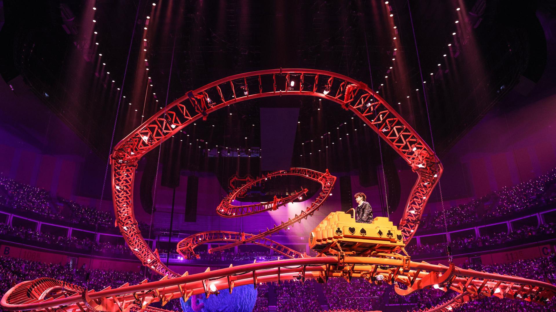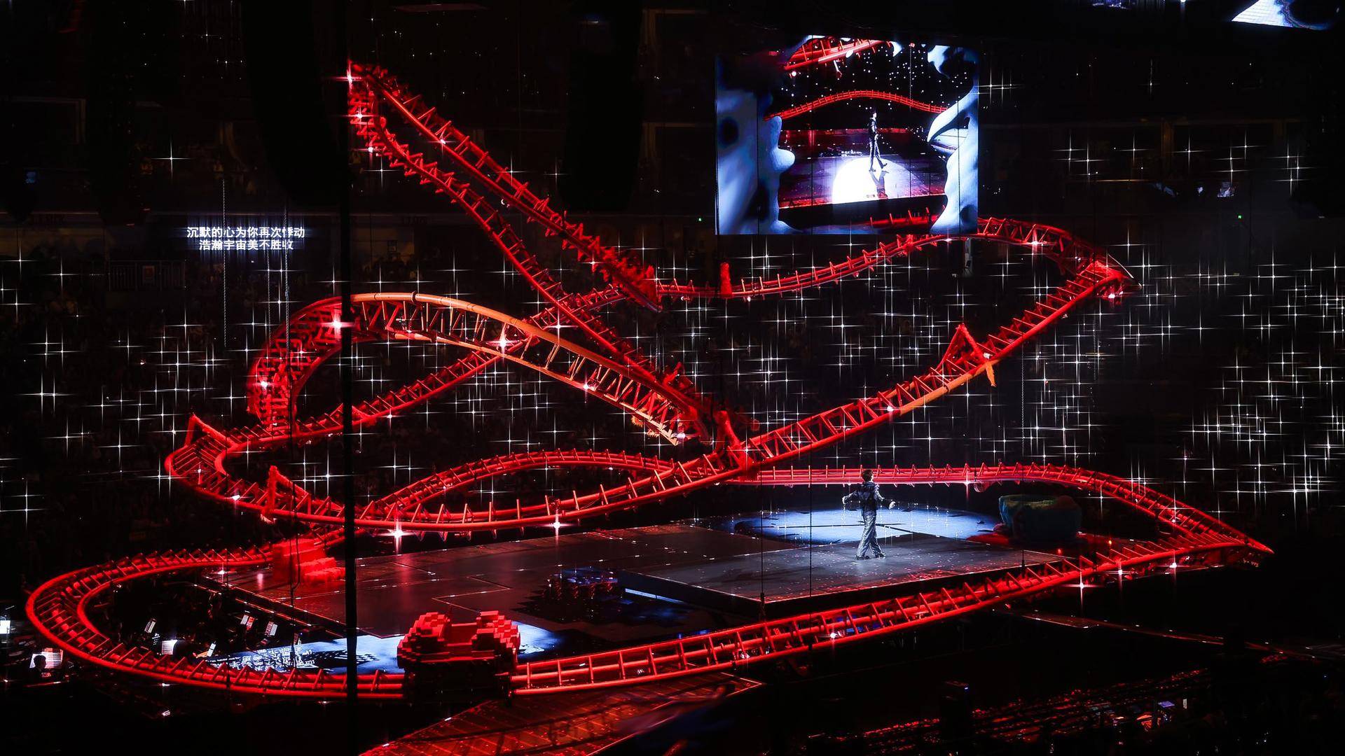 At the heart of the stage lies a massive roller coaster installation—more than a backdrop, it is a functional ride. A 360-degree rotating billboard mimics amusement park signage, while the Mosaic Heart stage expands outward in a radiant pattern, symbolizing boundless emotion. Elevating platforms, a floating Ferris wheel, and suspended islands create a continuously shifting visual landscape, dynamically altering depth and perspective throughout the show. Every structural element balances artistic vision with meticulous engineering, ensuring both spectacle and safety.