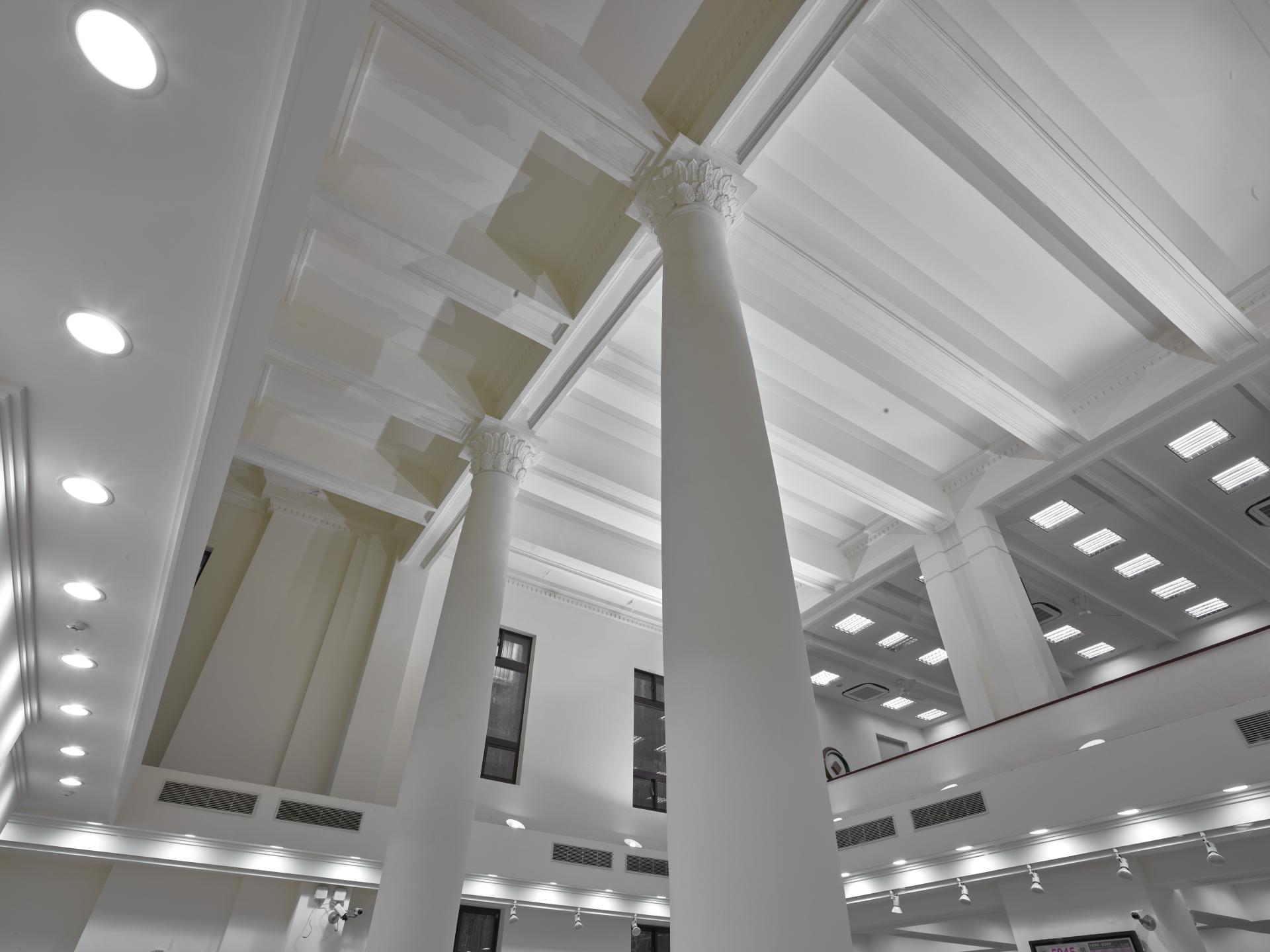 The building reflects Japan’s Taisho-era architecture, influenced by the Western Renaissance style. This trend was widely adopted in government and private buildings. The red brick exterior features horizontal terrazzo bands, pilasters, and a decorative parapet with a central circular relief. Inside, the high-ceilinged hall creates an open, airy ambiance. The structure conveys solidity and elegance, showcasing classical beauty.