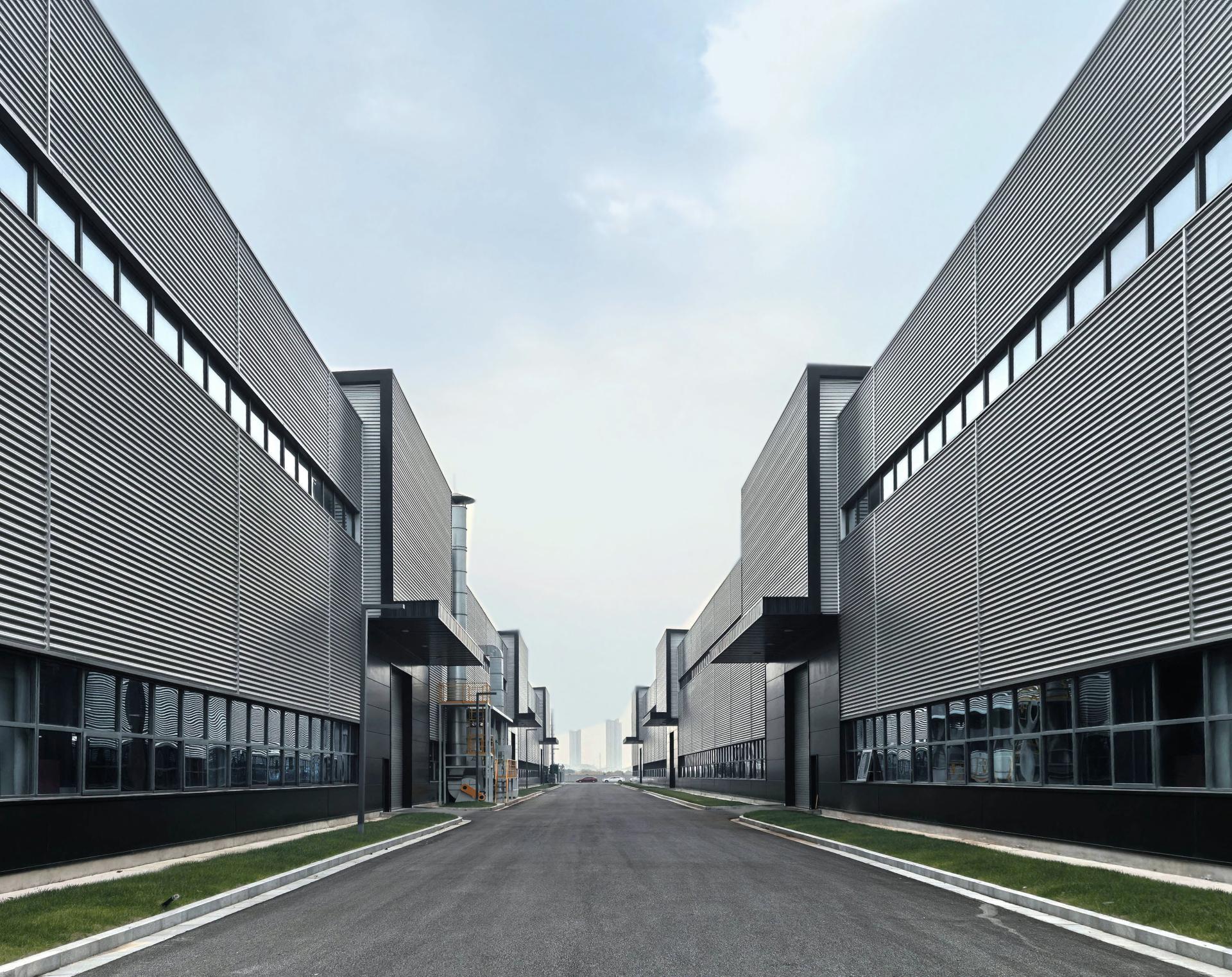 The workshops are designed with the principles of efficiency, energy saving, durability, and aesthetics. They use silver-gray corrugated panels to highlight the sense of technology and fully utilize the large-scale roof to arrange photovoltaic systems, combining practicality with the temperament of high-tech enterprises.