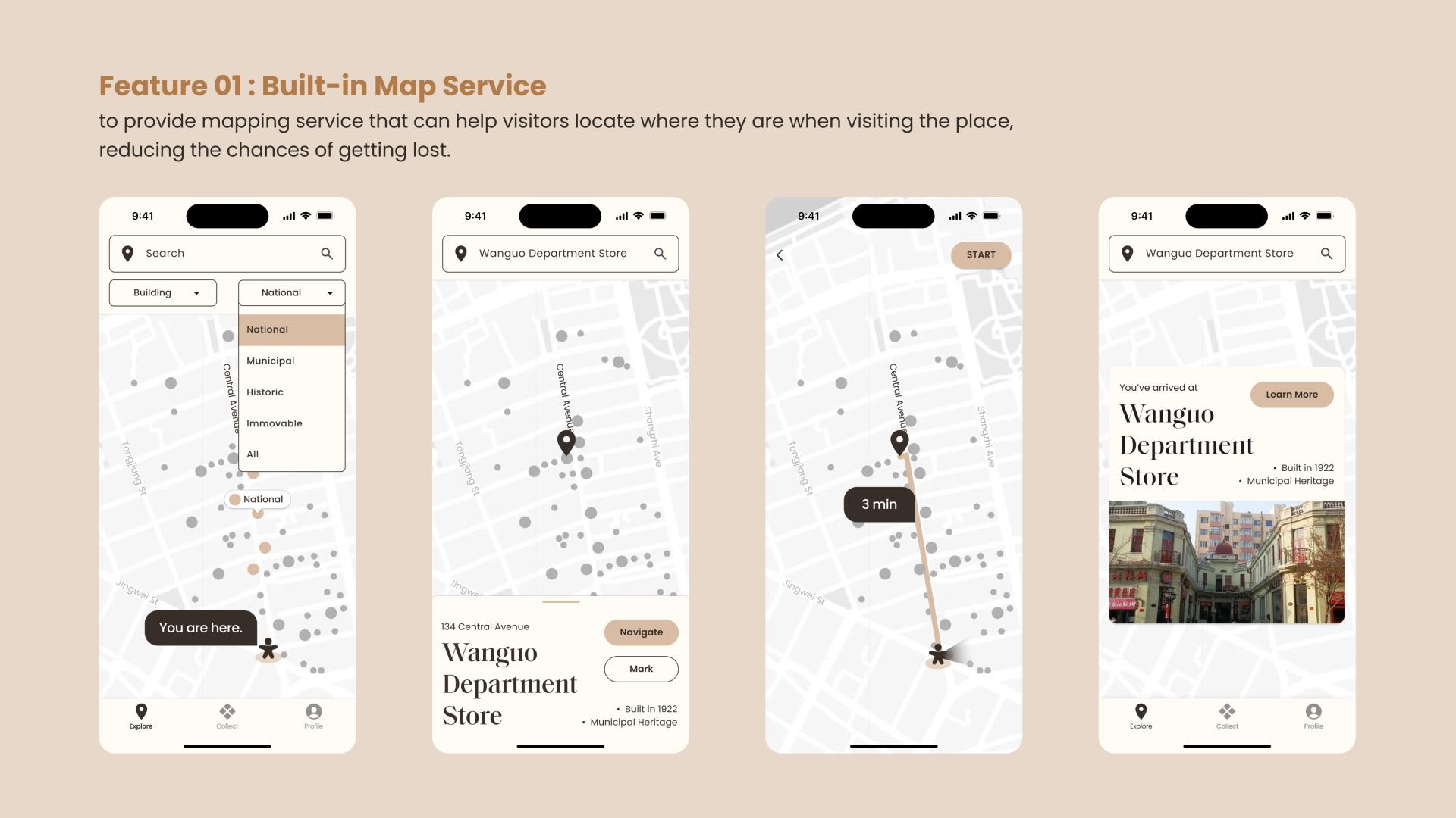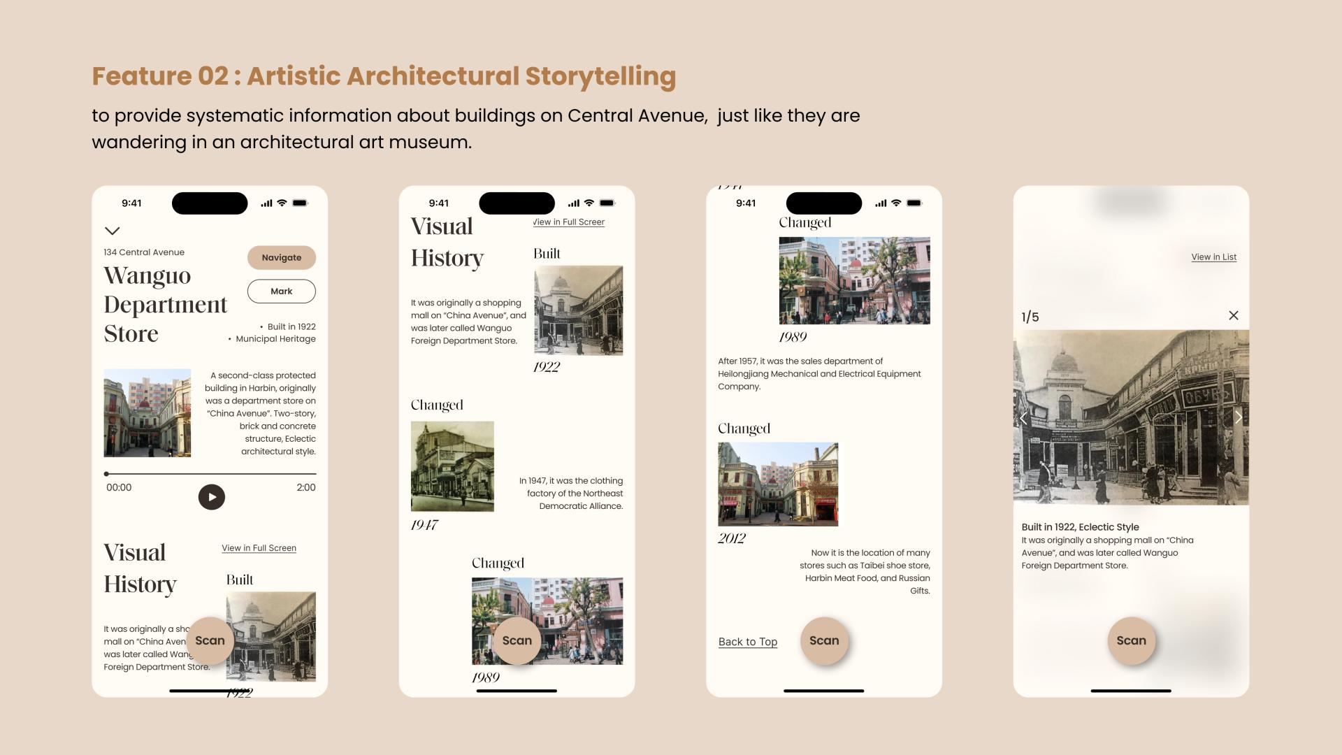 Artistic Architectural Storytelling – Harbin ARcollage provides systematic information in timeline about historic buildings on the avenue, presented in a visual style inspired by “Museum”, to give users the experience just like they are wandering in an open-air architectural exhibition.