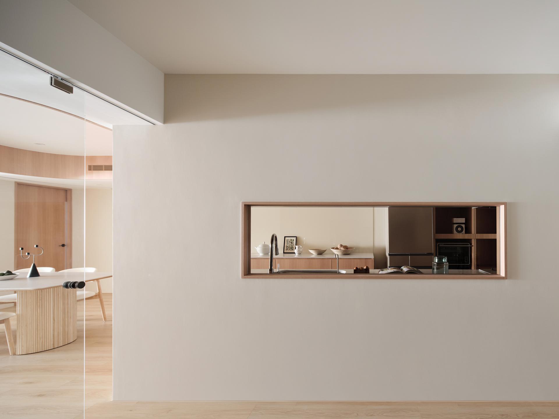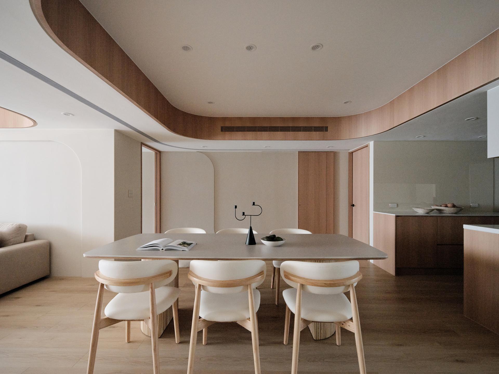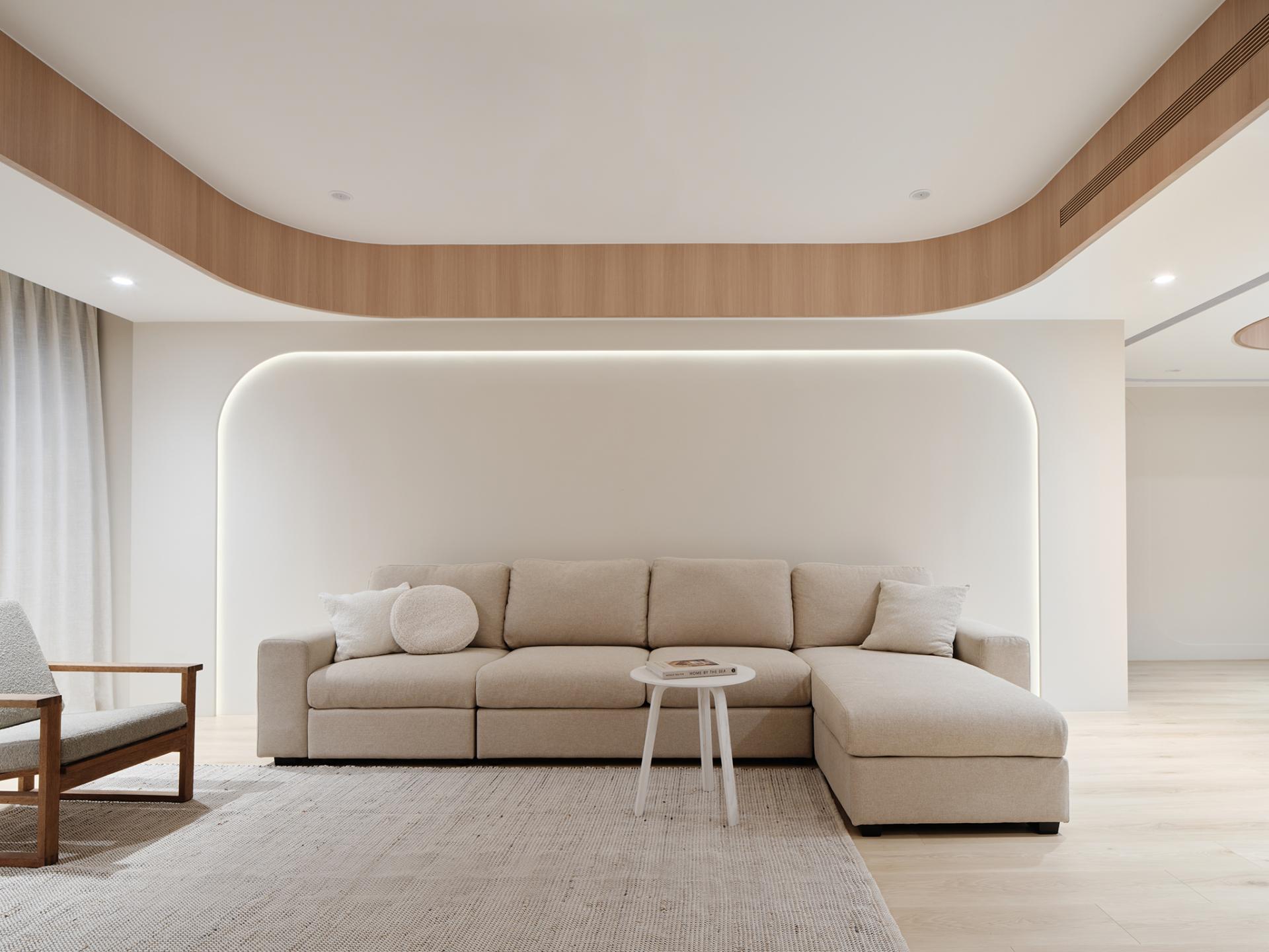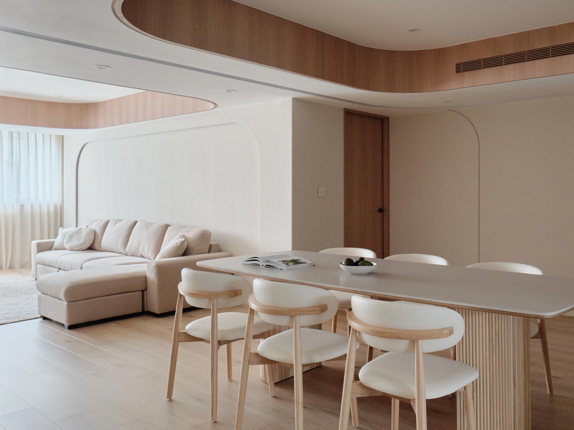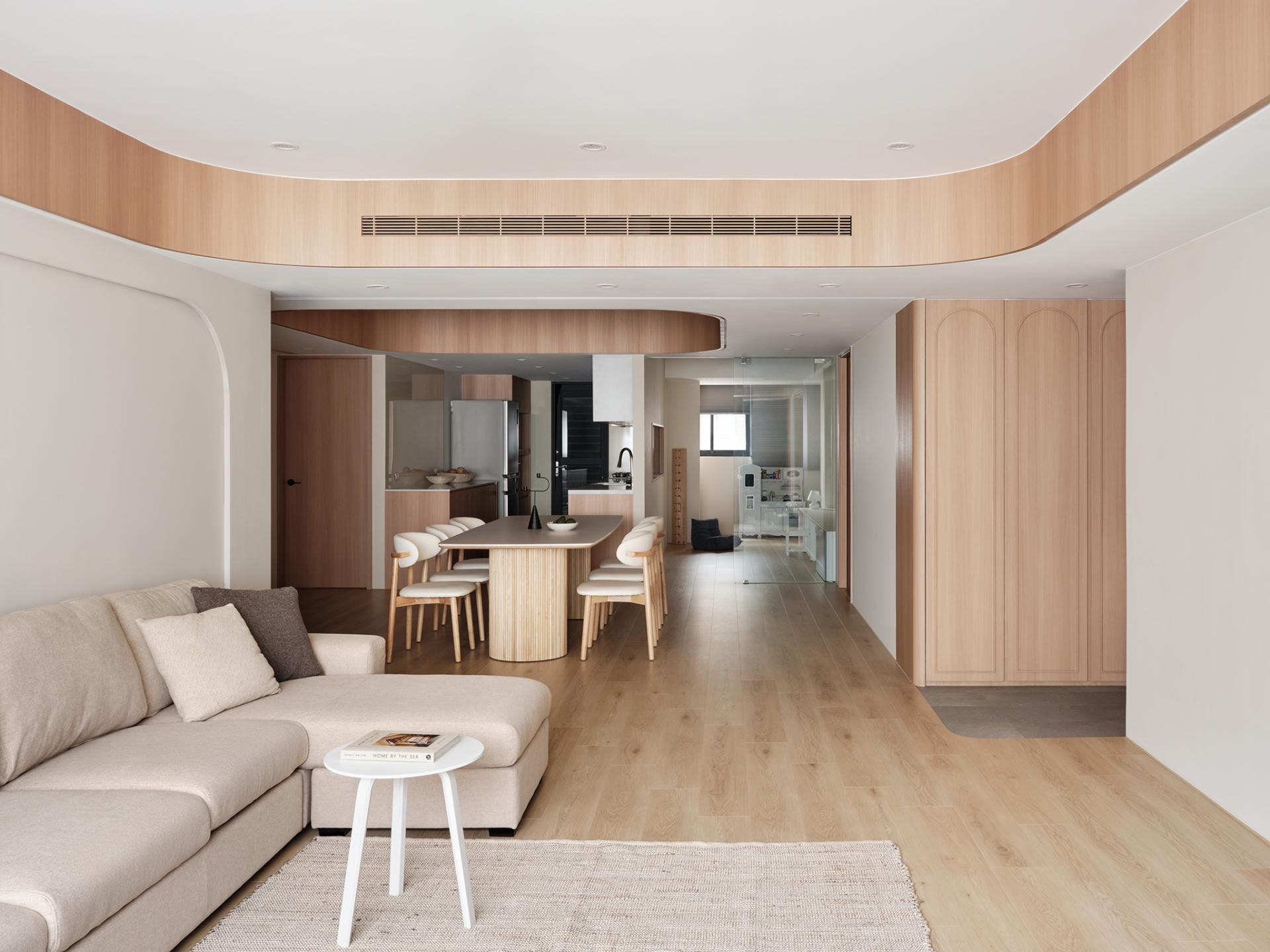 A home is more than just a spatial arrangement; it is where emotions converge. Warm wood textures blend seamlessly with a custom mist-colored wall, laying a rich foundation of warmth. Overhead, a ceiling adorned with wooden lattices and flowing curves creates a rhythmic interplay of depth and light, weaving together memories and movement like a delicate melody.