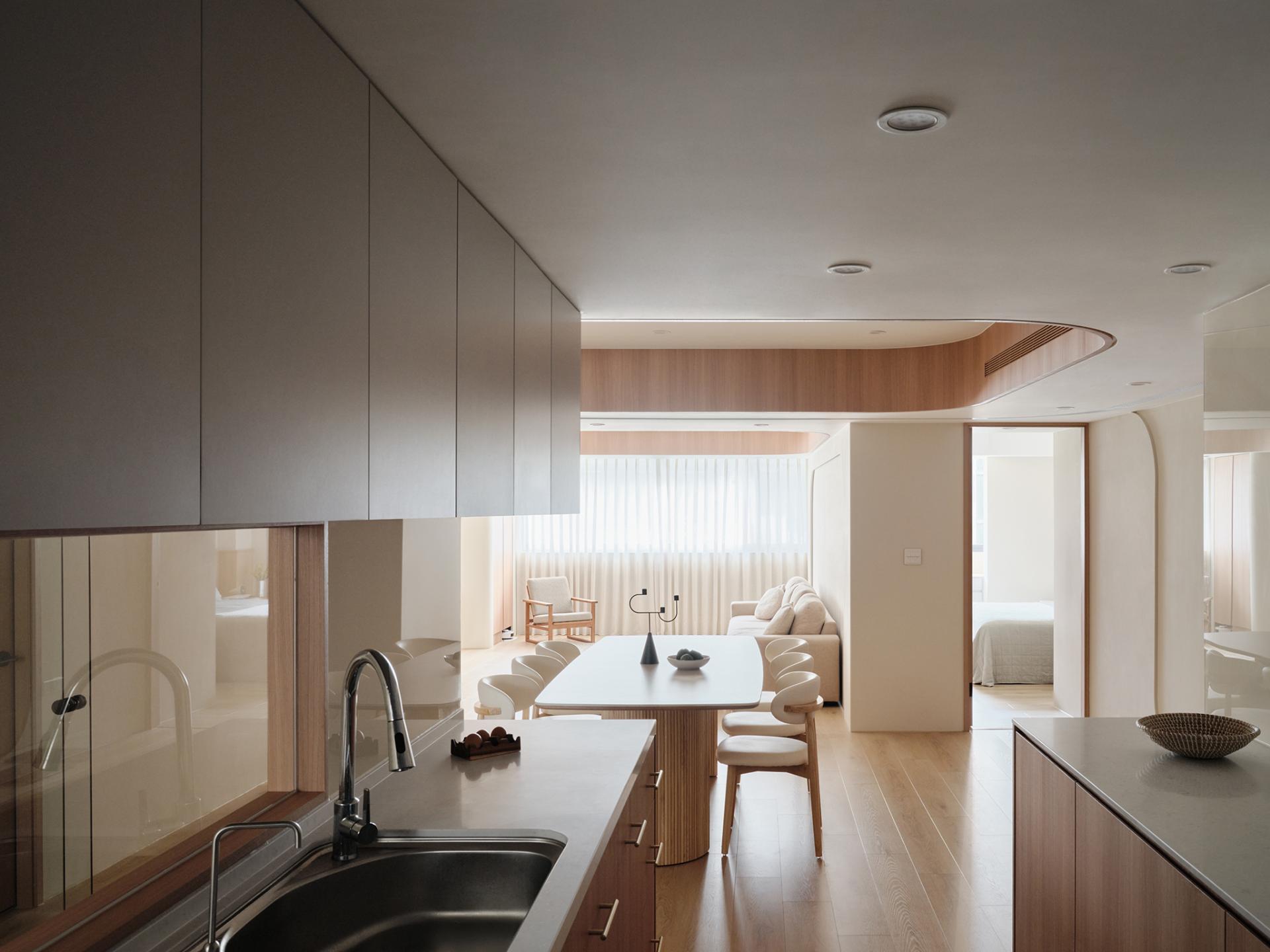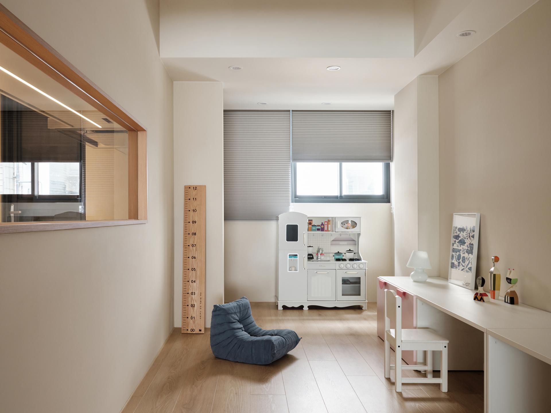 Designed with children at its heart, Luminous Grove harmonizes learning and living. The space embraces nature with wood grain textures and a soft white palette, ensuring that every detail exudes warmth. The open-plan kitchen connects effortlessly with the children’s room, enhancing brightness and comfort, while reinforced soft-close storage solutions maximize functionality to meet everyday needs.