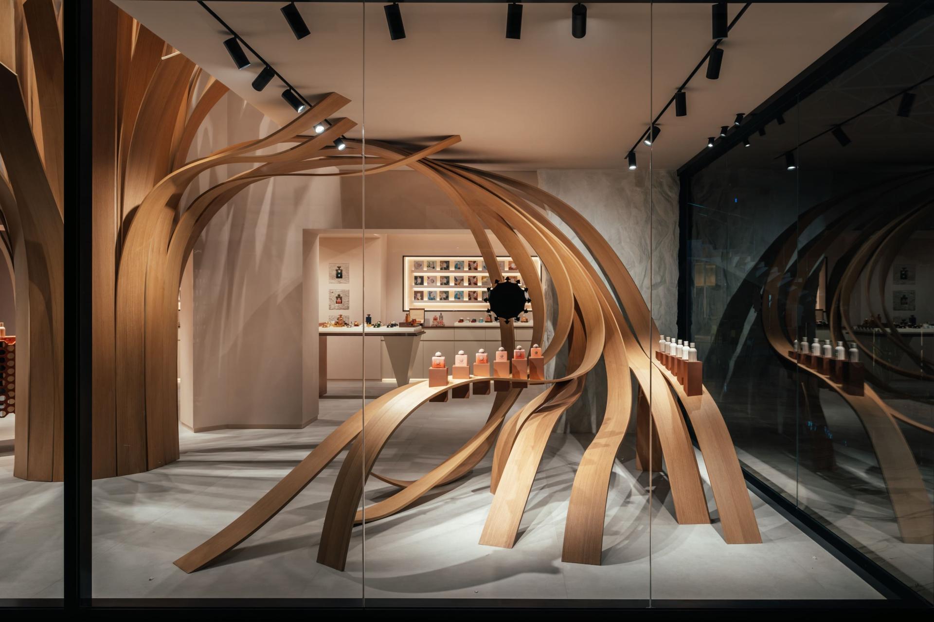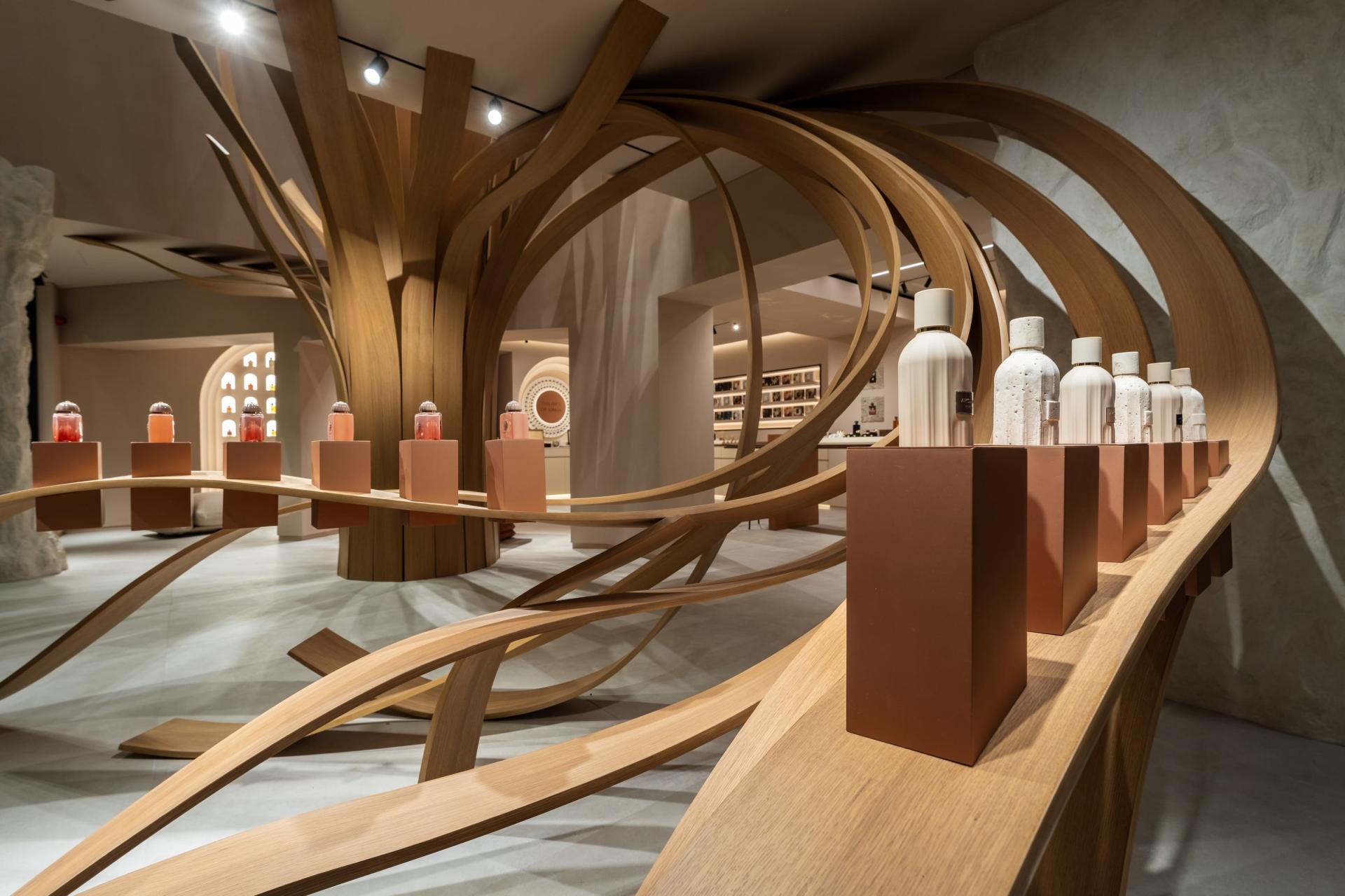 Sustainability is woven into the project: the boutique is 100% powered by rooftop solar panels and is completely plastic-free. All architectural components, including the monumental tree, were produced and hand-assembled locally to reduce transport emissions. The design avoids any temporary point-of-sale displays: the architectural setup alone is strong enough to carry the storytelling and glorify the perfumes. The result is a high-impact, low-carbon flagship.