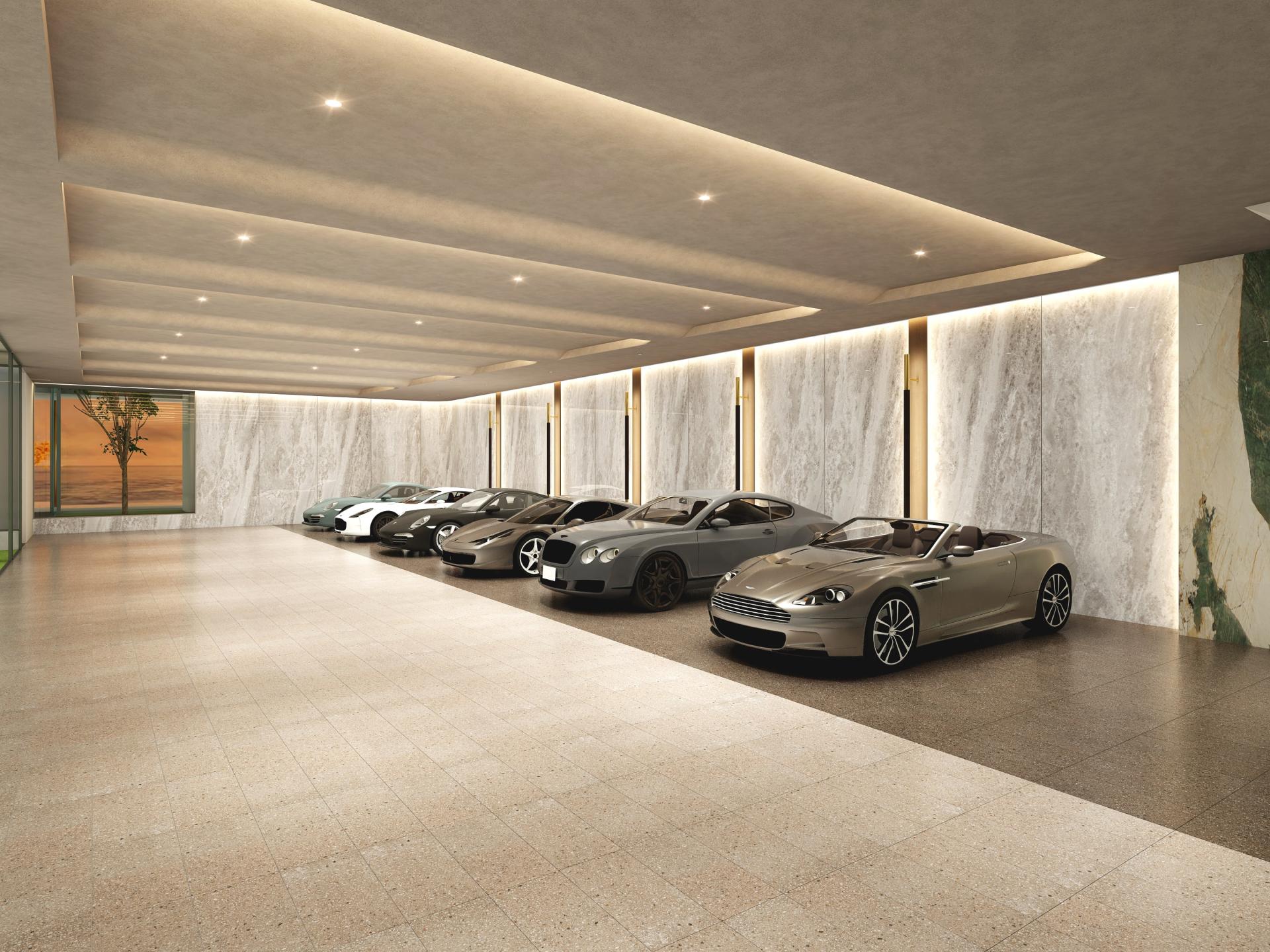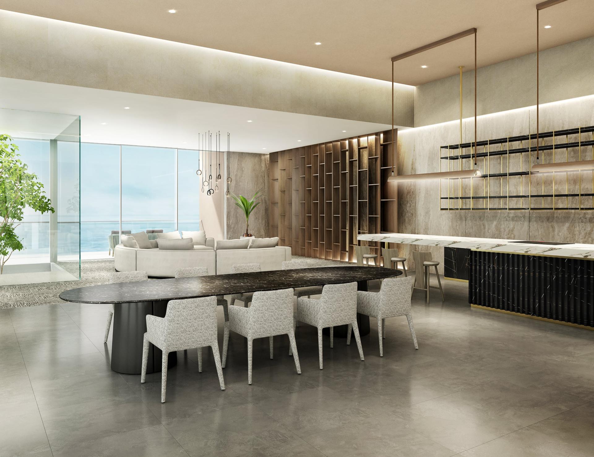 The interior walls are finished in large marble slabs with a dynamic pattern, which gives the house even more impact in its perfect location by the sea.