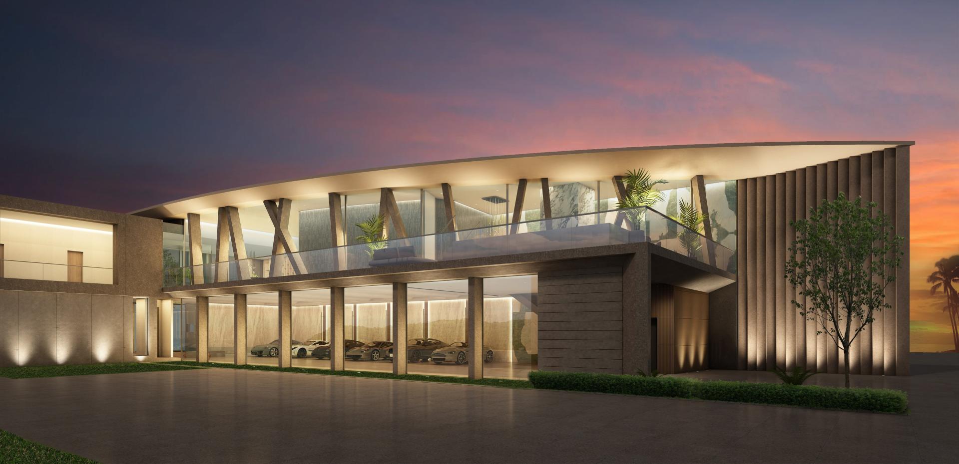 It has a linear, edgy design, as well as softer elements such as the curved roofline and curved glass walls.