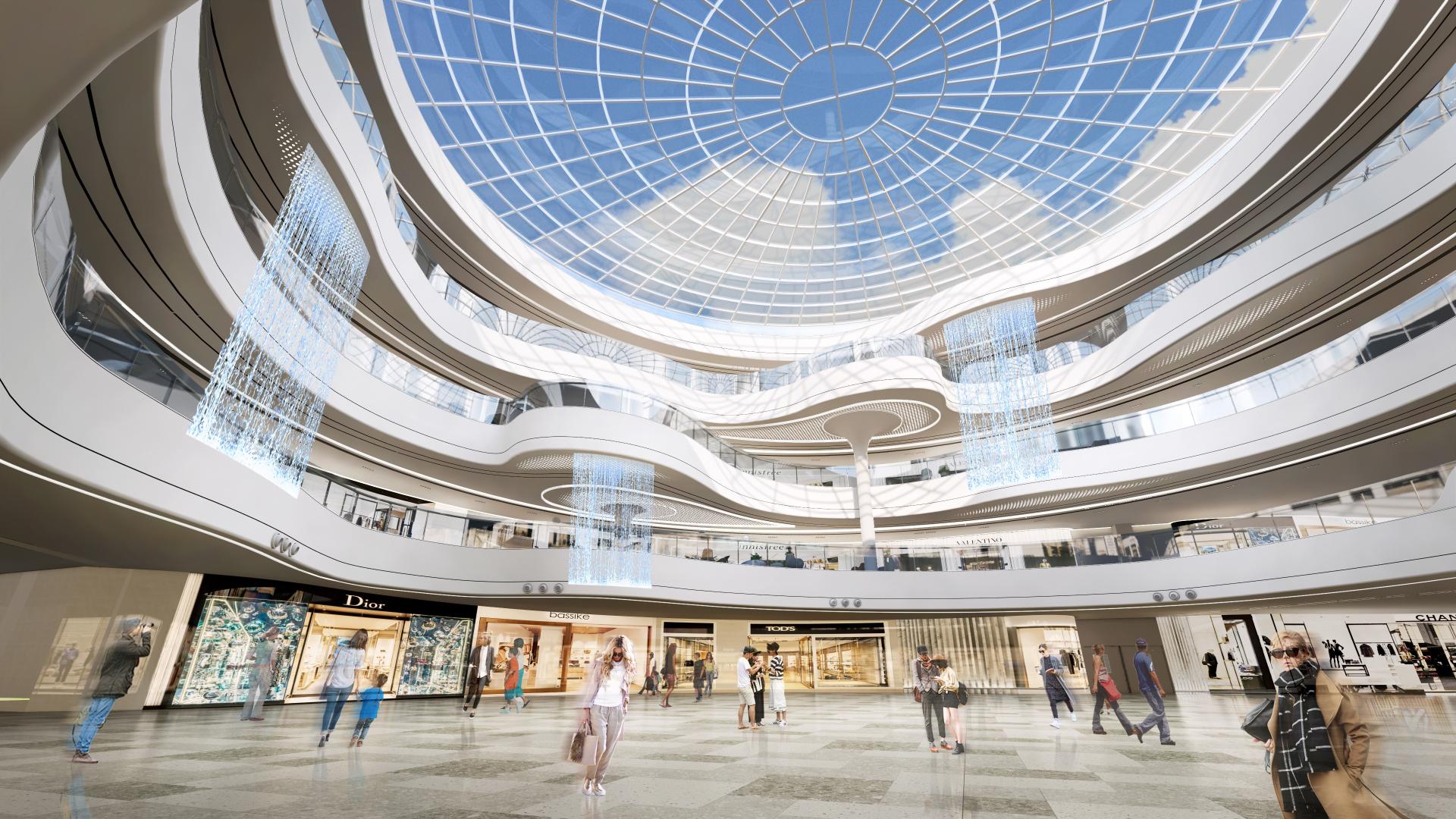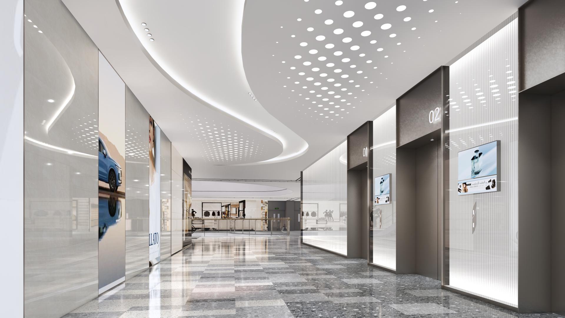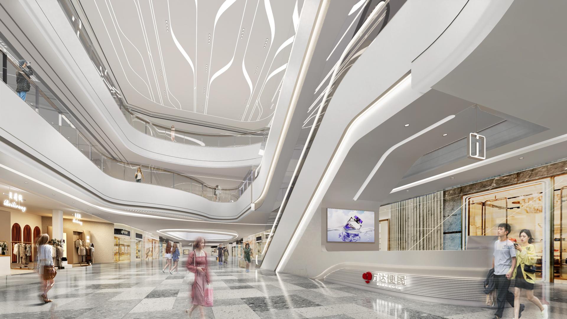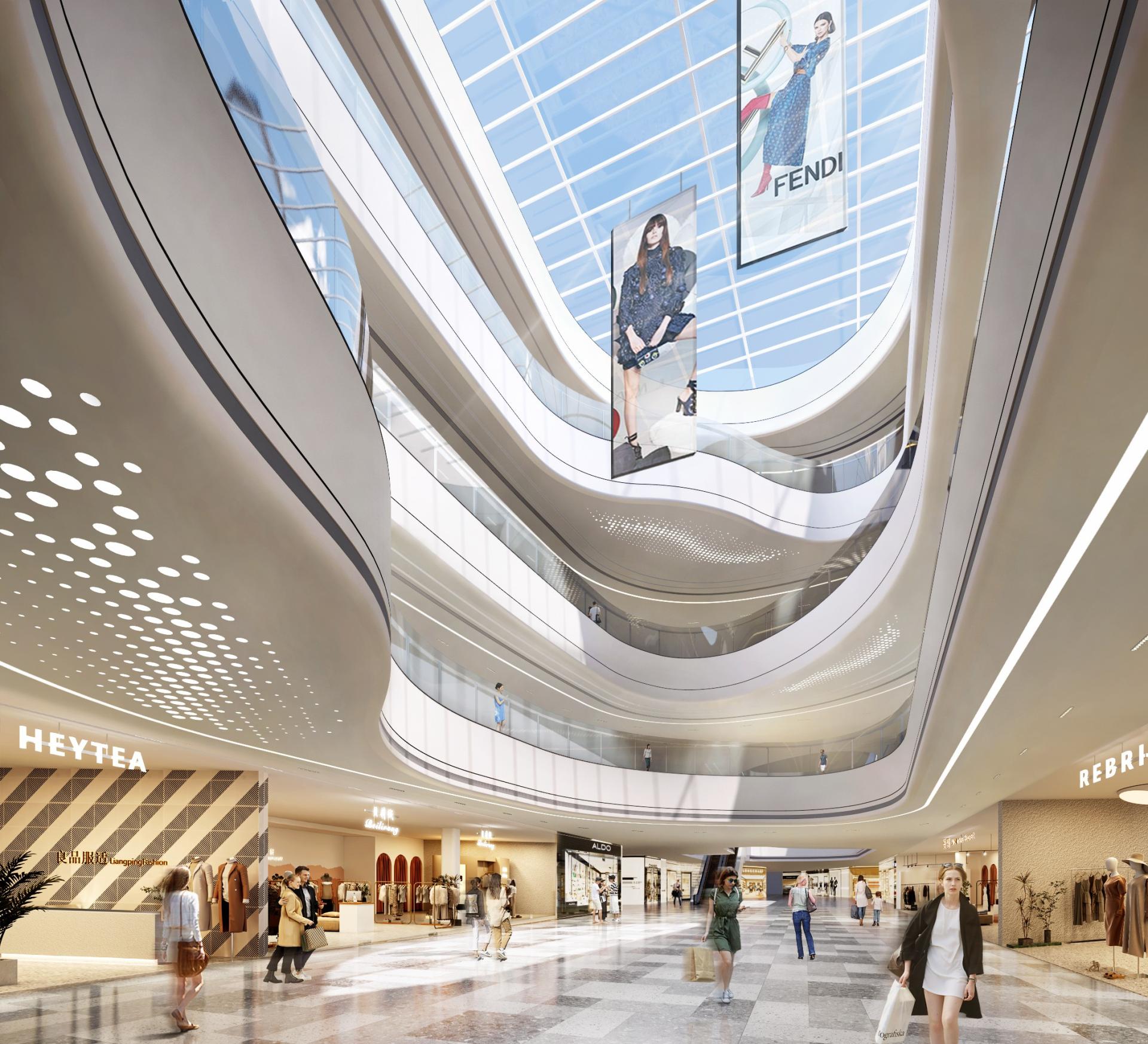 In terms of design aesthetics, a distinctive approach has been adopted—positive shapes (the main forms) represent water, while negative shapes (the voids or recesses) symbolize fish, creating a dynamic relationship between the two elements in the design, supplemented by a simple and cohesive language. The color palette is based in neutral tones such as off-white and light gray, with natural accents to create a clean and elegant ambiance. Meanwhile, a variety of materials, including stone, glass, and metal, add texture and depth to the spatial experience. Thoughtfully designed spatial proportions, along with terraced platforms, enhance the user experience. Moreover, clear functional zoning separates customer-facing areas from non-customer-facing spaces, meeting diverse needs. The design also incorporates well-planned circulation routes to ensure easy access to various commercial zones. By catering to different customer groups, the center offers family-friendly entertainment, lifestyle amenities, and leisure spaces, ensuring a comfortable and enjoyable experience for all. With its unique aesthetic and functional design, Shirong Commercial Center is poised to become a distinctive city landmark.