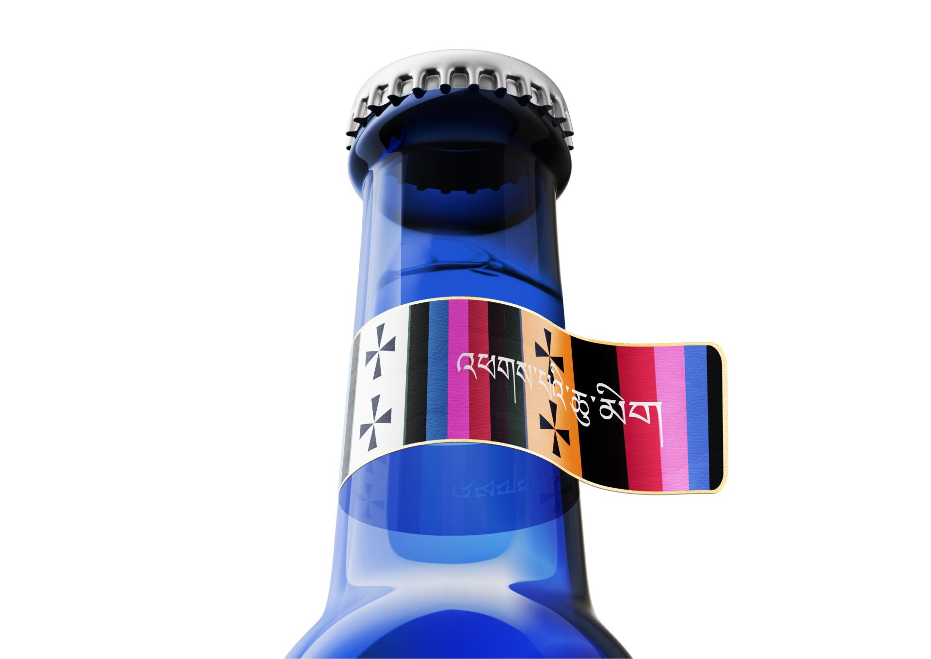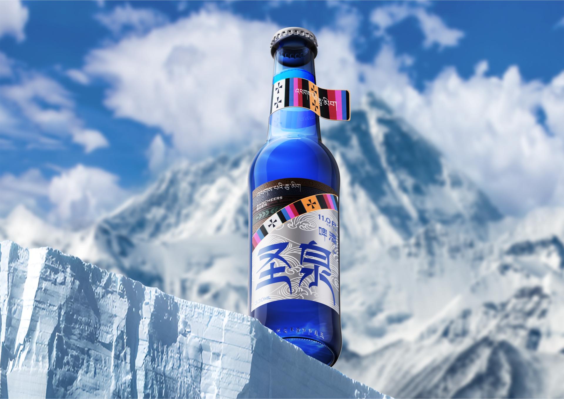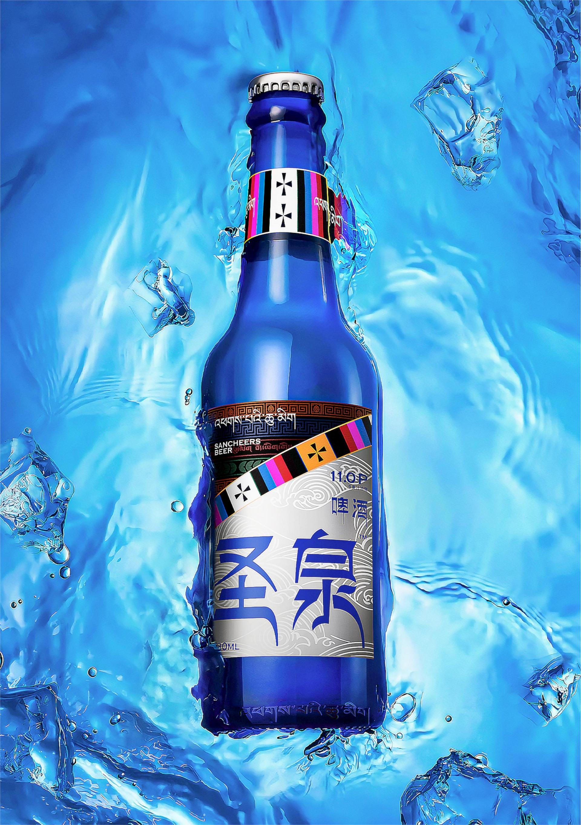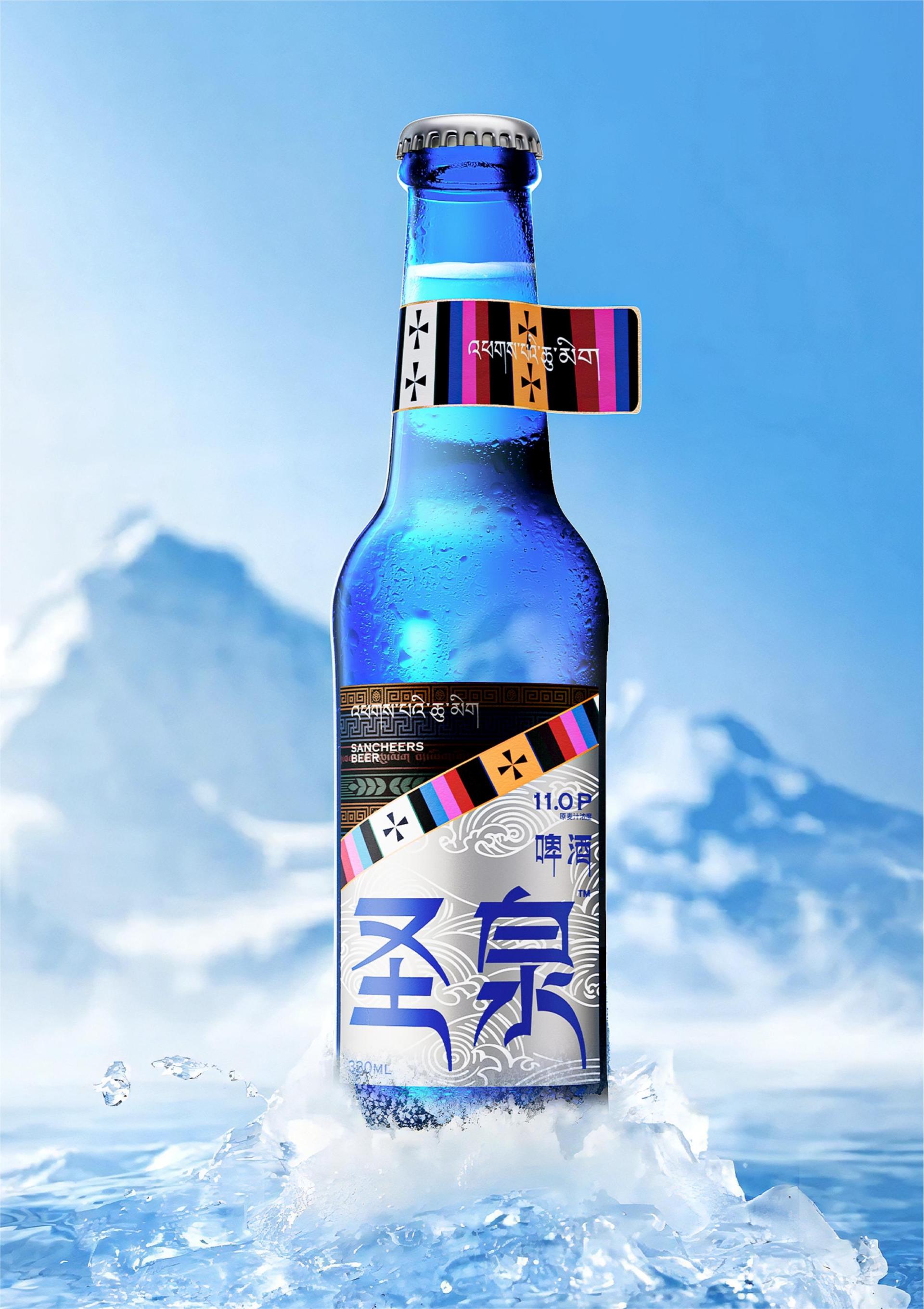 The design pays homage to traditional Tibetan culture through a modern lens, artfully integrating iconic motifs such as the Pulu cross pattern and the auspicious Chinese Hui-character inspired labyrinth motif. The label harmoniously blends Tibetan calligraphy with five-colored prayer flag elements, preserving cultural authenticity while achieving a fashionable, premium appeal. Symbolic representations of hops, wheat, and highland barley highlight the pristine quality of ingredients, inviting consumers to connect with the product’s natural origins. Moreover, the bottle predominantly features a blue color scheme symbolizing the purity of the sacred spring, complemented by a silver cap and water ripple elements to convey the flowing beauty of glacial water.