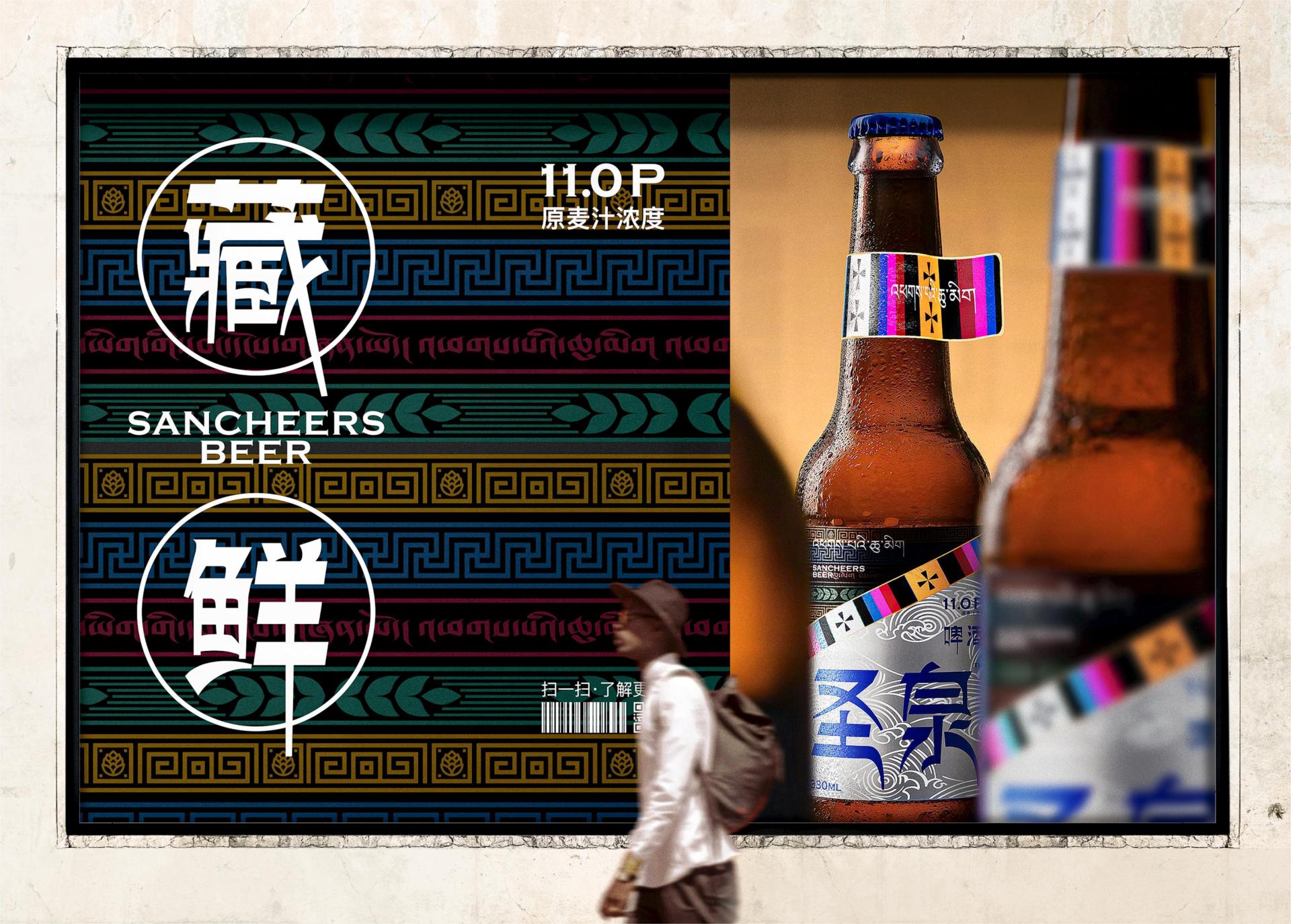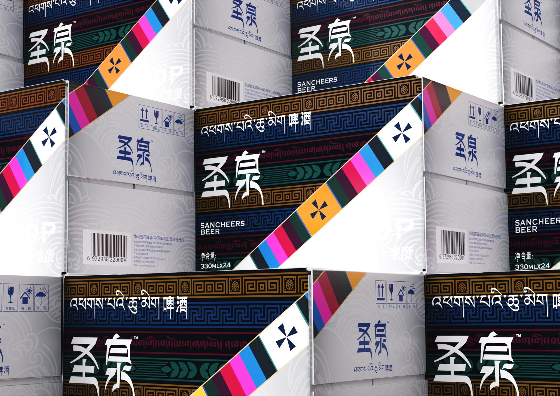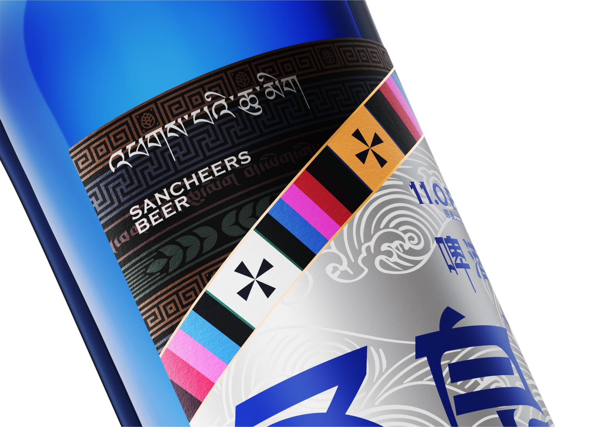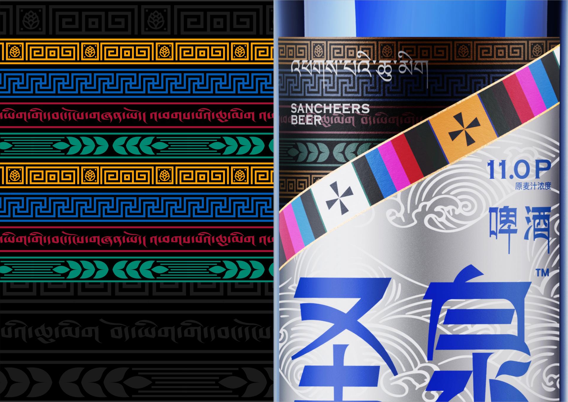 The design pays homage to traditional Tibetan culture through a modern lens, artfully integrating iconic motifs such as the Pulu cross pattern and the auspicious Chinese Hui-character inspired labyrinth motif. The label harmoniously blends Tibetan calligraphy with five-colored prayer flag elements, preserving cultural authenticity while achieving a fashionable, premium appeal. Symbolic representations of hops, wheat, and highland barley highlight the pristine quality of ingredients, inviting consumers to connect with the product’s natural origins. Moreover, the bottle predominantly features a blue color scheme symbolizing the purity of the sacred spring, complemented by a silver cap and water ripple elements to convey the flowing beauty of glacial water.