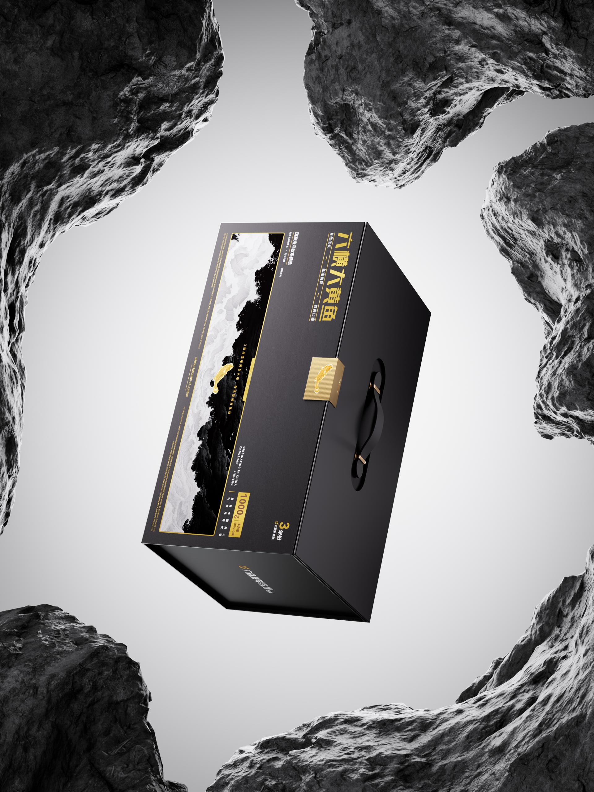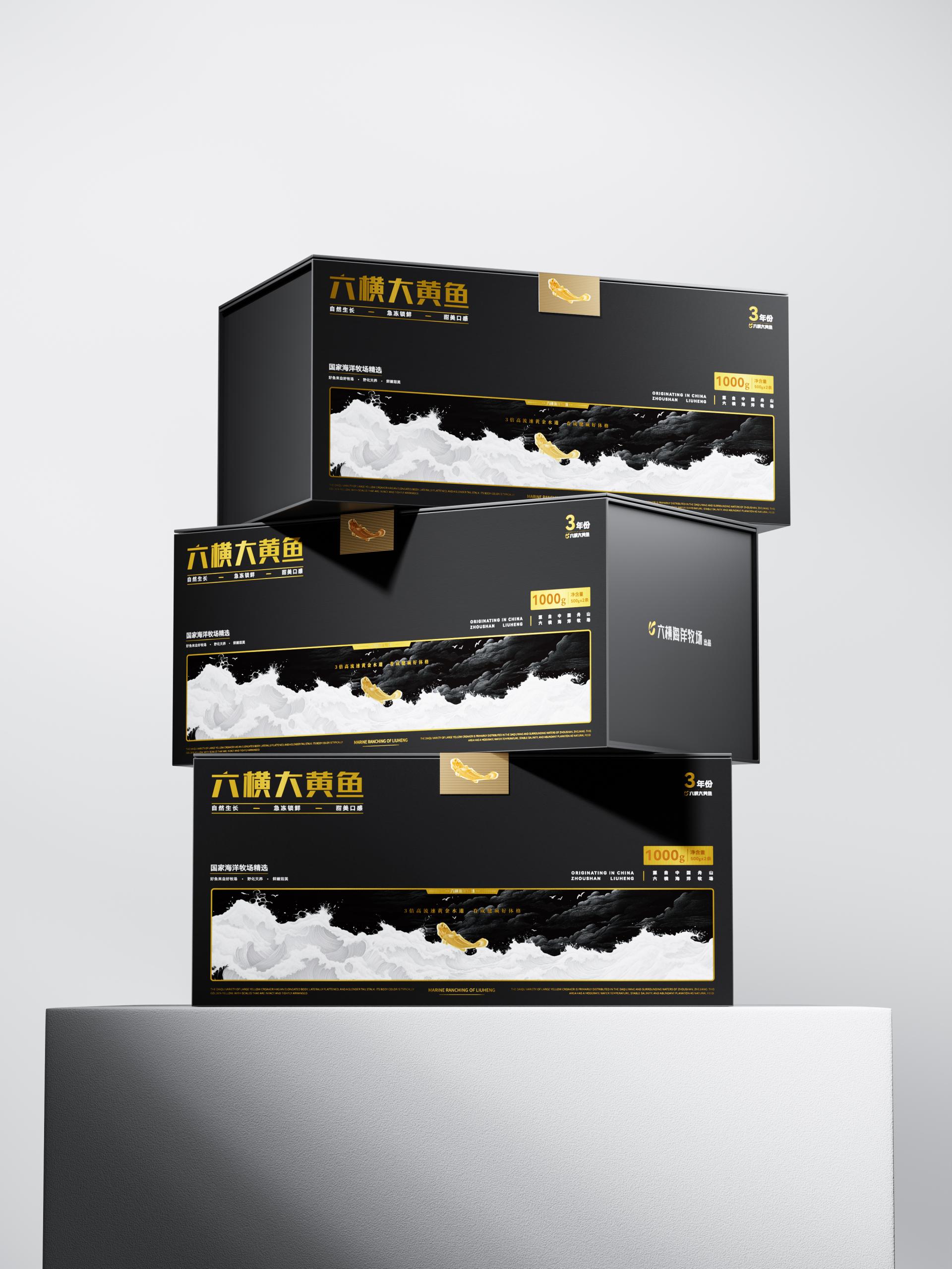 The Liuheng Yellow Croaker thrives in the unique confluence of three rivers, where nature’s perfect conditions converge. Nourished by the region’s fast-flowing golden waterways, clear waters, and abundant natural nutrients, it develops a distinctive umami-rich flavor profile and exceptional texture that set it apart from ordinary varieties. Such rarity calls for packaging that is equally exceptional. The dual-color design tells a visual story: black evokes sophistication and modernity, setting a premium tone for the overall packaging, while gold symbolizes luxury and prestige, echoing the golden hue of the yellow croaker itself to reinforce the visual connection between the product and its presentation. Together, these elements not only enhance the depth and visual layering of the packaging but also imbue the product with an aura of refined elegance, significantly boosting its recognizability and appeal.