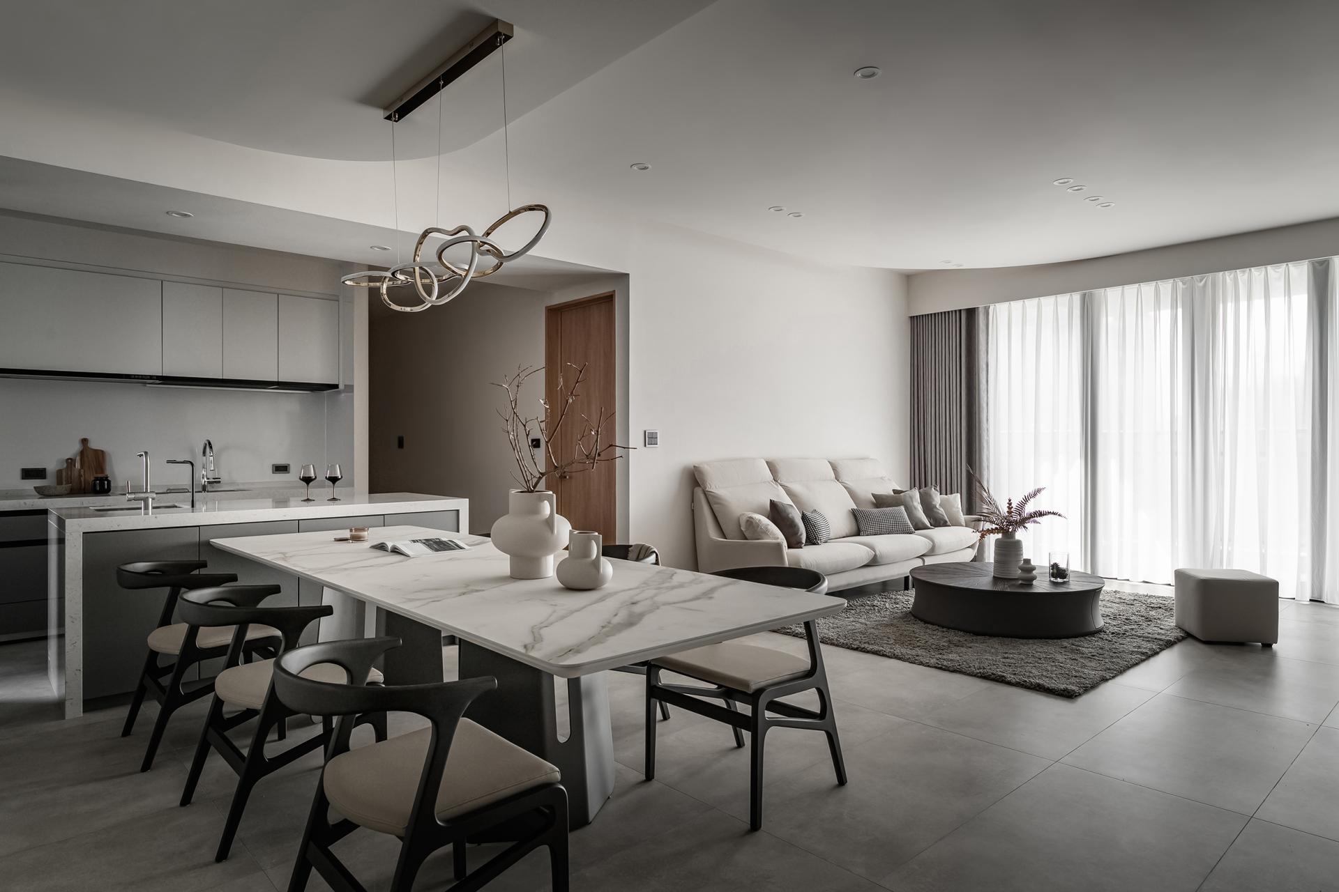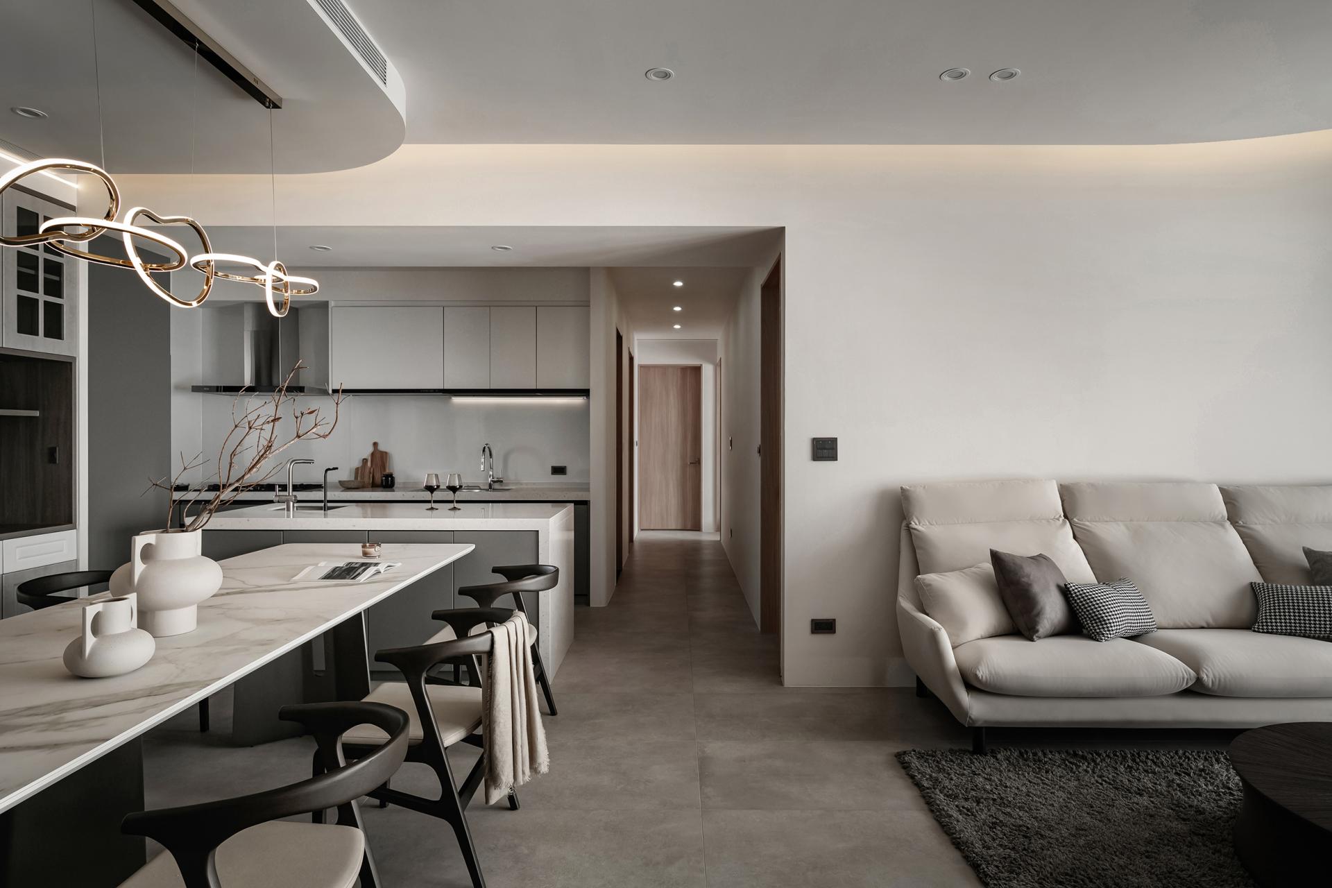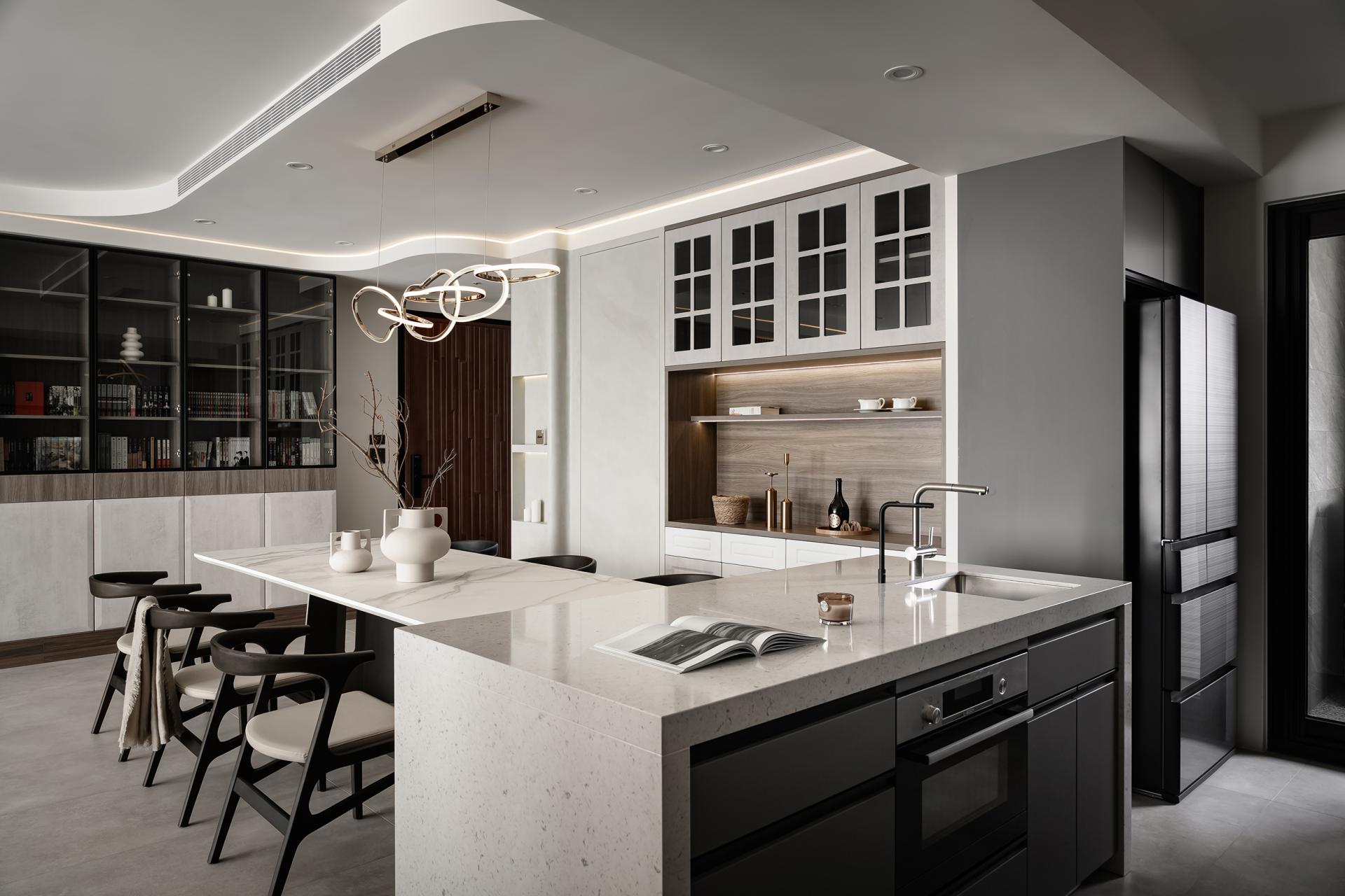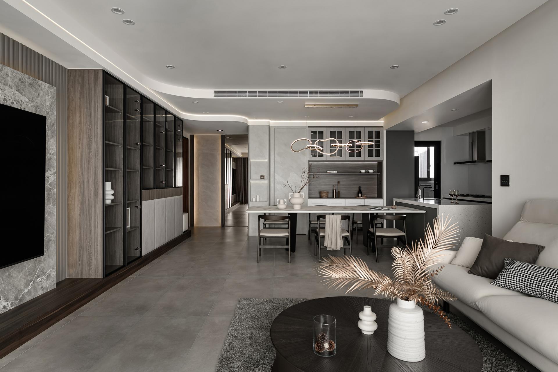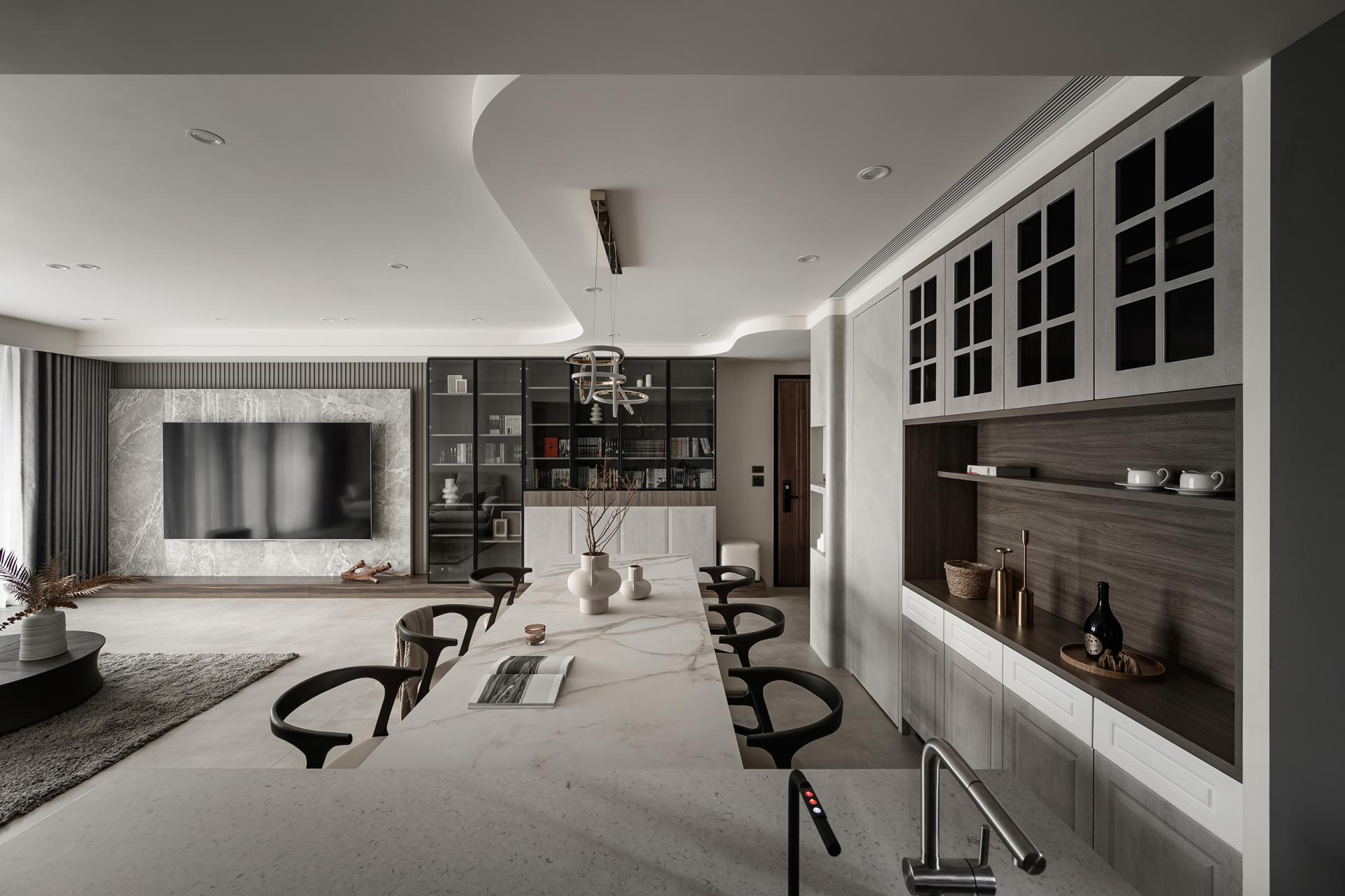 The homeowner, a senior executive in the tech industry, desired a space that reflected modern refinement and a calm, dignified presence. The designer centered the concept around crisp, sleek curved linear lighting to guide both the gaze and circulation. A custom-made large tile dining table, in dialogue with the expansive tiled TV wall, reinforces the overall simplicity and enhances the sense of scale and quality of living. The overall color scheme and circulation are orchestrated like a carefully cherished book—each chapter unfolding slowly to reveal the family’s meticulous attention to detail and the deep emotional connection they have with their life.