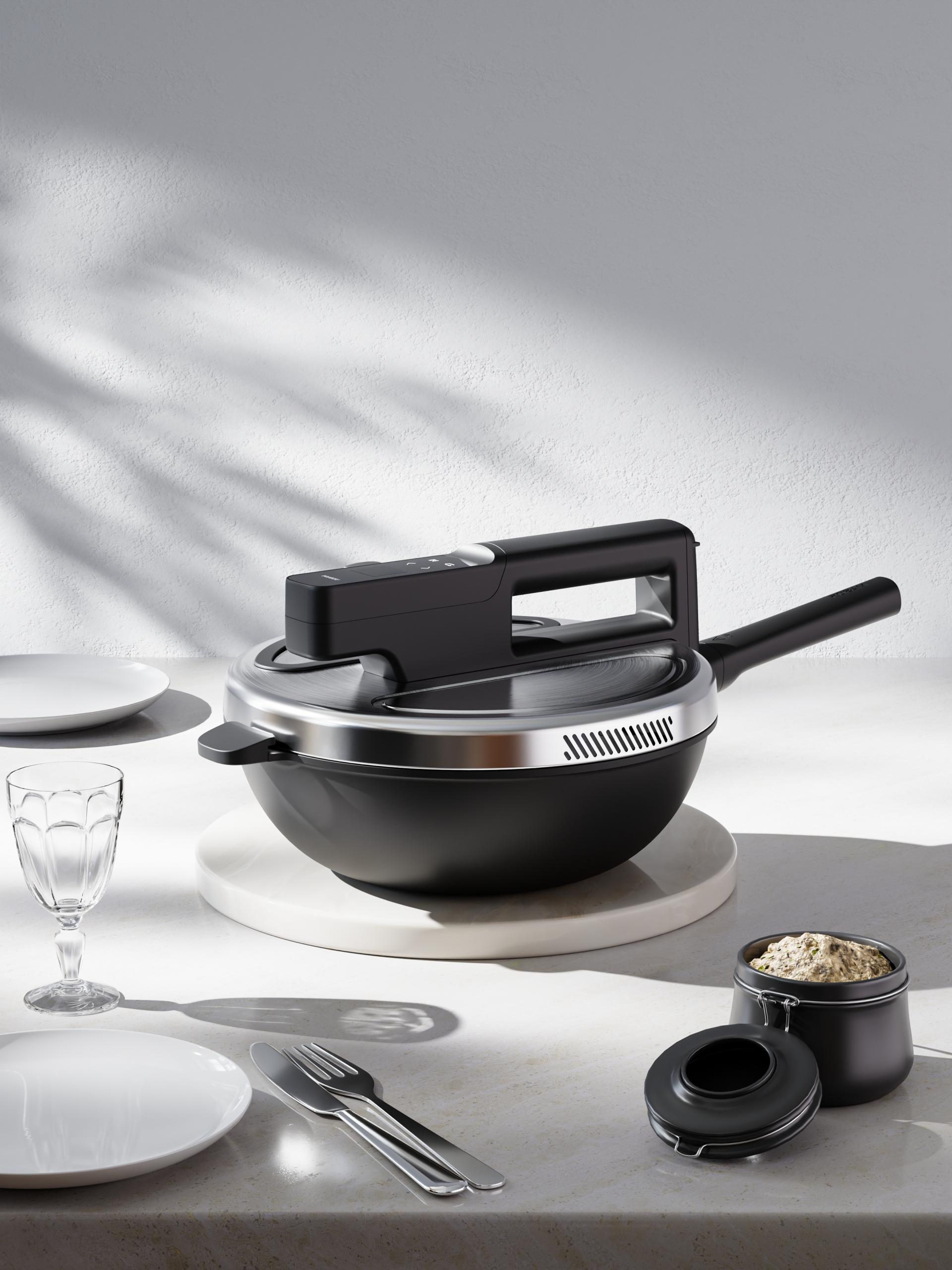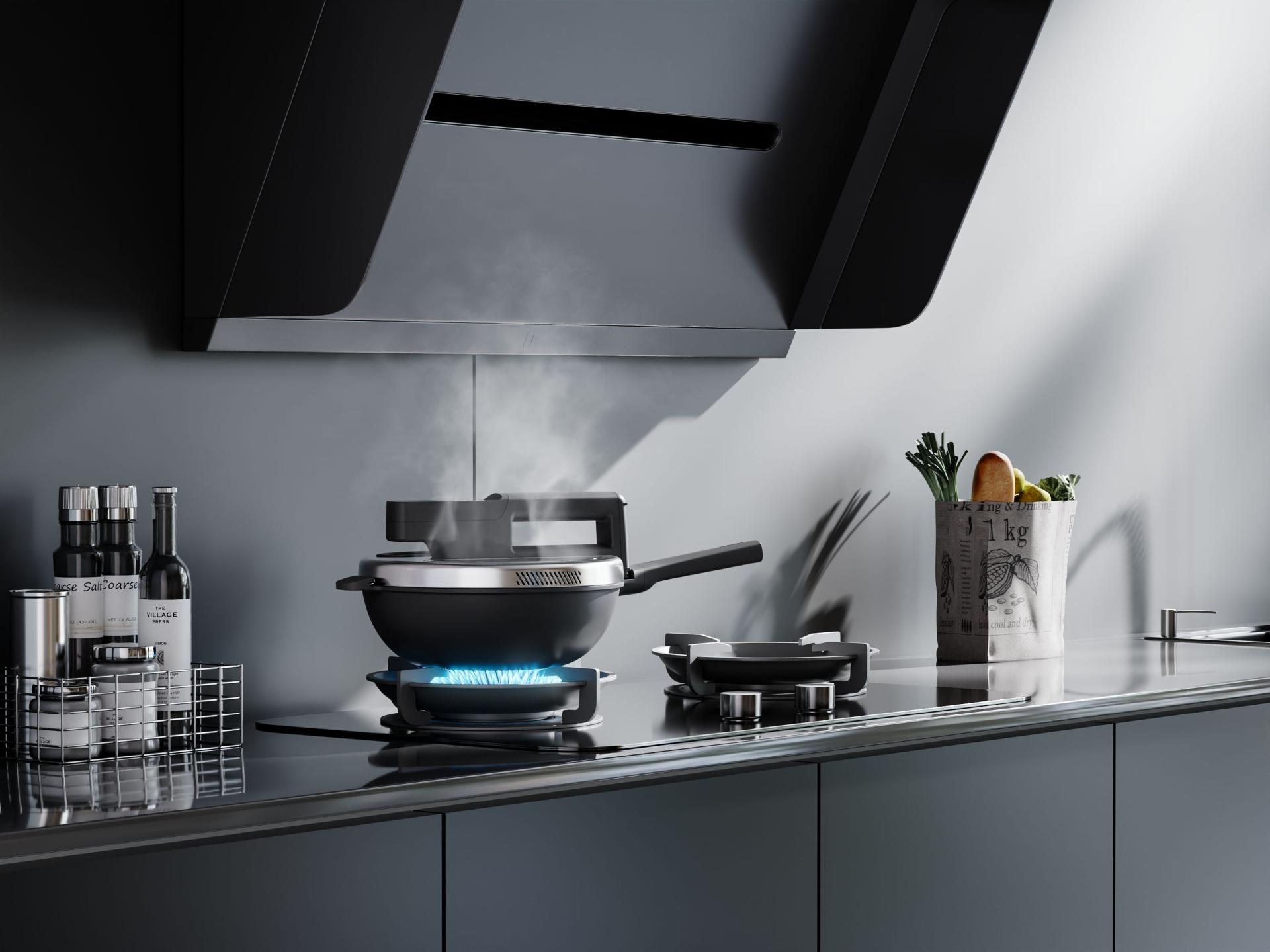 The key advantage lies in its open fire heating powered by gas. Unlike electric heating, gas-powered open fire heating delivers instant high temperatures for quick stir-frying to effectively lock in the authentic taste and aroma of ingredients, achieving wok hei in dishes; meanwhile, it allows more flexible heat control, empowering users to effortlessly explore diverse culinary creations. The design team has also established optimal temperature curves for different dishes through extensive experiments, and introduced them into the product. In this way, the stir-fryer equipped with intelligent temperature control technology ensures the best taste of every dish (crispy vegetables, crispy-outside-tender-inside meats, rich sauces, etc.) under precise temperature control. Moreover, it features full-process automation. The product employs the built-in temperature sensor to intelligently identify cooking phases, and synchronizes with the range hood and the stove to automatically adjust suction power and heat intensity, thus effectively alleviating pollution associated with cooking oil fume and contributing to a more intelligent kitchen.