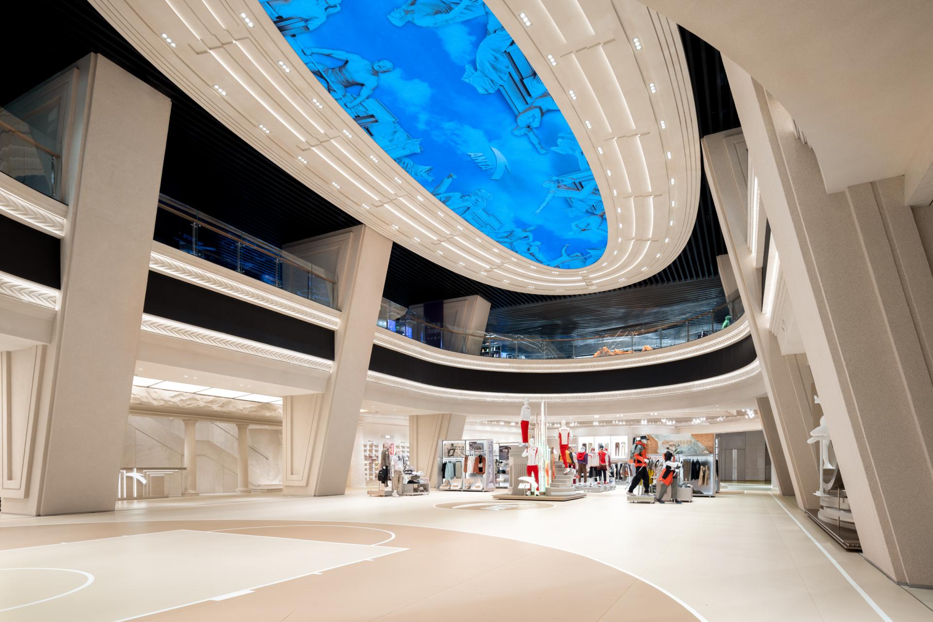 The design traces the origins of the competitive spirit, paying homage to classical athletics traditions through elements inspired by Greek arenas, Roman Colosseum, and Olympic flame installations. To improve the overall space experience, it integrates sports and retail through a dual-scenario dynamic interaction system. The atrium preserves an authentic basketball court design, enhancing both competitive attributes and shopping experiences for optimal functionality. A theater-inspired loop layout, with an Olympic flame installation as a centerpiece, intuitively guides circular exploration. Dedicated zones for men’s, women’s, and children’s products, along with fitting rooms, showers, and athlete preparation areas, meet consumers’ diverse needs, ensuring a more enjoyable shopping experience.