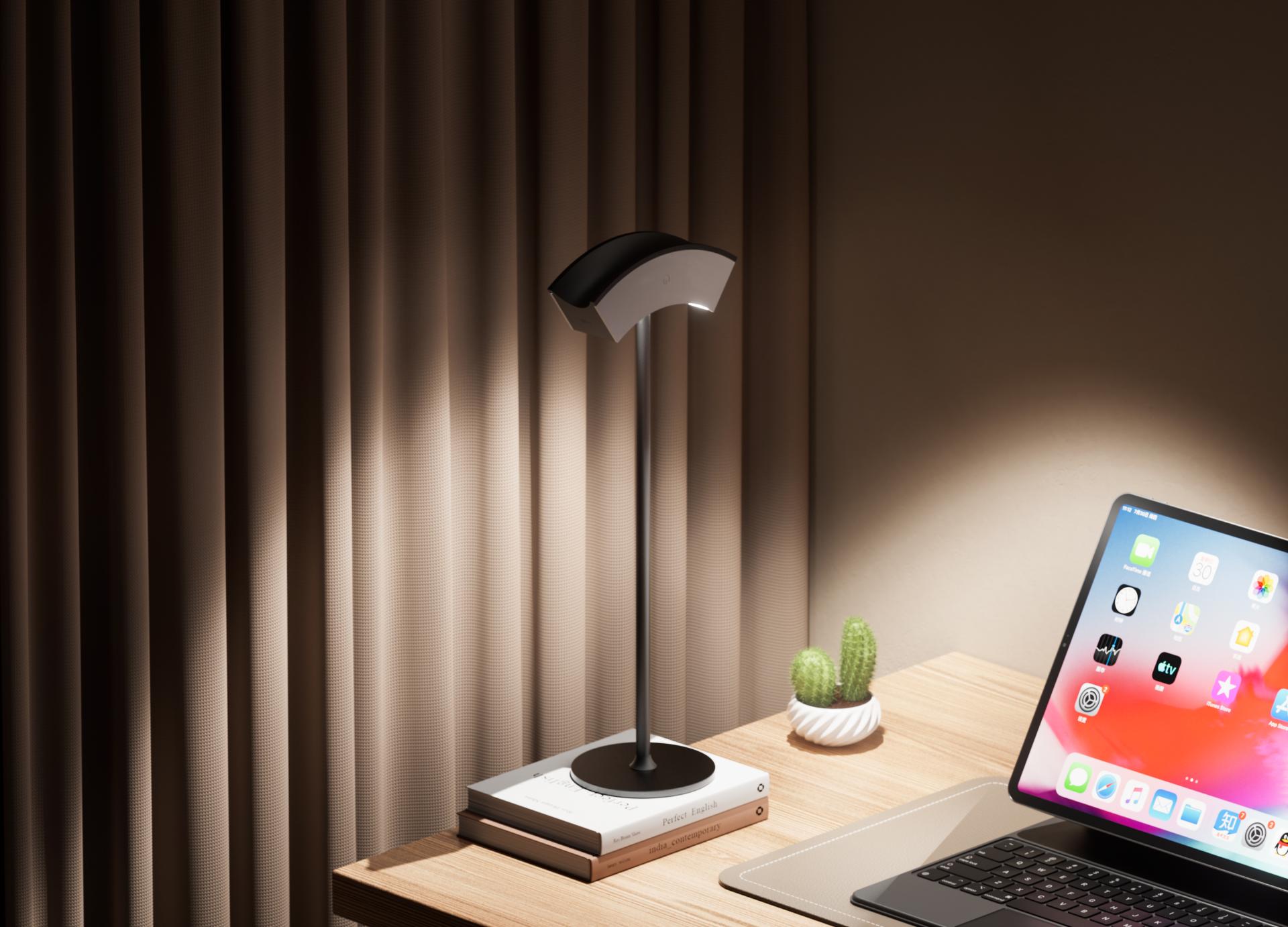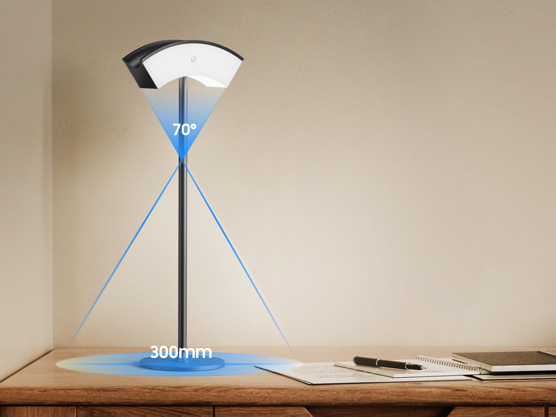 The curved head, inspired by the gentle crescent moon in the night sky, creates a warm, comfortable home atmosphere. Such a versatile and practical design also allows users to flexibly store small items like headphones and cables, effectively improving the utilization of desktop space; meanwhile, it forms an angle of 70° to achieve more concentrated light, and can evenly illuminate an area of about 300mm wide, so as to provide users with a clearer view. Thanks to its meticulously designed height, the product ensures that users will not directly see the light source when sitting, which, paired with the flicker-free, low-blue LED light, offers a more eye-protecting and comfortable experience.