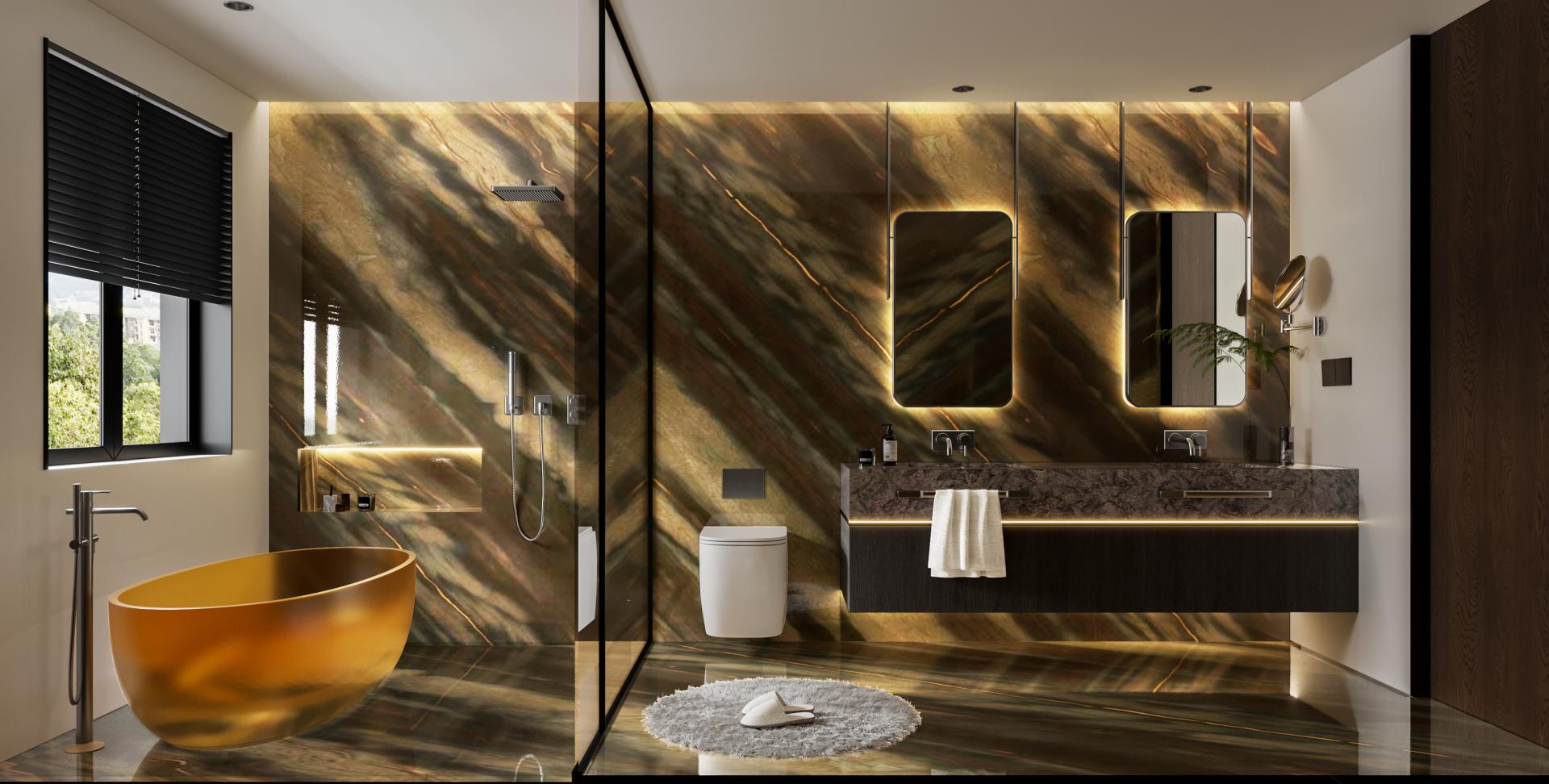 The villa’s functional areas are thoughtfully designed to enhance both aesthetics and practicality. The entrance hall makes a bold statement with warm lighting and luxury stone cabinets, creating a welcoming atmosphere. The open-plan living room, with its large windows and seamless connection to the outdoors, maximizes natural light and spatial depth. The kitchen, featuring custom cabinetry and smart appliances, serves as both a functional and social hub. The master suite, complete with panoramic views and smart lighting systems, provides an ideal retreat.