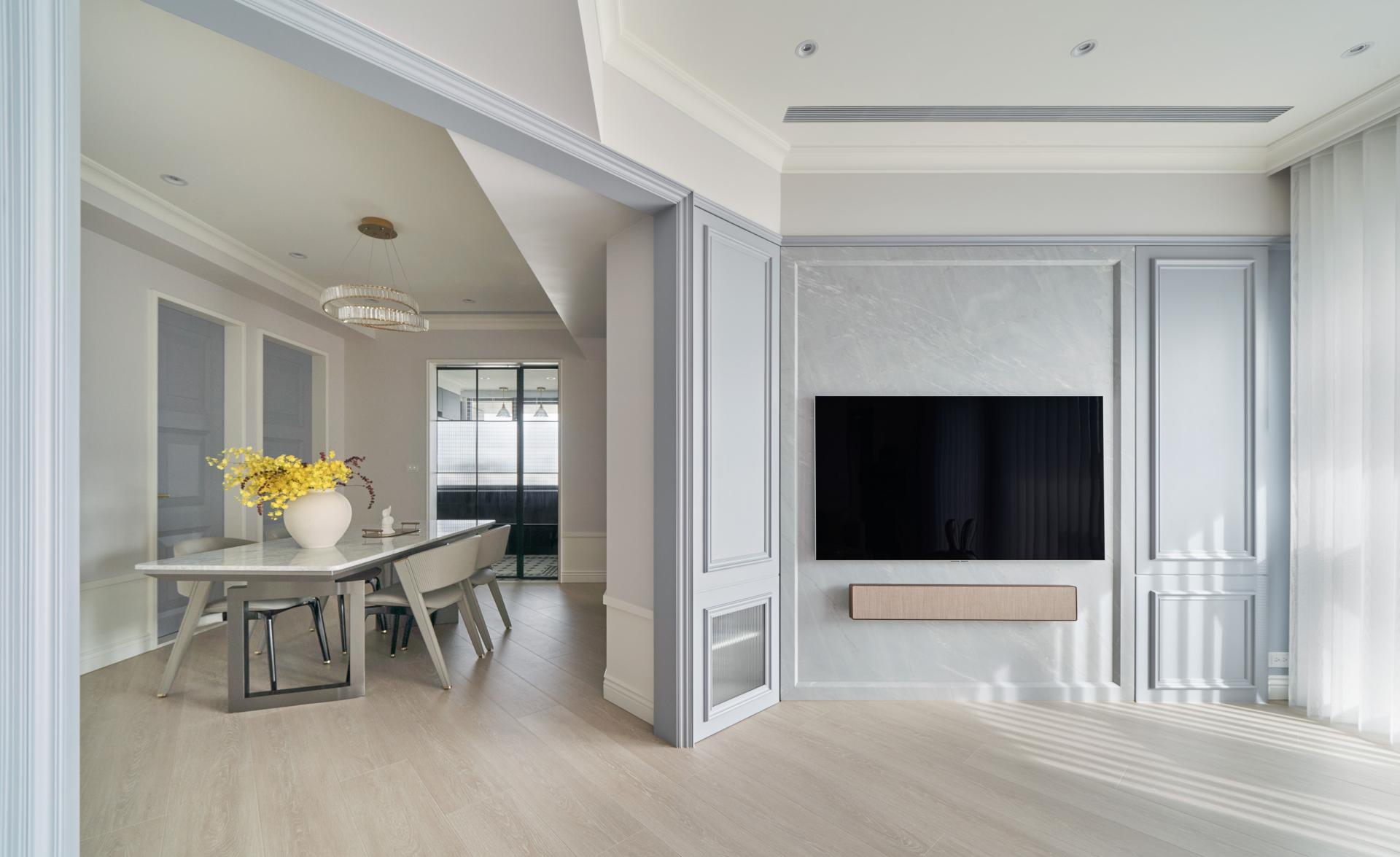元素,點綴豐富整個空間;主題電視牆使用自然仿古面的大理石/富貴金沙,搭配的茶几則是