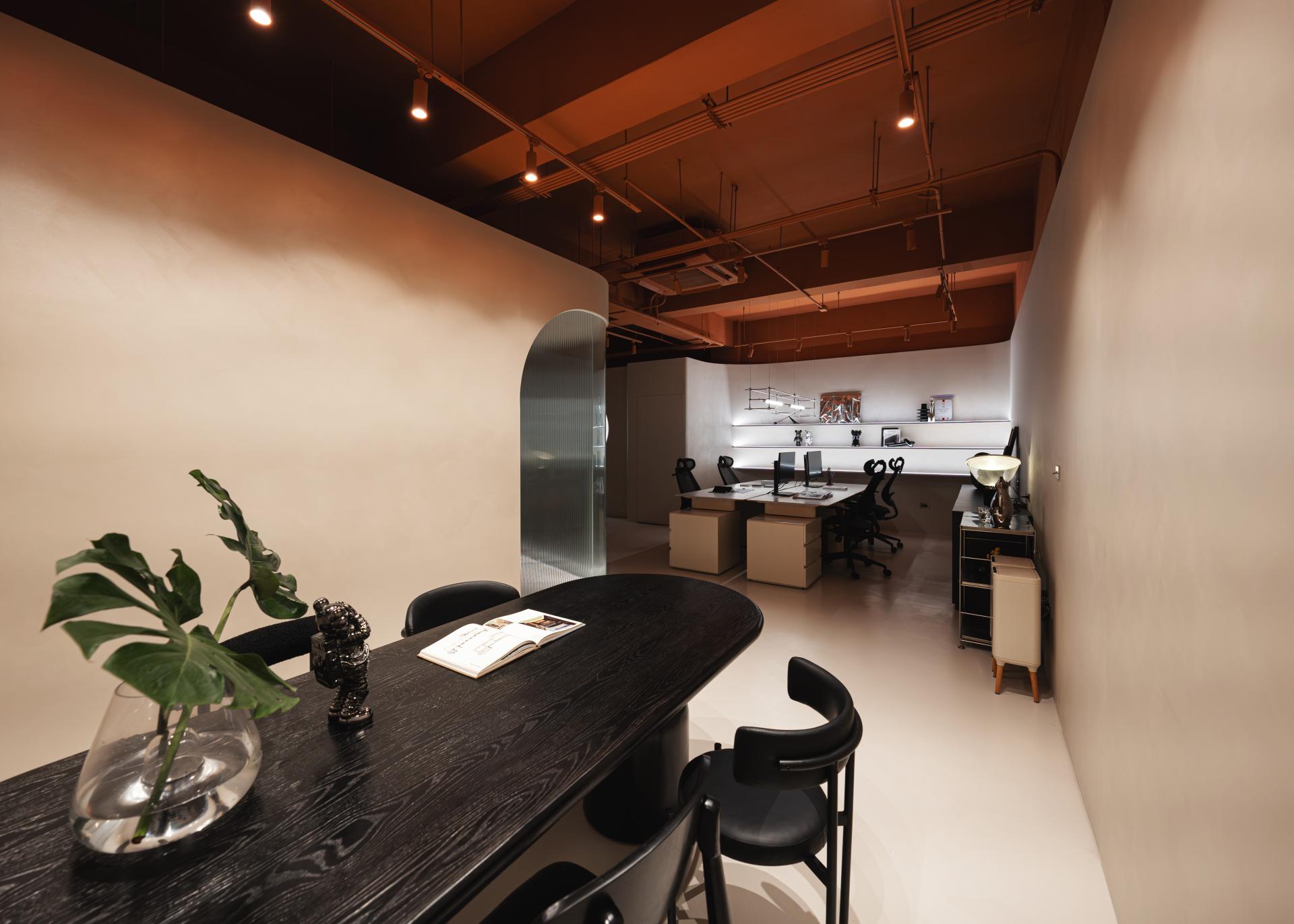 A transparent glass façade softens the natural light as it streams evenly into the hair salon near the entrance, seamlessly transitioning into the coexisting interior design studio. The space achieves a balance between openness and privacy, with carefully curated negative space and rounded-edge furnishings enhancing the perception of detail and creating a sense of ease in both daily styling and design work.