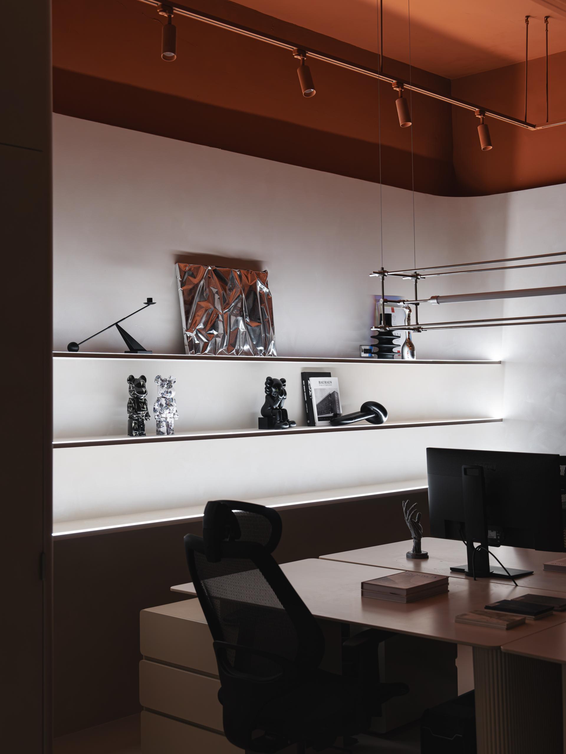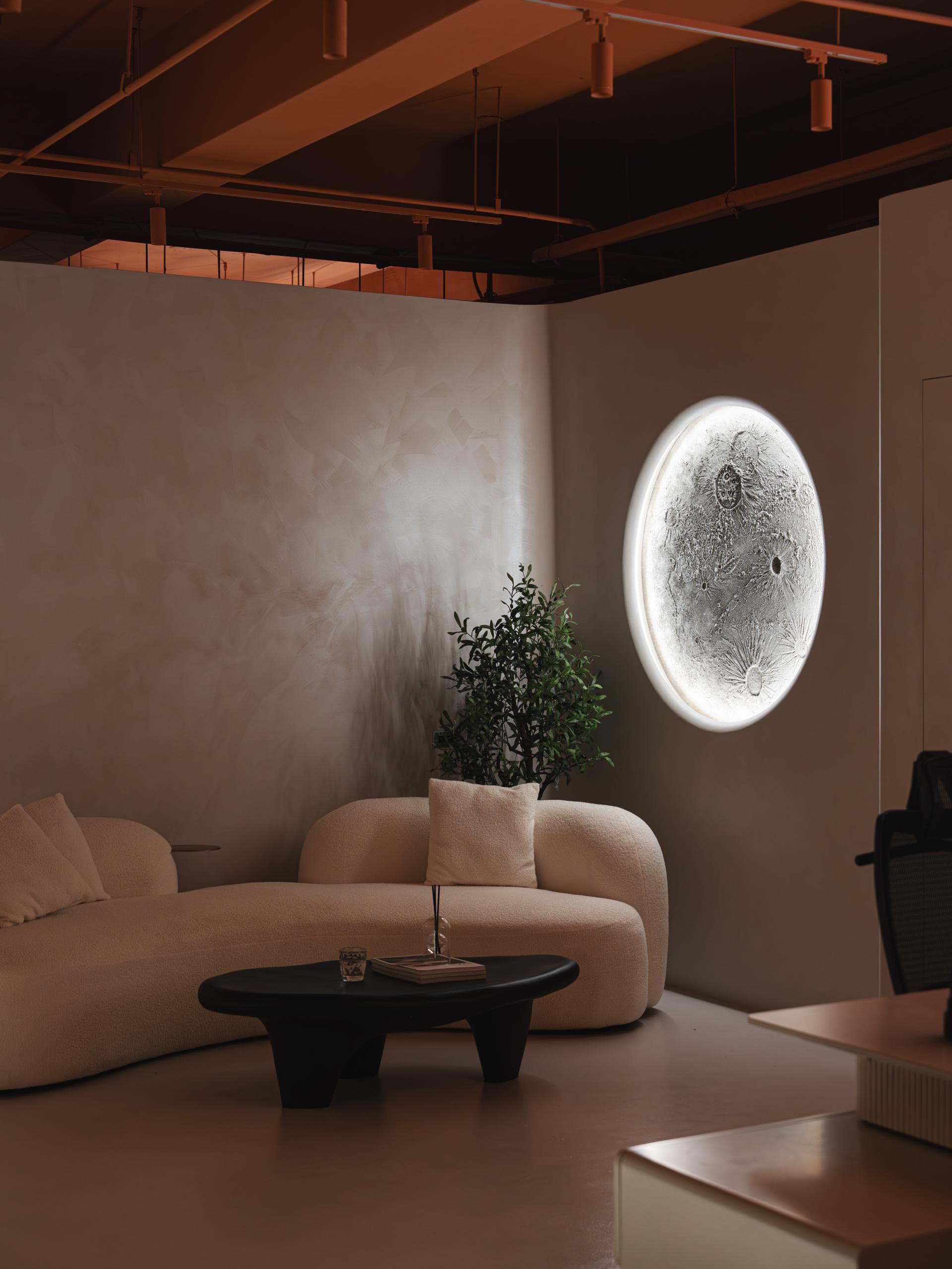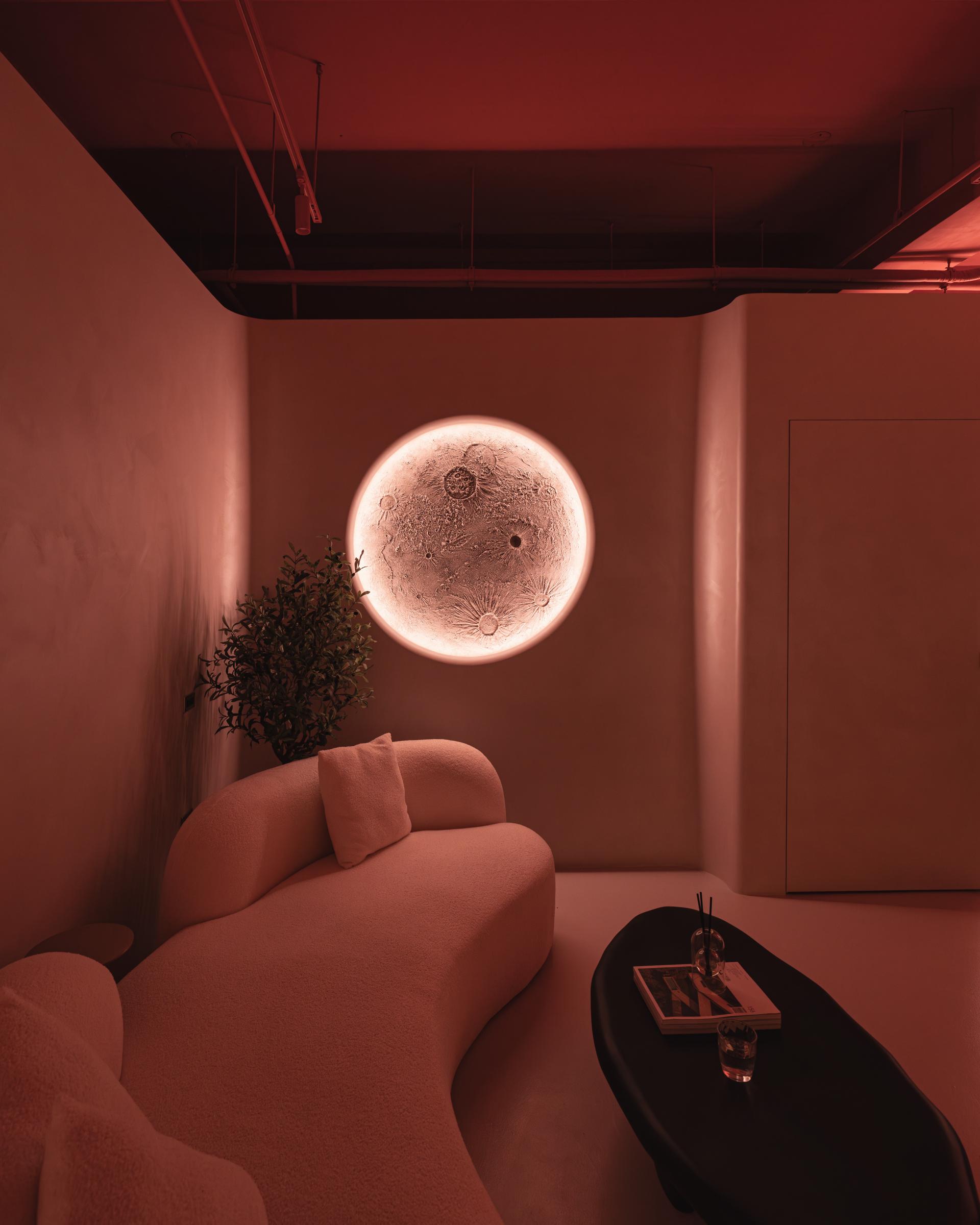 The hair salon and Interior design studio are harmonized within a single threshold, crafting a layered visual experience that brings depth and dimension. This embodies a unique aesthetic craftsmanship, much like the moon on the studio’s meeting room wall—reflecting the passage of time and emotions while symbolizing the enduring commitment to vocation, steadfast as the moon’s ever-present glow. The fusion of technical expertise and profound aesthetic sensibilities between the two businesses transforms the workspace beyond mere function, shaping a distinctive urban landscape.