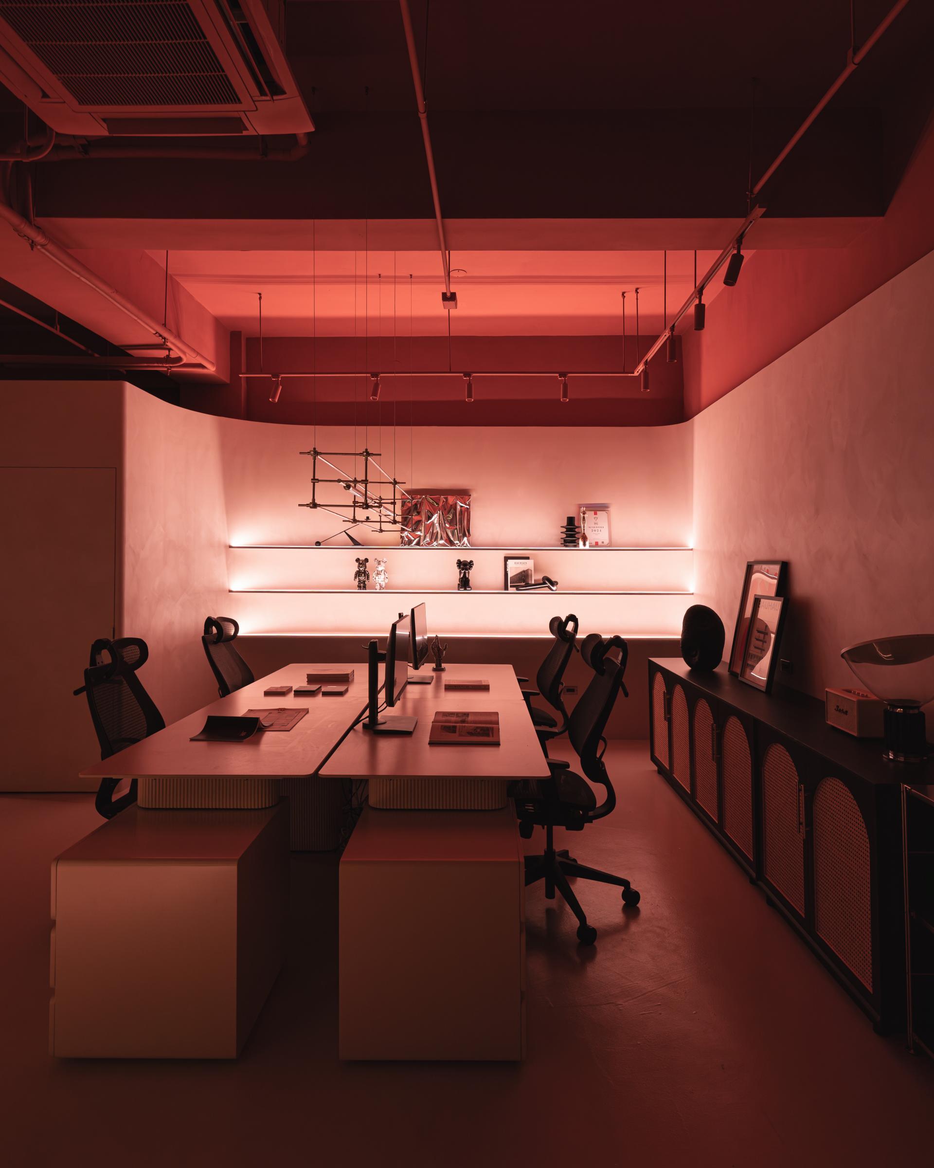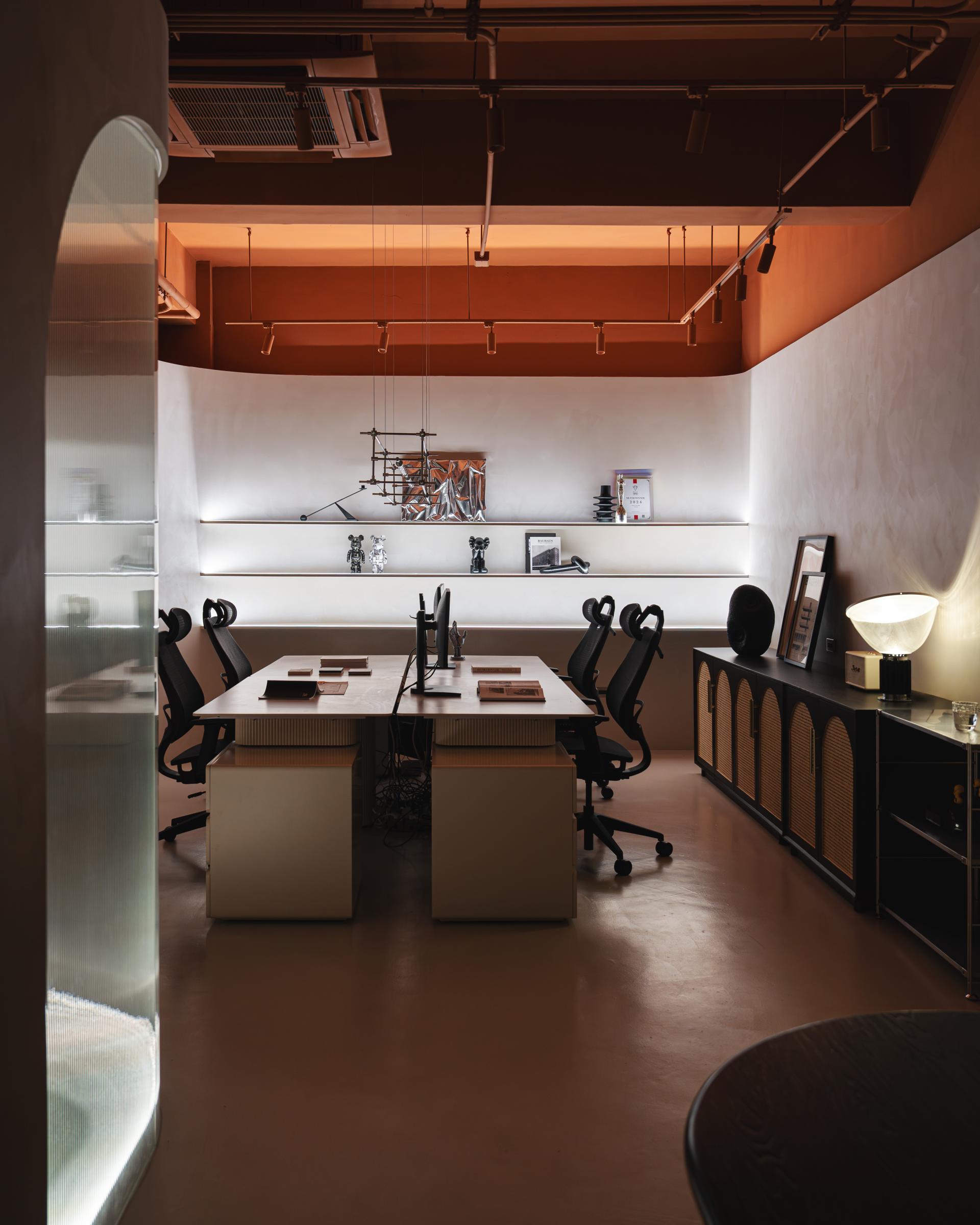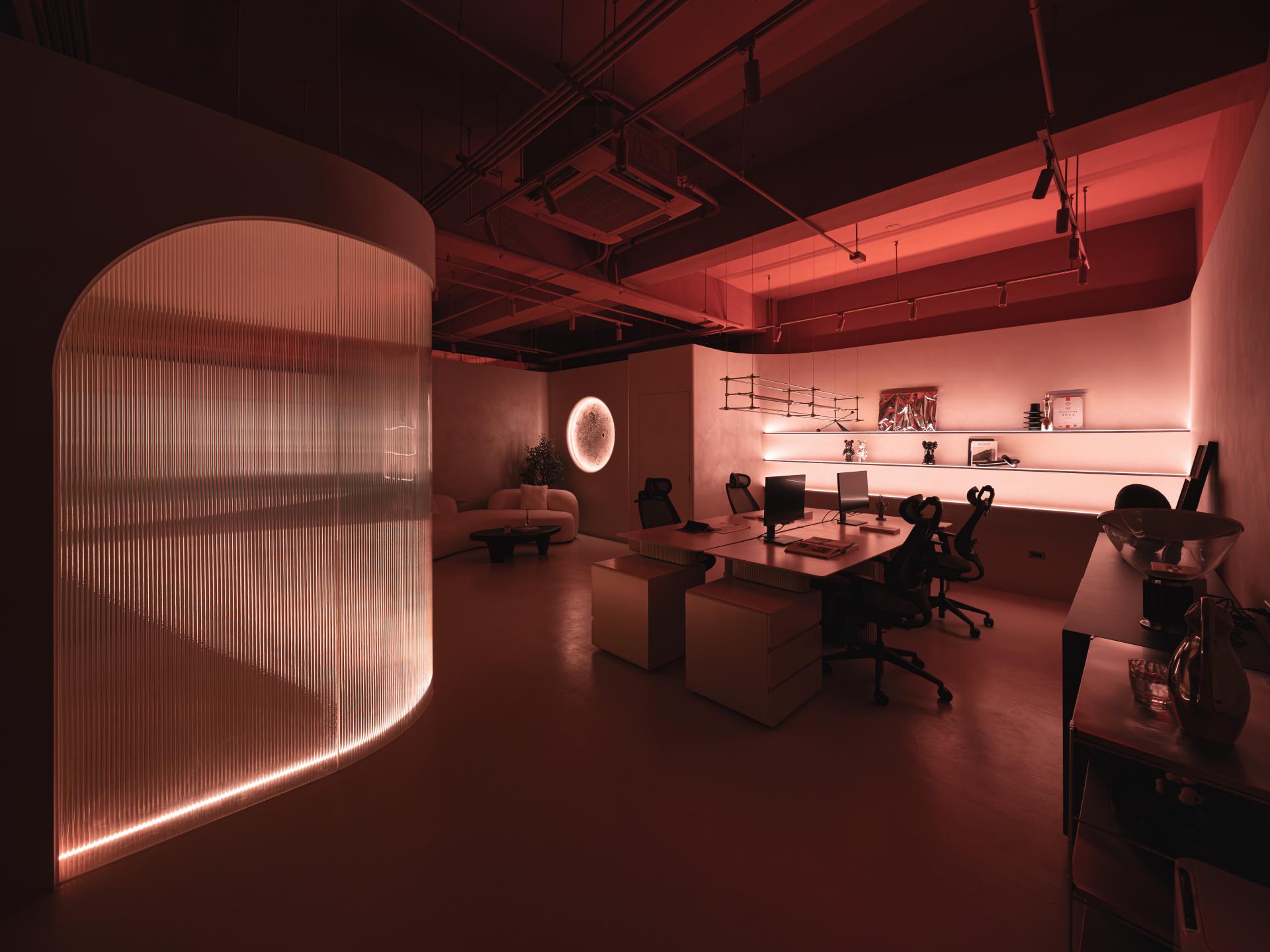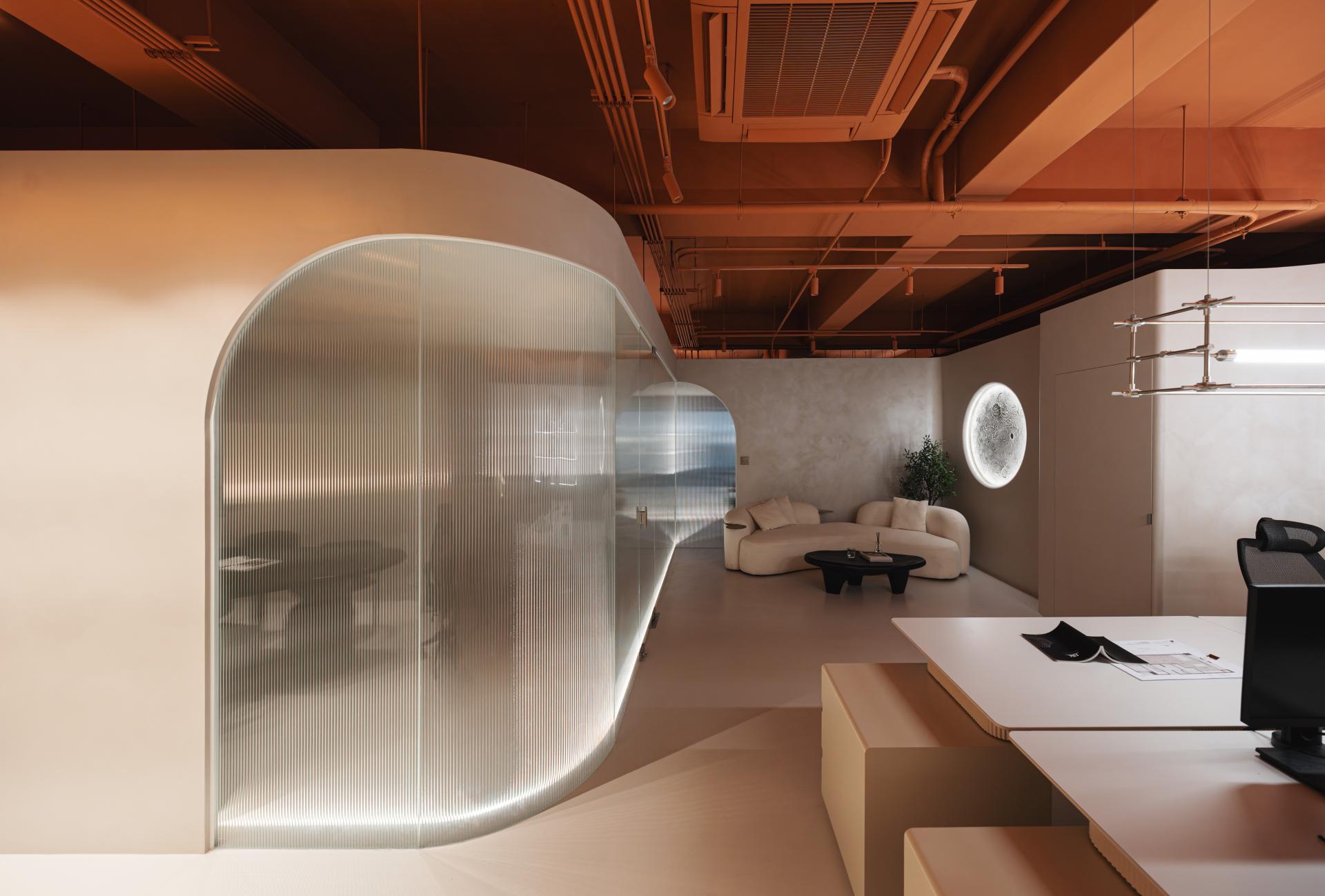 A straightforward yet orderly pipeline structure integrates with streamlined, multi-layered curved walls, softening rigid spatial boundaries and ensuring fluid movement throughout. Embedded warm-toned linear lighting enhances the overall comfort, harmonizing brightness and shadow. The space is imbued with a muted, grayish-beige tone—striking a balance between focused work and creative inspiration.