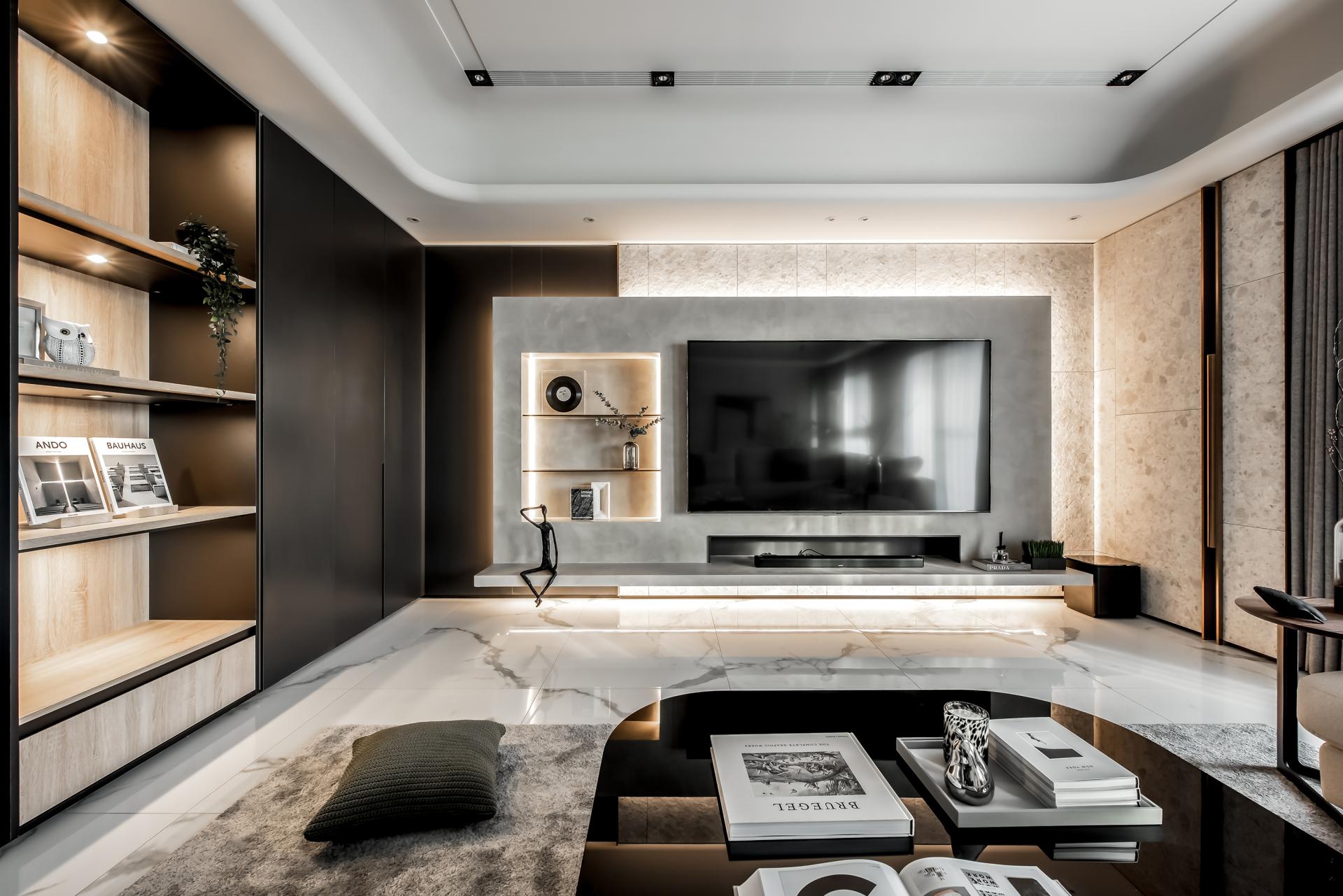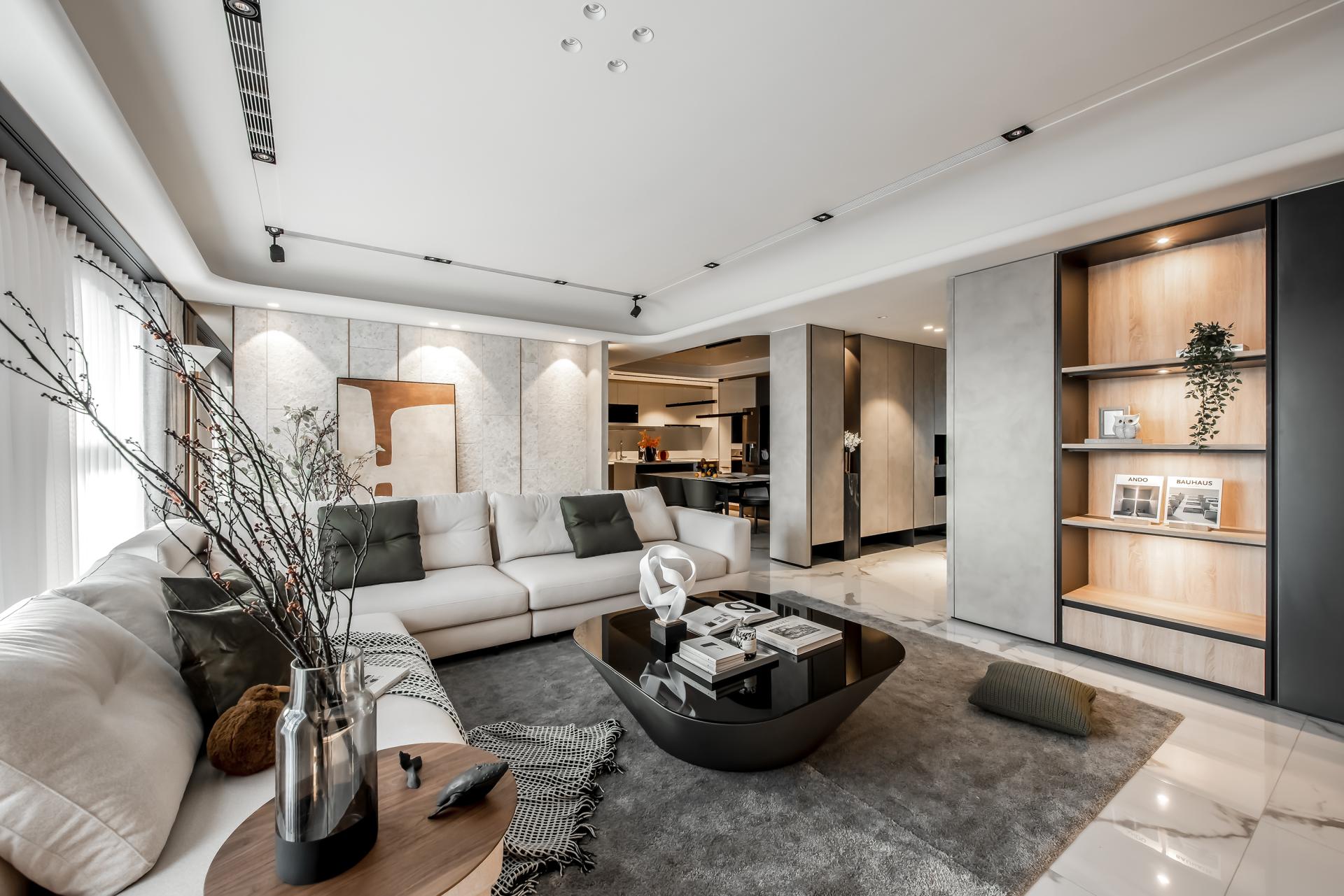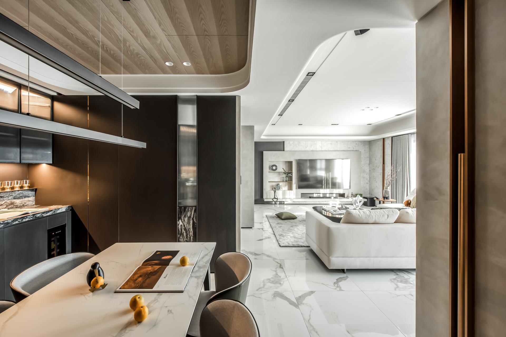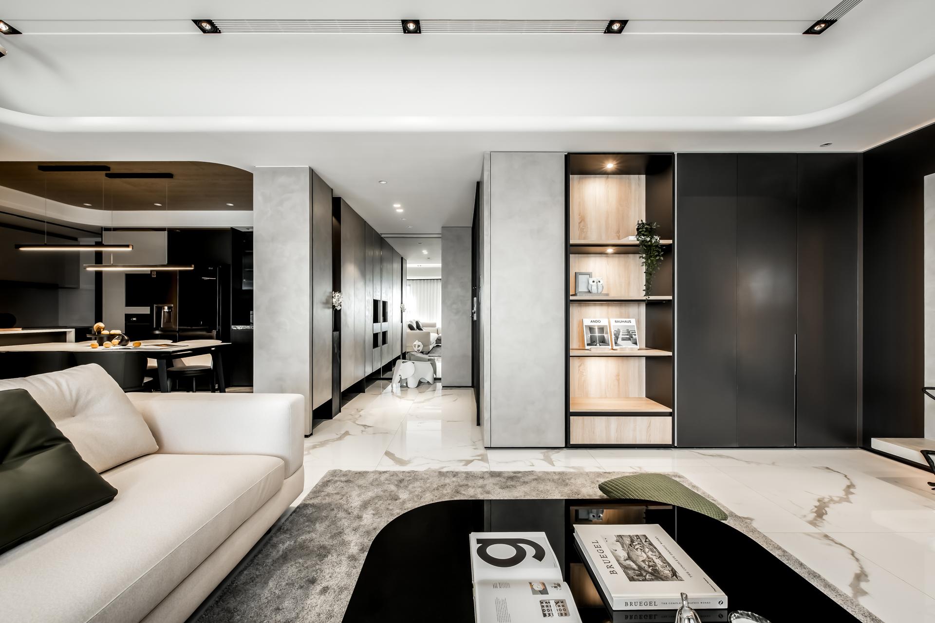Monochromatic black, white, and gray palettes permeate the project and narrate the homeowner’s preference for a calm, understated aesthetic. The living room floors are uniformly clad in gray and white stone-patterned tiles, while the double-layered TV wall features beige decorative paint on the upper slab and terrazzo below. The dark cabinetry with wood-toned open shelves echoes the black coffee table featuring an inverted trapezoidal shape and the beige sofa in between, creating a warm and inviting living space. Moreover, subtle titanium-plated metal elements eliminate any sense of monotony. As the heart of the home, the dining area enhances affection converge. The work team had embellished the ceiling with natural wood veneers that harmonized with the stone tabletop and performed a contrast of warmth and coolness, cultivating a cozy and brilliant ambiance.
